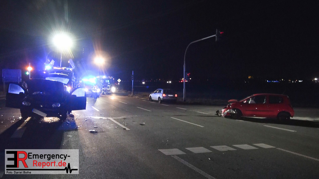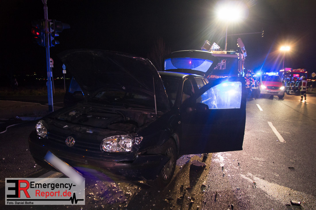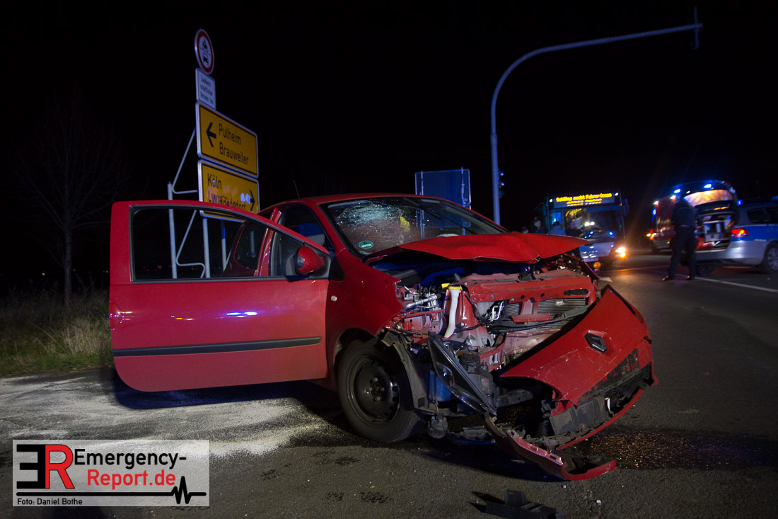 Am 08.12.2015 kam es gegen 17:30 Uhr auf der Kreuzung Brauweilerstraße/Lisa-Meintner-Ring zu einem Verkehrsunfall zwischen zwei PKW. Aus bislang ungeklärter Ursache stießen die beiden Fahrzeuge im Kreuzungsbereich zusammen. Hierbei wurden 4 Personen verletzt. Diese wurden durch den Rettungsdienst versorgt und in Krankenhäuser transportiert. Die Feuerwehr streute ausgelaufene Betriebsmittel ab und leuchtete die Einsatzstelle aus.