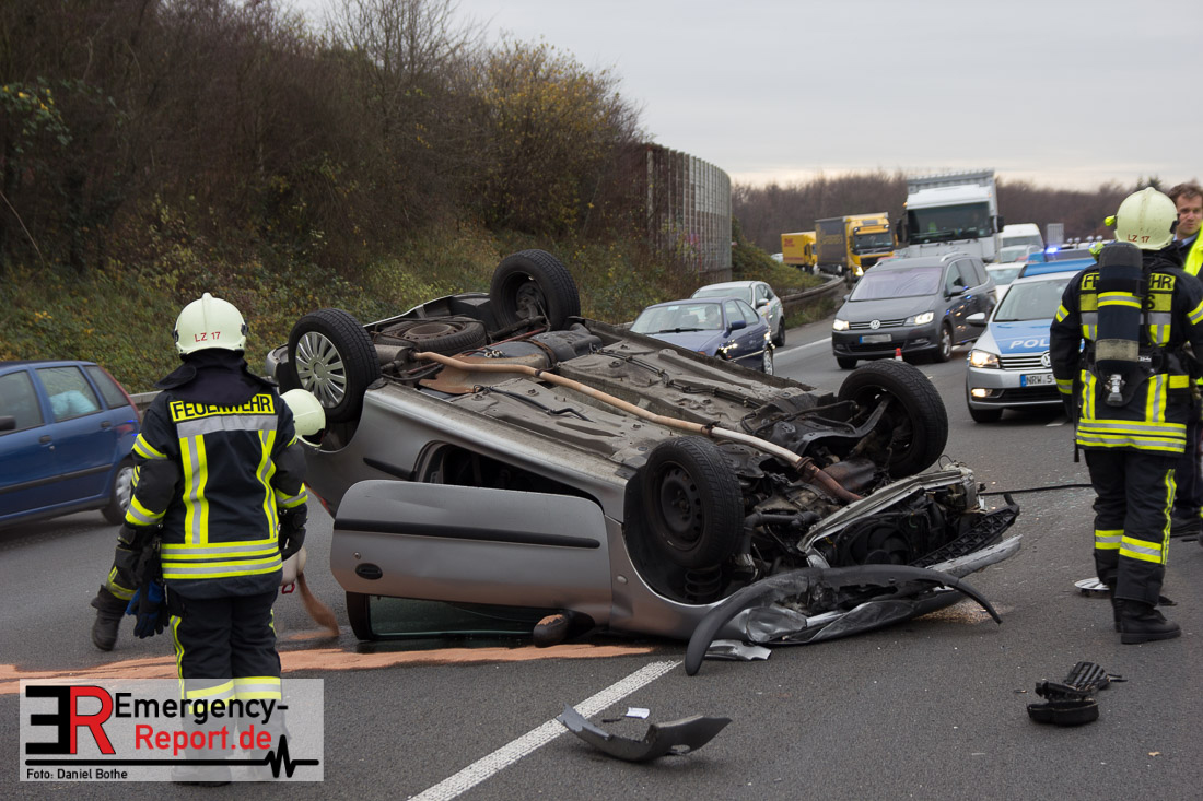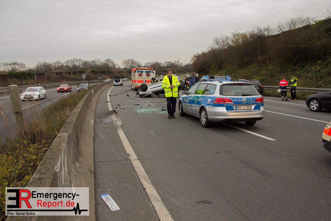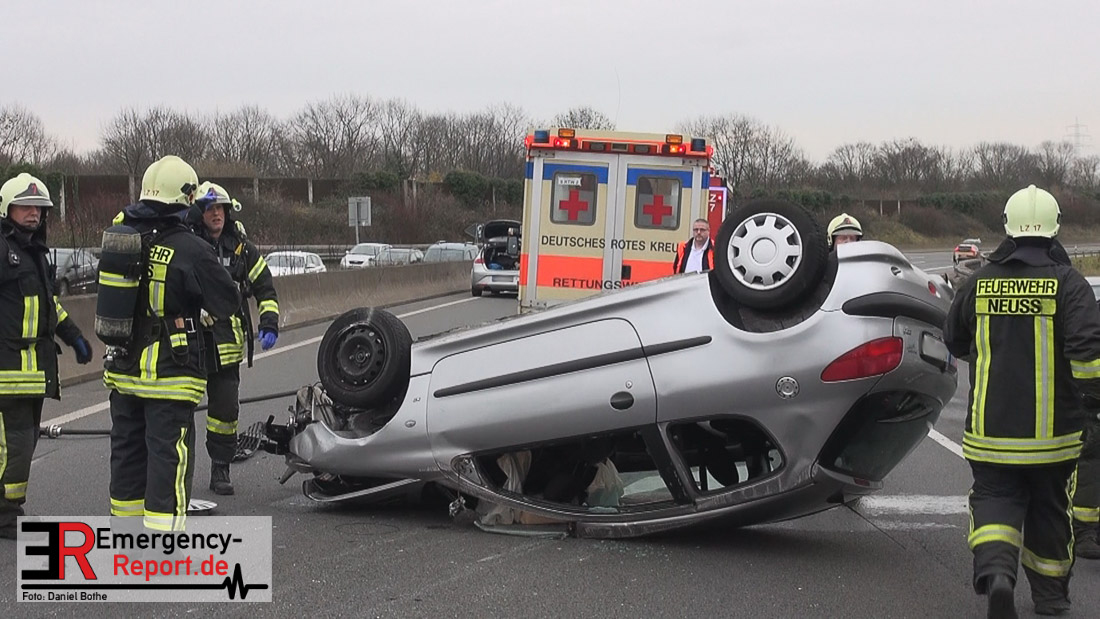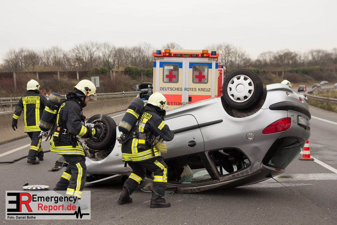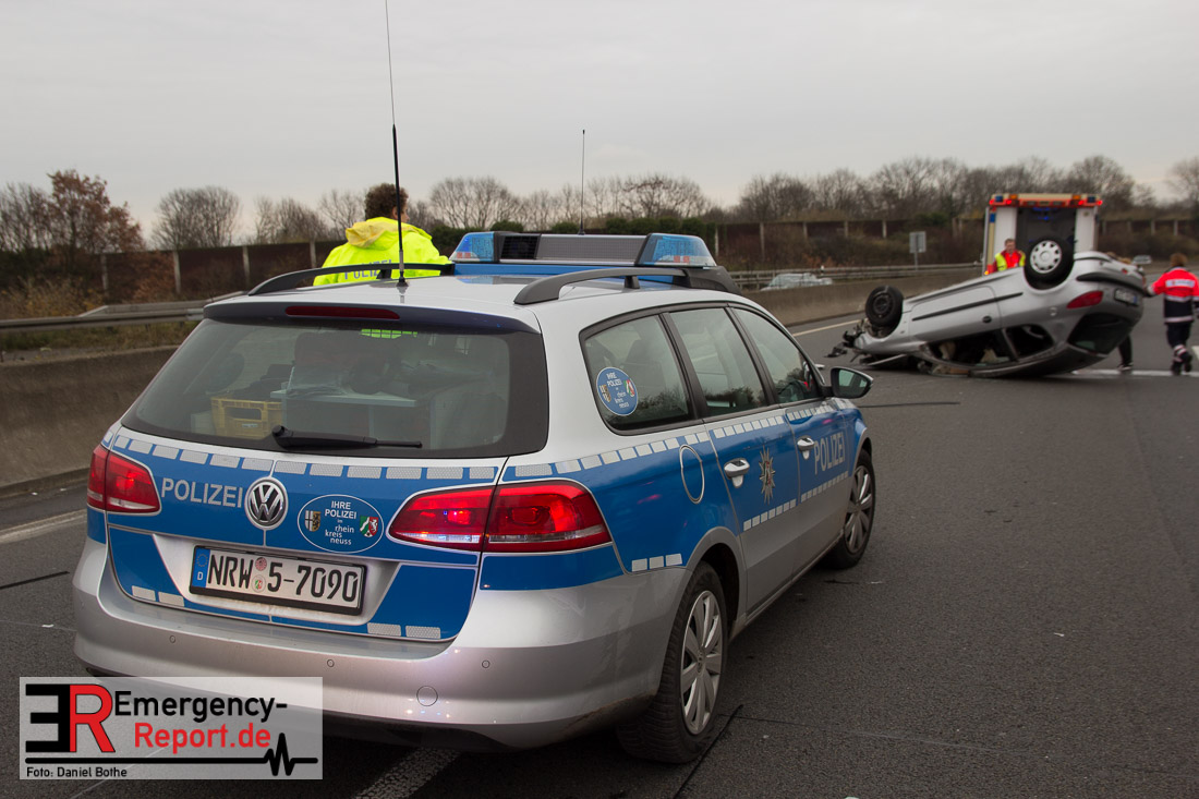 Am Samstagmittag, den 12.12.2015, kam es gegen 14 Uhr zu einem Verkehrsunfall auf der A57 in Fahrtrichtung Köln. Zwei PKW waren aus bislang ungeklärter Ursache, zwischen den Anschlusstellen Neuss-Hafen und Neuss-Norf, miteinander kollidiert. Ein PKW schleuderte in die mittlere Betonbegrenzung, überschlug sich, und blieb auf dem Dach liegen. Die Feuerwehr nahm auslaufende Betriebsmittel auf. Verletzt wurde glücklicherweise niemand.
