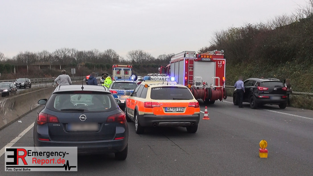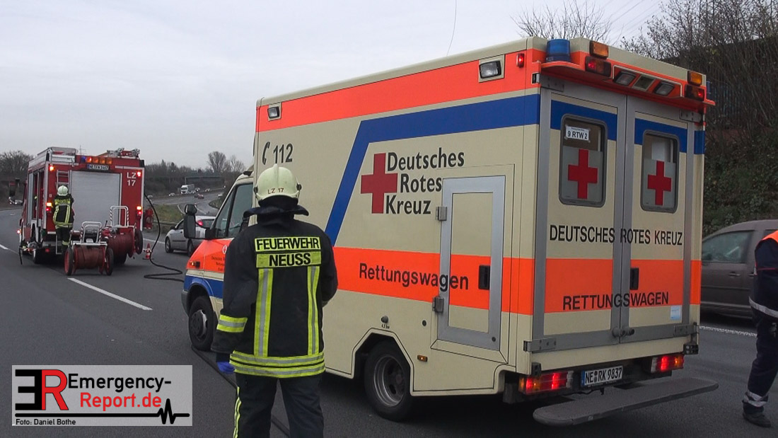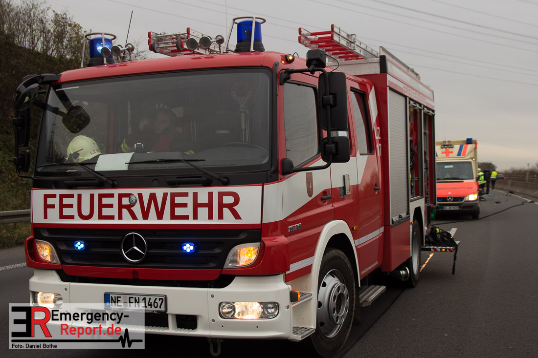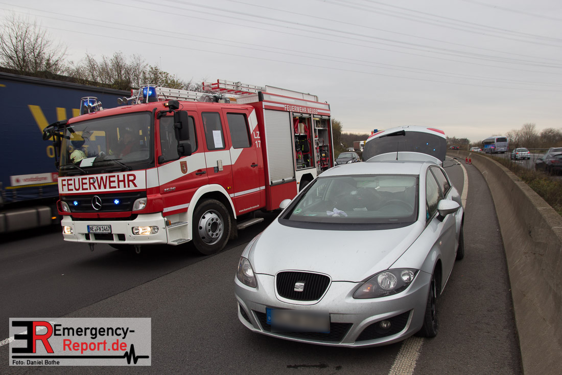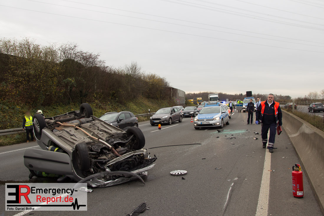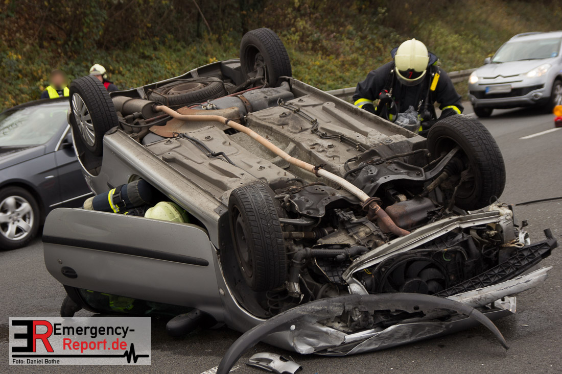 Am Samstagmittag, den 12.12.2015, kam es gegen 14 Uhr zu einem Verkehrsunfall auf der A57 in Fahrtrichtung Köln. Zwei PKW waren aus bislang ungeklärter Ursache, zwischen den Anschlusstellen Neuss-Hafen und Neuss-Norf, miteinander kollidiert. Ein PKW schleuderte in die mittlere Betonbegrenzung, überschlug sich, und blieb auf dem Dach liegen. Die Feuerwehr nahm auslaufende Betriebsmittel auf. Verletzt wurde glücklicherweise niemand.
