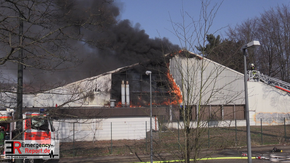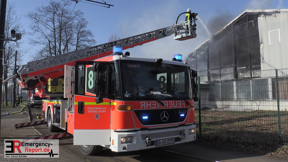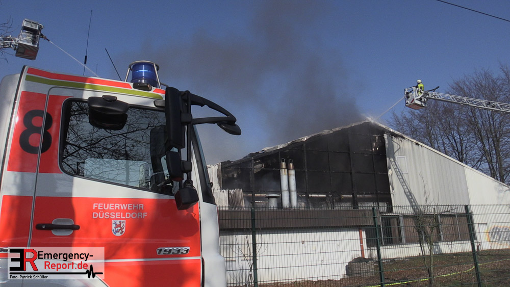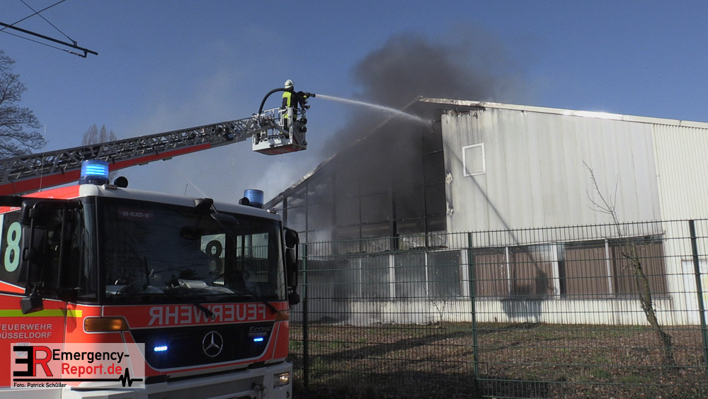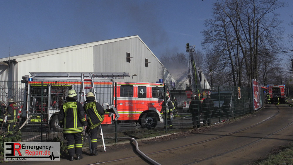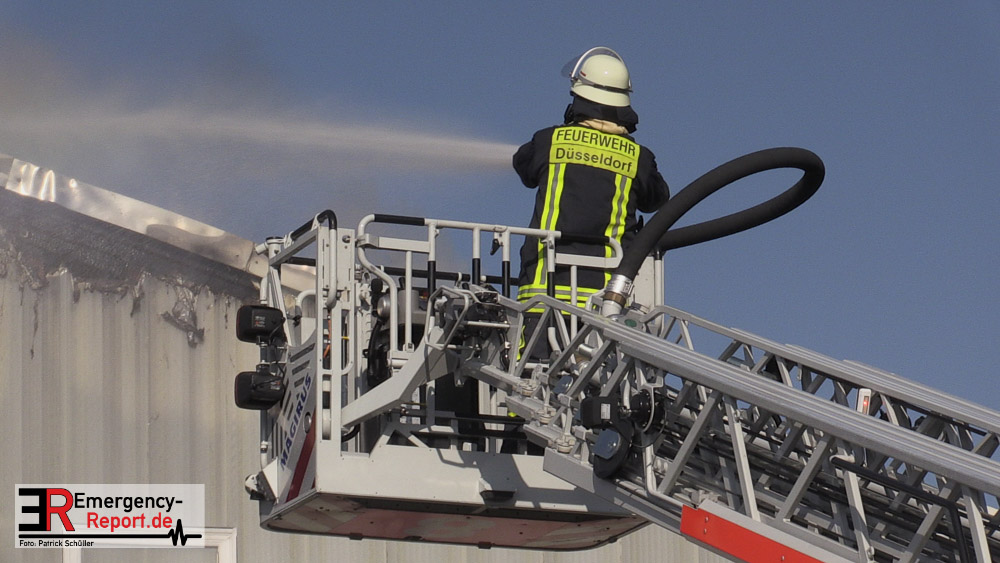 Die dort arbeitenden Dachdecker alarmierten die Feuerwehr und versuchten das Feuer mit eigenen Löschgeräten zu löschen. Hierbei verletzte sich ein Dachdecker leicht. Er wurde ambulant durch den Notarzt der Feuerwehr behandelt. Aufgrund der gemeldeten „Brennenden Halle“ wurden zwei Löschzüge zur Einsatzstelle entsandt, sowie ein weiterer Löschzug, nachdem zahlreiche telefonische Meldungen eingingen. Mit zwei Wenderohren und zwei C-Rohren wurde das Feuer gelöscht. Anschließend wurden fünf Hochleistungslüfter eingesetzt um die Halle rauchfrei zu machen. Die Einsatzstelle wurde weiträumig abgesperrt. Auch die Rheinbahn war hiervon betroffen.