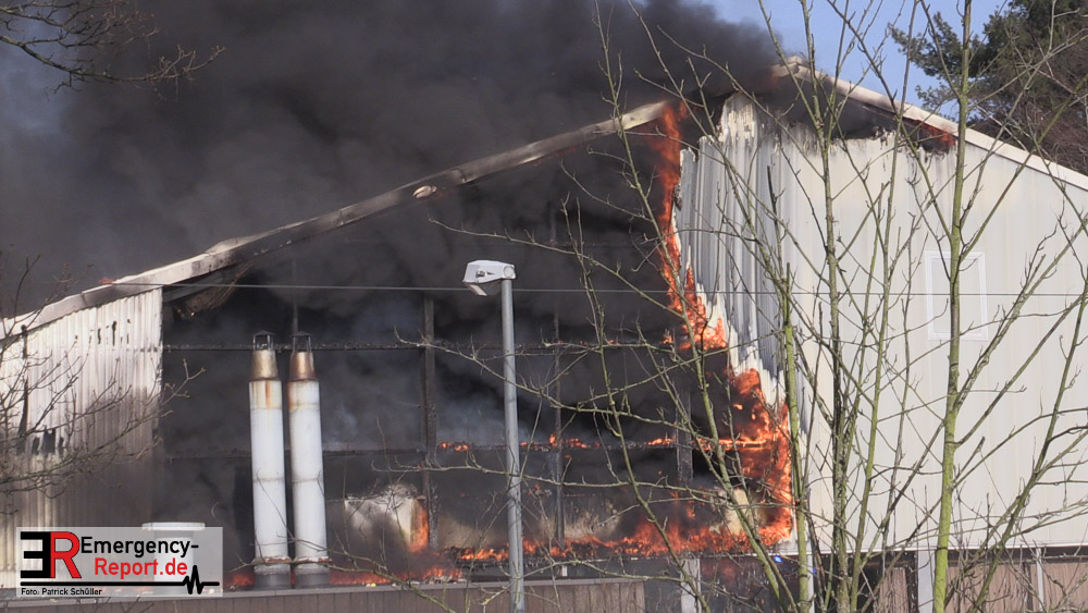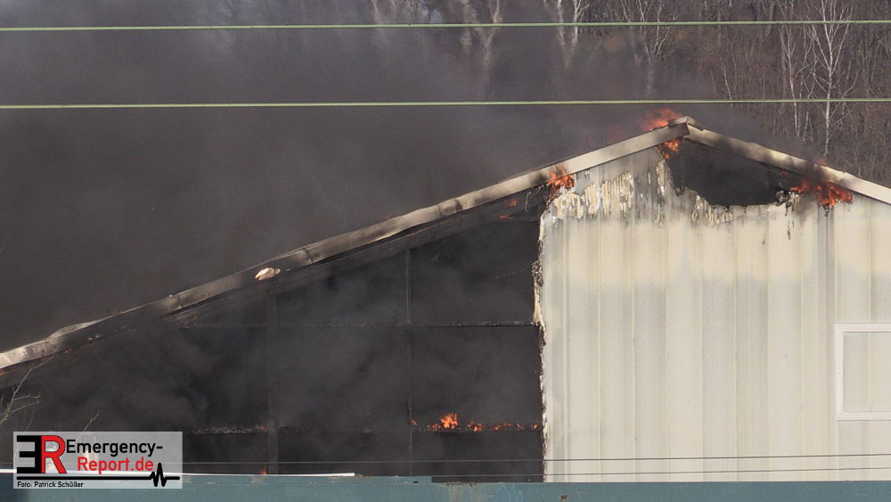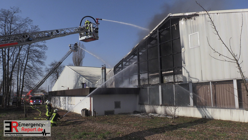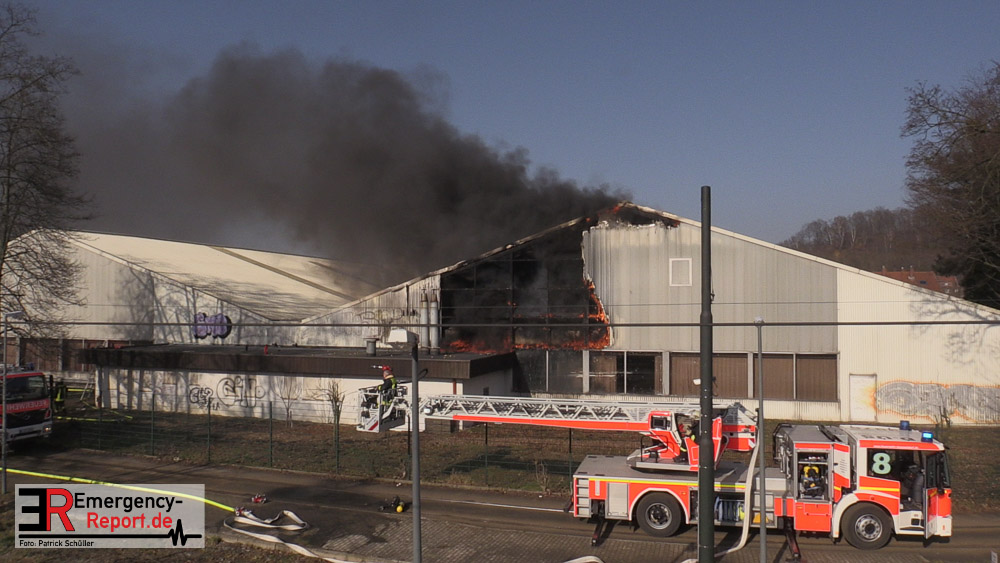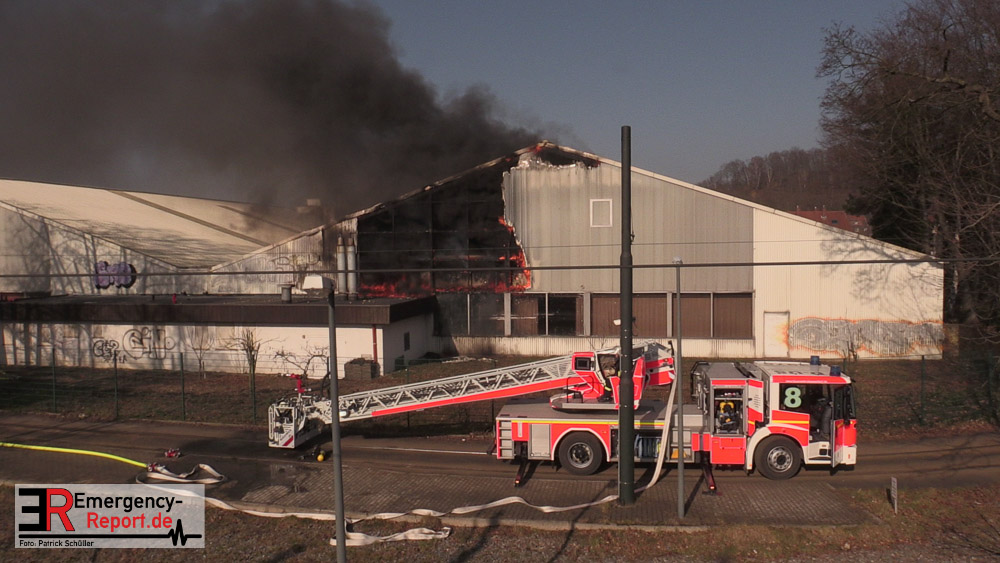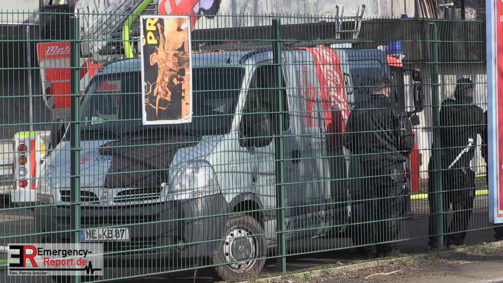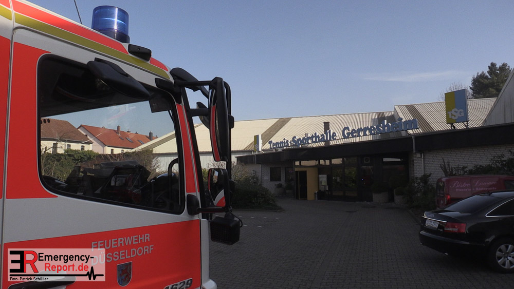 Die dort arbeitenden Dachdecker alarmierten die Feuerwehr und versuchten das Feuer mit eigenen Löschgeräten zu löschen. Hierbei verletzte sich ein Dachdecker leicht. Er wurde ambulant durch den Notarzt der Feuerwehr behandelt. Aufgrund der gemeldeten „Brennenden Halle“ wurden zwei Löschzüge zur Einsatzstelle entsandt, sowie ein weiterer Löschzug, nachdem zahlreiche telefonische Meldungen eingingen. Mit zwei Wenderohren und zwei C-Rohren wurde das Feuer gelöscht. Anschließend wurden fünf Hochleistungslüfter eingesetzt um die Halle rauchfrei zu machen. Die Einsatzstelle wurde weiträumig abgesperrt. Auch die Rheinbahn war hiervon betroffen.
