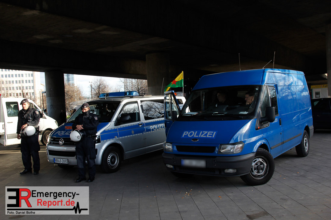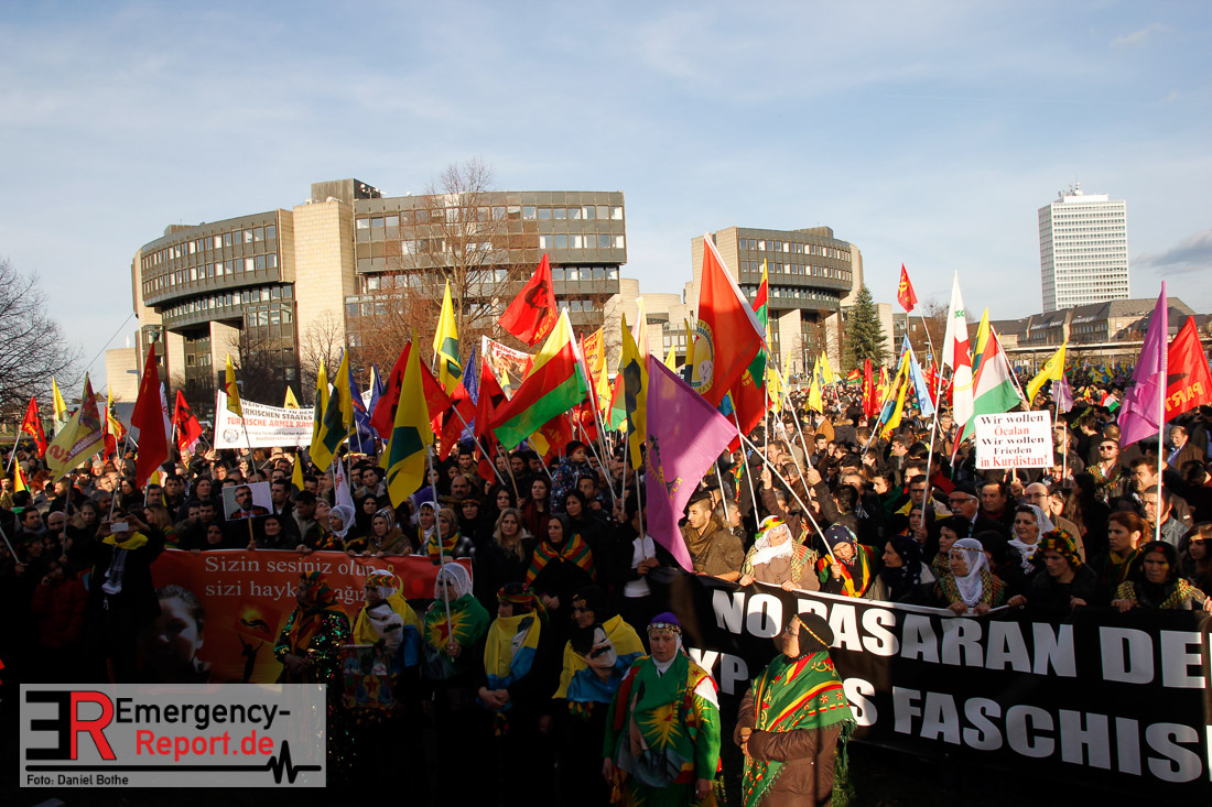 In der Düsseldorfer Innenstadt demonstrierten am 2. Weihnachtsfeiertag tausende Kurden. Um 10 Uhr sammelten sich die Teilnehmer zur Auftaktkundgebung vor dem DGB-Haus an der an der Friedrich-Ebert-Straße in Düsseldorf. Bis 11 Uhr hatten sich dort lediglich 150 Teilnehmer eingefunden. Doch dann stieg laut Polizei díe Zahl der Demonstranten rapide bis auf rund 6000 an. Danach startete ein Protestzug über die Karlstraße, Graf-Adolf-Straße, Haroldstraße und Johannes-Rau-Platz zum Landtag. Bei der Abschlusskundgebung am Nachmittag versammeln sich nach Schätzung der Polizei mehr als 10.000 Demonstranten am Landtag. Die Polizei war mit einem Großaufgebot vor Ort. Mehrere hunderte Beamte wurden zur Begleitung der Demonstration aus dem Weihnachtsurlaub geholt.