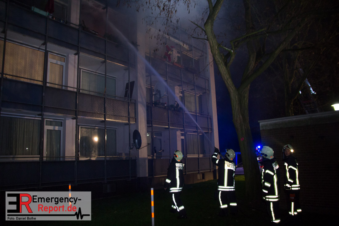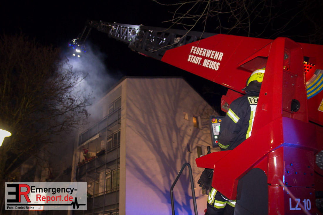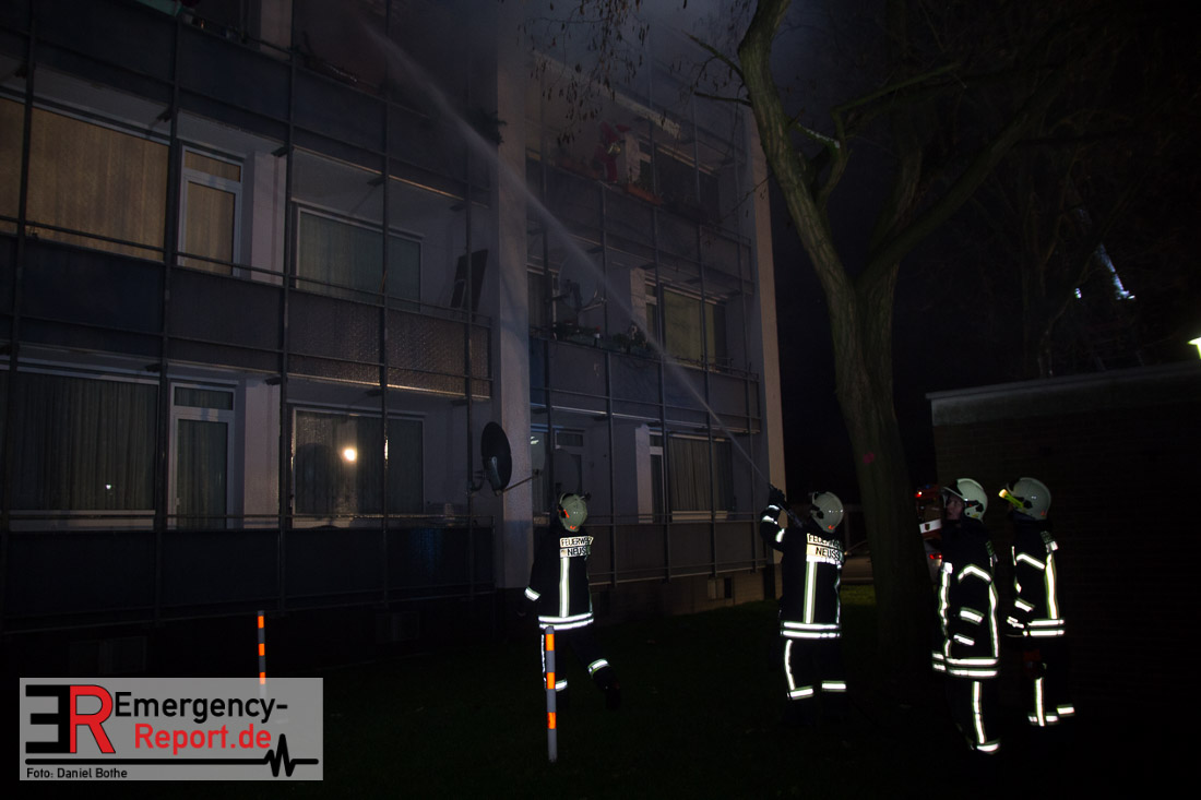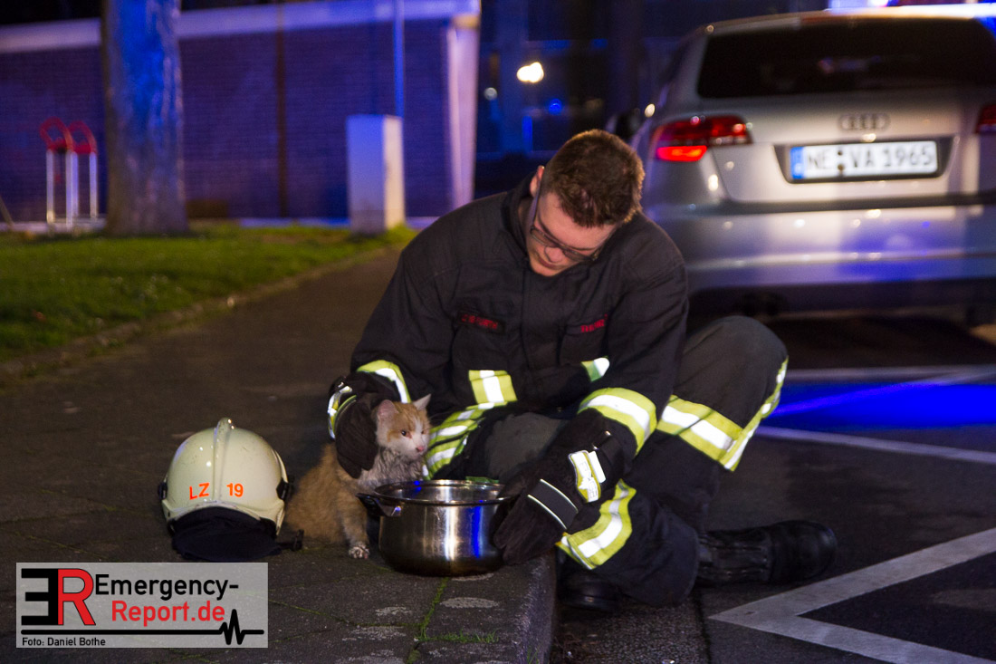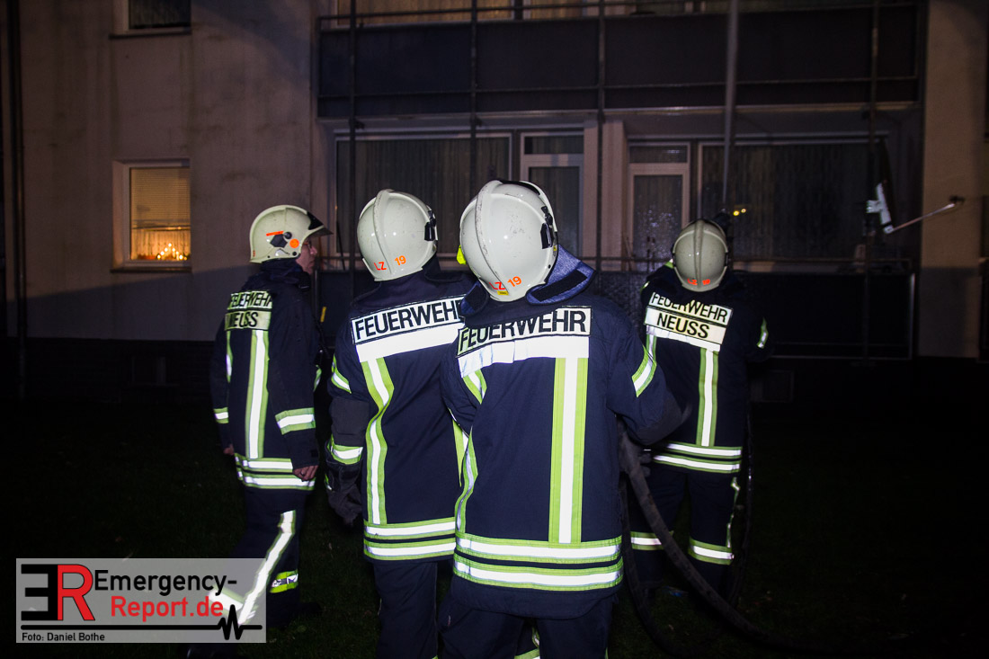 Die Feuerwehr Neuss wurde am Silvesterabend gegen 21:45 Uhr auf die Straße „Am Hohen Weg“ in den Stadtteil Weissenberg alarmiert. Auf dem Balkon eines Mehrfamilienhauses war im 2. Obergeschoss ein Feuer ausgebrochen. Bei Eintreffen der Feuerwehr schlugen Flammen vom Balkon einer Wohnung in der zweiten Etage. Umgehend wurde mit den Löscharbeiten mittels eines Außenangriffs begonnen. In der verrauchten Brandwohnung traf ein weiterer Trupp auf den Wohnungsinhaber. Dieser wehrte sich vehement dagegen von den Wehrleuten aus dem Gefahrenbereich gebracht zu werden. Im Hausflur klammerte er sich immer wieder krampfhaft an das Treppengeländer. Erst als die Polizei ihm Handschellen angelegt hatte konnte er aus dem Haus gebracht und dem Rettungsdienst übergeben werden. Die Feuerwehr rettete ebenfalls eine Katze aus der verrauchten Wohnung, sie wurde einem Tierarzt übergeben. Der Bewohner der Brandwohnung leistete im Rettungswagen, auf der Fahrt ins Krankenhaus und auch noch im Krankenhaus Widerstand. Er trat u.a. um sich und versuchte zu beißen. Zudem bespuckte und beleidigte er die Polizeibeamten, Rettungskräfte und Krankenhausbeschäftigten. Nach ärztlicher Untersuchung im Krankenhaus wurde er in das Neusser Polizeigewahrsam eingeliefert. Da er noch einen offenen Haftbefehl wegen Widerstand hatte, wurde er am Neujahrsmorgen dem Haftrichter vorgeführt. Beim Wohnungsbrand entstand Gebäudeschaden. Die Wohnung ist nicht mehr bewohnbar. Die Kriminalpolizei hat die Ermittlungen zur Brandursache aufgenommen.