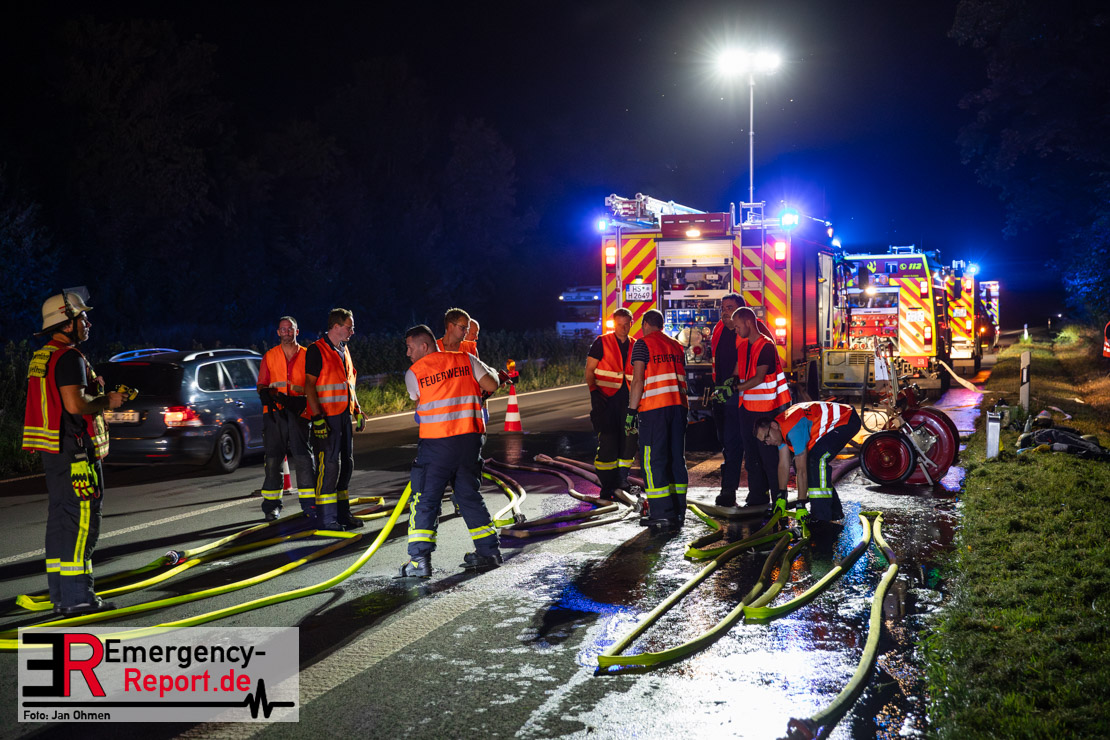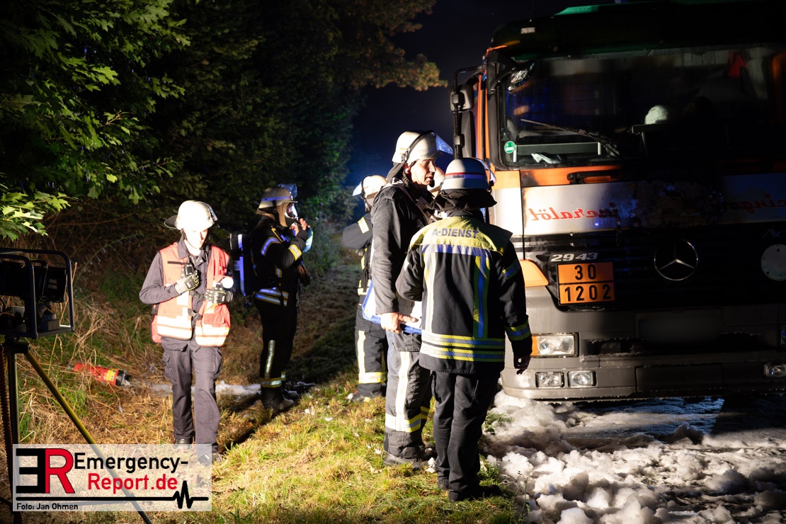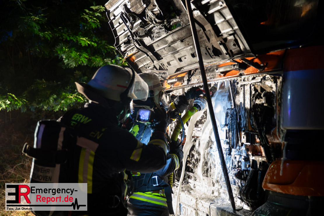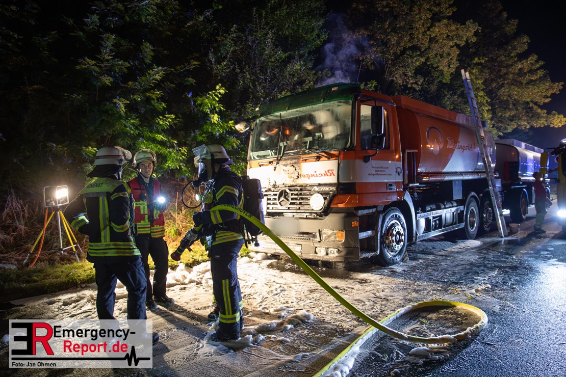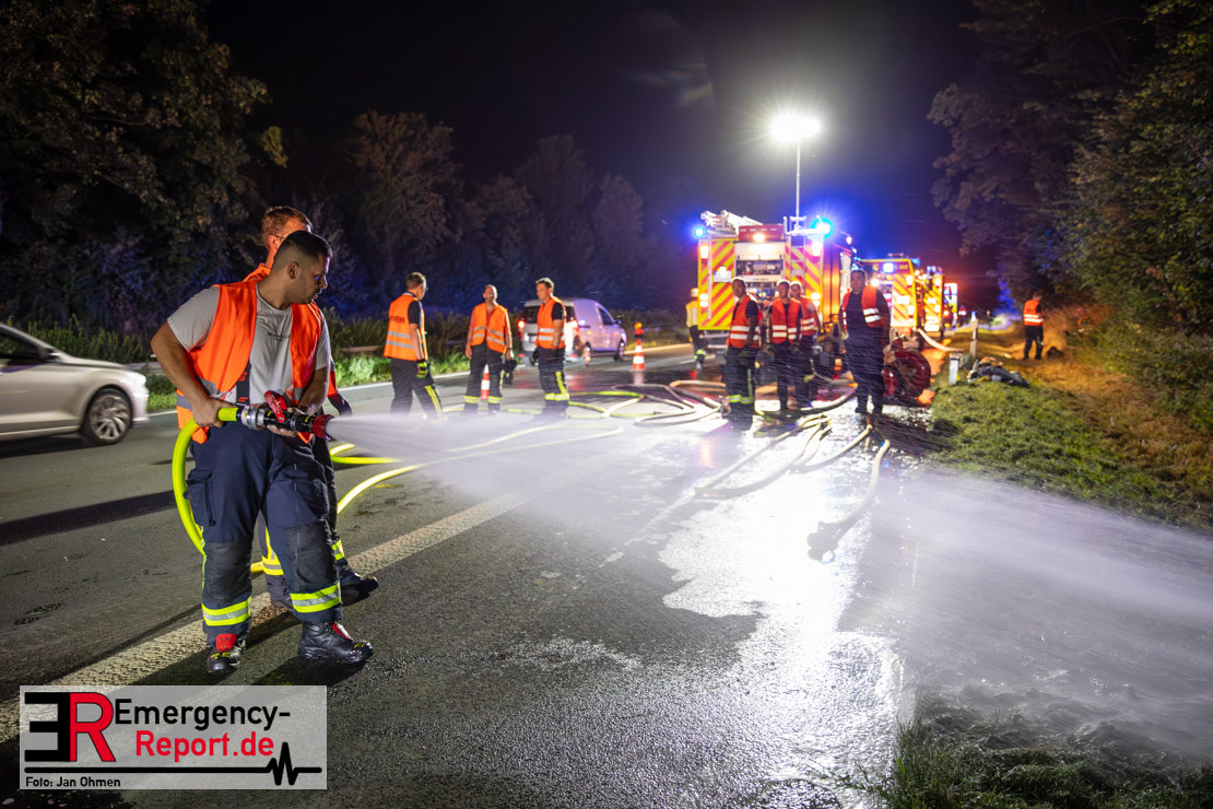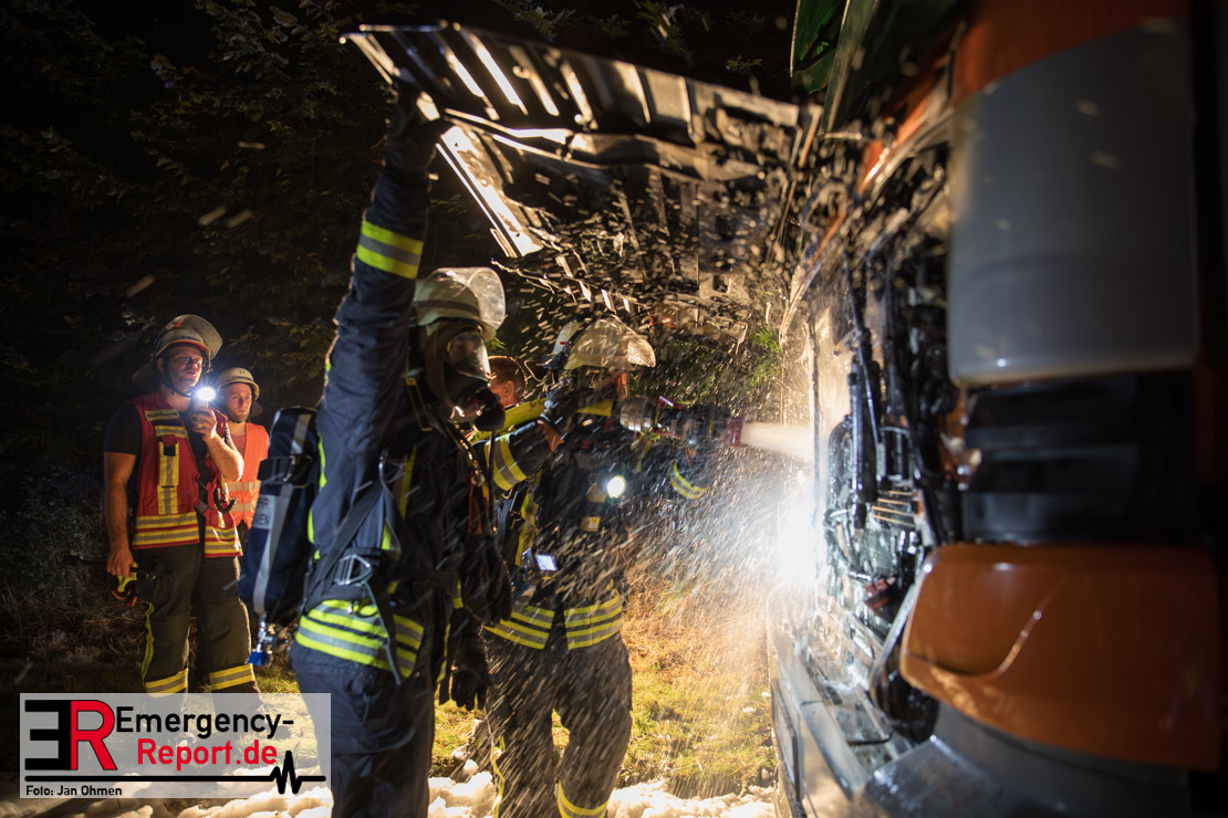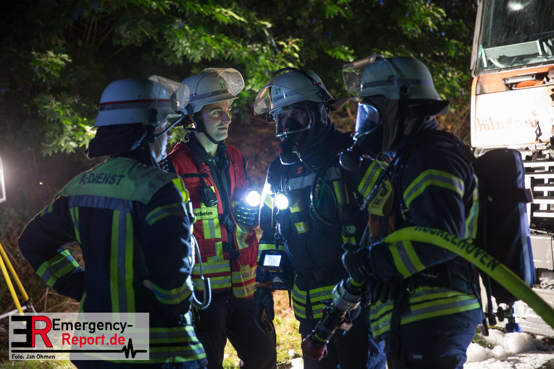 Die Feuerwehr Hückelhoven wurde am Abend auf die Autobahn 46 alarmiert. Vor der Ausfahrt Erkelenz-Süd, Fahrtrichtung Düsseldorf, kam es aus bislang ungeklärter Ursache zu einem LKW-Brand. Bei dem Eintreffen der ersten Einsatzkräfte brannte es im Motorraum des mit Heizöl beladenen LKW. Durch das schnelle Eingreifen der Feuerwehr, konnte das Übergreifen auf das gesamte Gespann glücklicherweise verhindert werden. Die Autobahn war für einige Zeit vollgesperrt. Ein Abschleppunternehmen hat sich um die Bergung des LKWs gekümmert. Zu der Brandursache hat die Polizei die Ermittlungen aufgenommen.
