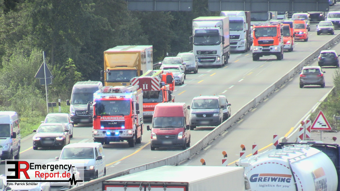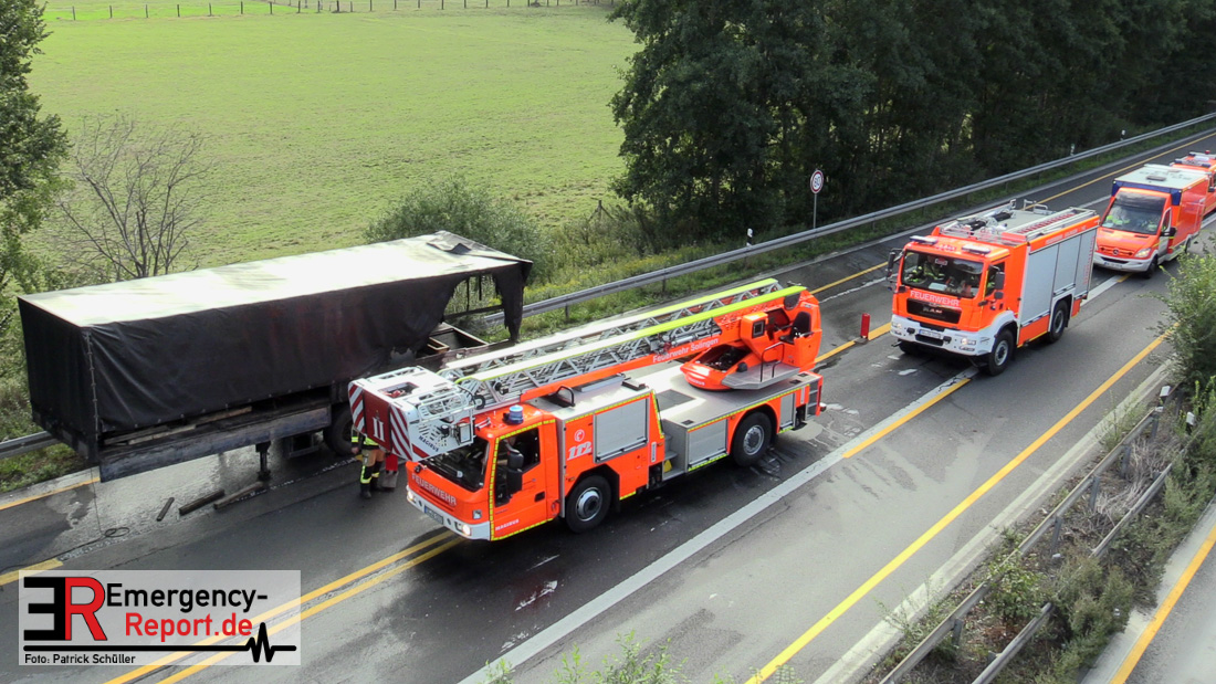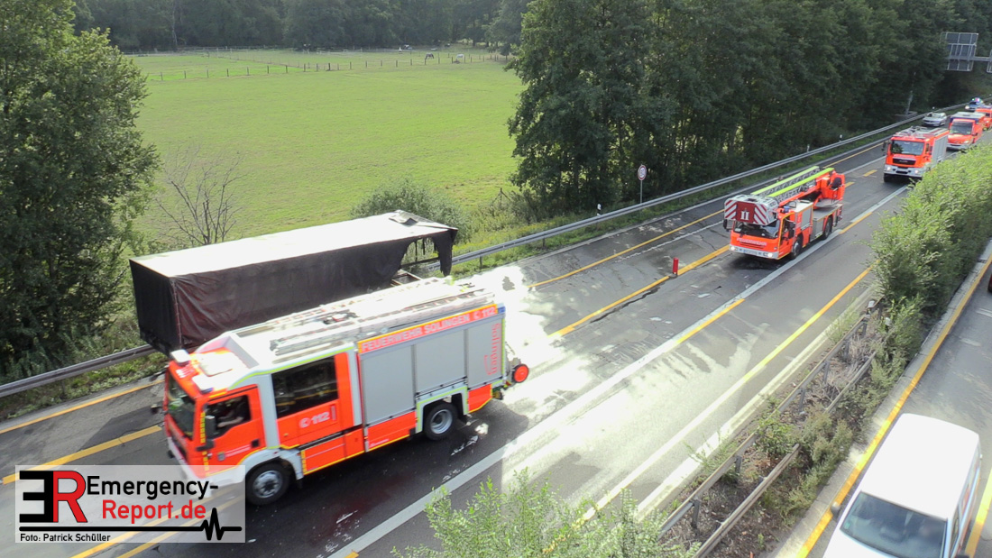 Die Feuerwehr Hilden und die Feuerwehr Solingen wurden am Morgen des 01.09.2020 zu einem LKW-Brand auf die A3 in Fahrtrichtung Oberhausen alarmiert. Bei Eintreffen der ersten Einsatzkräfte stellte sich heraus, dass unmittelbar vor dem Autobahnkreuz Hilden der Auflieger eines LKW, im hinteren Bereich, brannte.