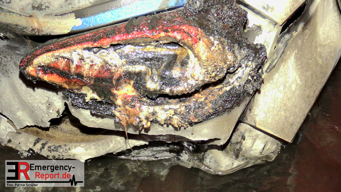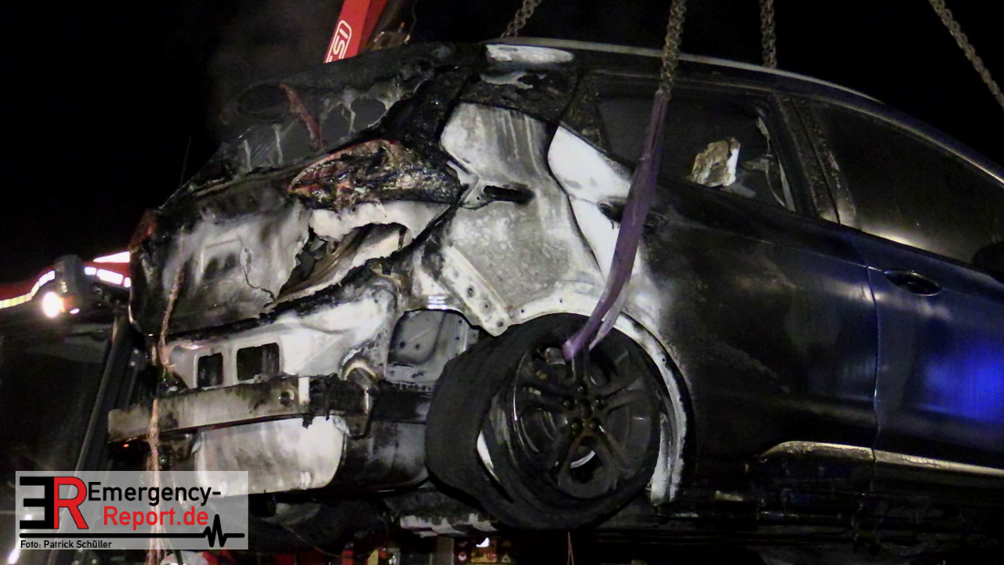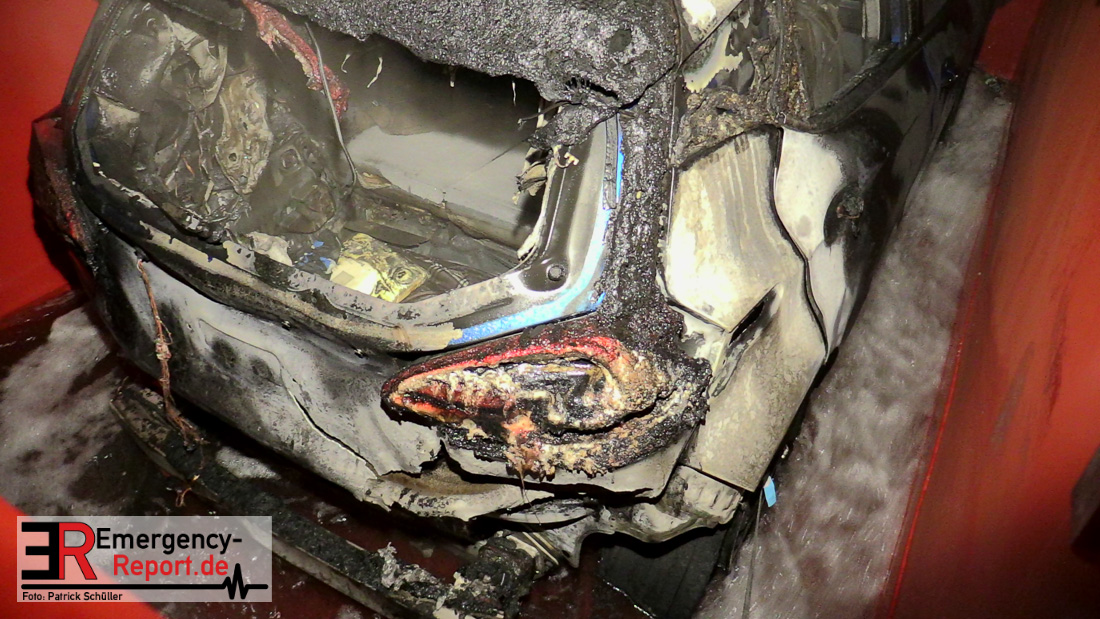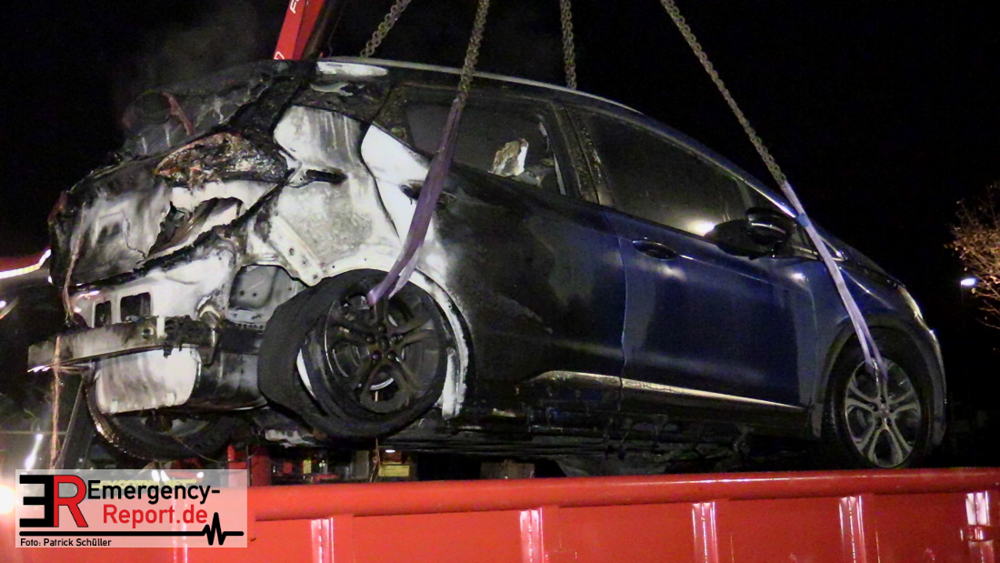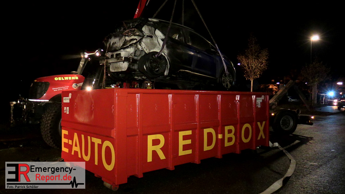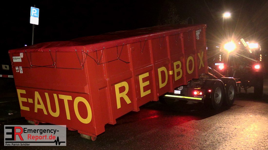 Vor Ort angekommen stellte der Wachabteilungsleiter Rauchentwicklung und Flammen an einem Elektrofahrzeug fest, dass sich gerade im Ladevorgang befand. Das Fahrzeug wurde von der Ladesäule getrennt und umgehend ein umfangreicher Löschangriff gestartet. Aufgrund des erhöhten Aufwands, den der Brand eines Elektrofahrzeugs mit sich bringt, wurde der Führungsdienst nachalarmiert. Bereits nach kurzer Zeit war das Feuer gelöscht. Als problematisch erwies sich aber die Hitzeentwicklung im Fahrzeugakku. Da diese mit herkömmlichen Maßnahmen nicht zu stoppen war, wurde eine Mulde angefordert. Diese sollte mit Wasser gefüllt und das Fahrzeug darin abgestellt werden. Da die Feuerwehr Langenfeld keine Mulde besitzt, musste ein Privatunternehmen mit der Bereitstellung einer solchen beauftragt werden. Um für diese Aufgabe genügend Einsatzkräfte vor Ort zu haben und gleichzeitig auch den Grundschutz sicher zu stellen, wurde die Löscheinheit Reusrath alarmiert. Gegen 2 Uhr 45 traf dann die Mulde an der Einsatzstelle an. Mittels eines Fahrzeugkrans wurde das Elektrofahrzeug in die Mulde gehoben und diese von den Einsatzkräften mit rd. 5.000 Liter Wasser gefüllt. Ebenfalls vor Ort waren Mitarbeiter des Kanaldienstes und der Unteren Wasserbehörde sowie des Stromversorgers, der die Ladesäule stromlos schaltete. Einsatzende war gegen 6 Uhr.