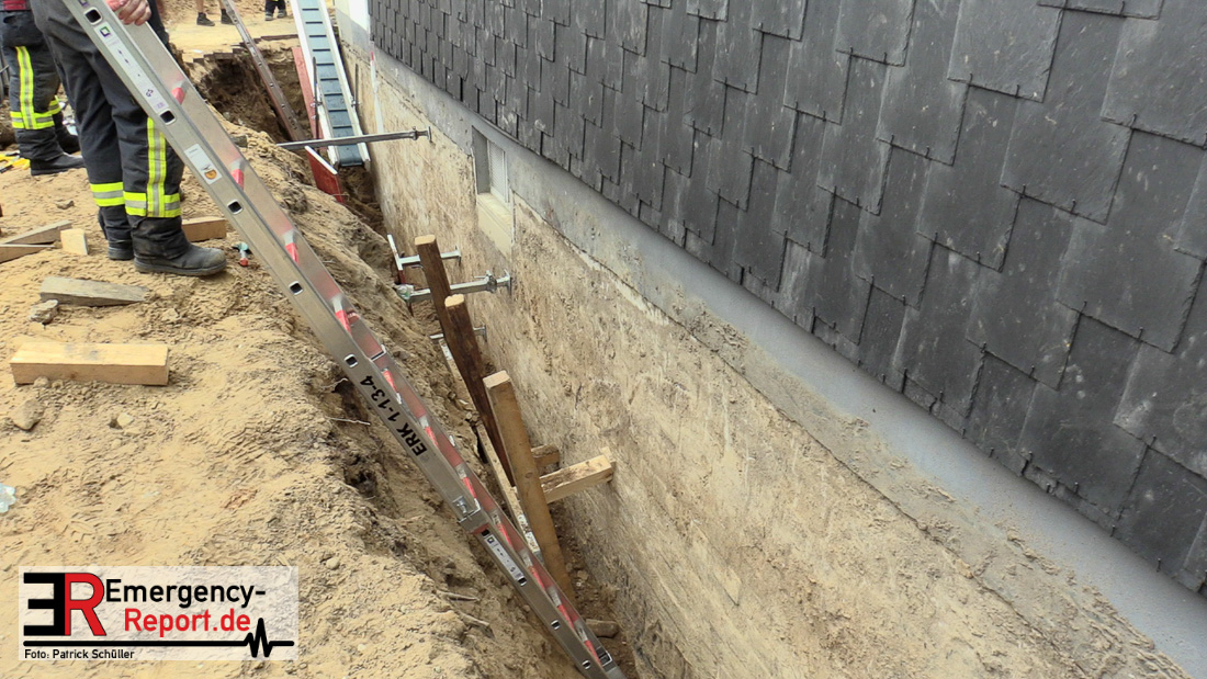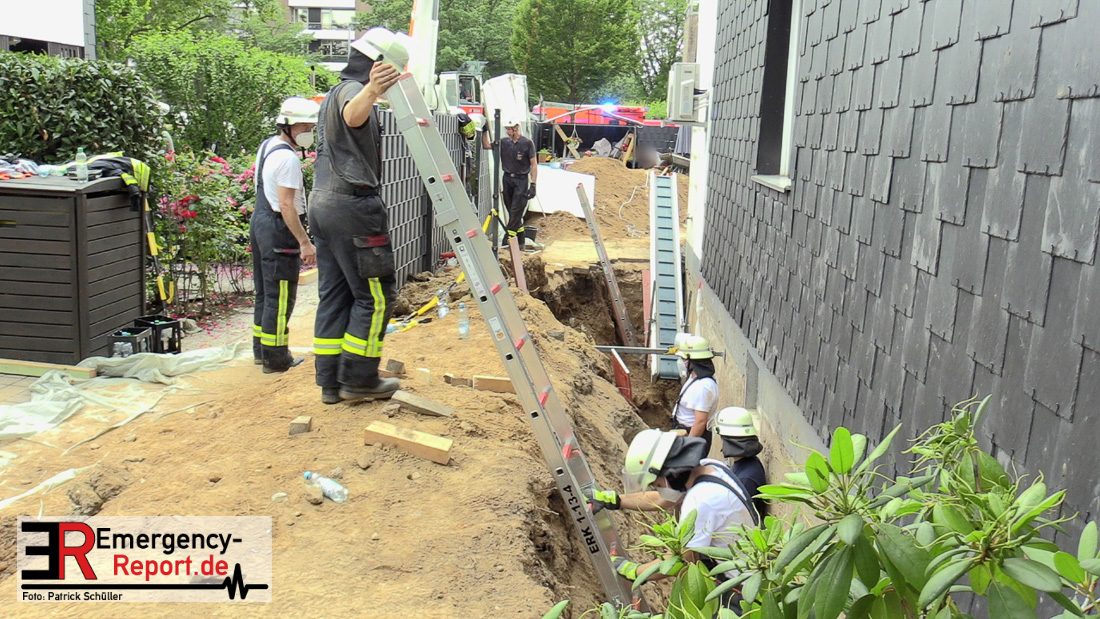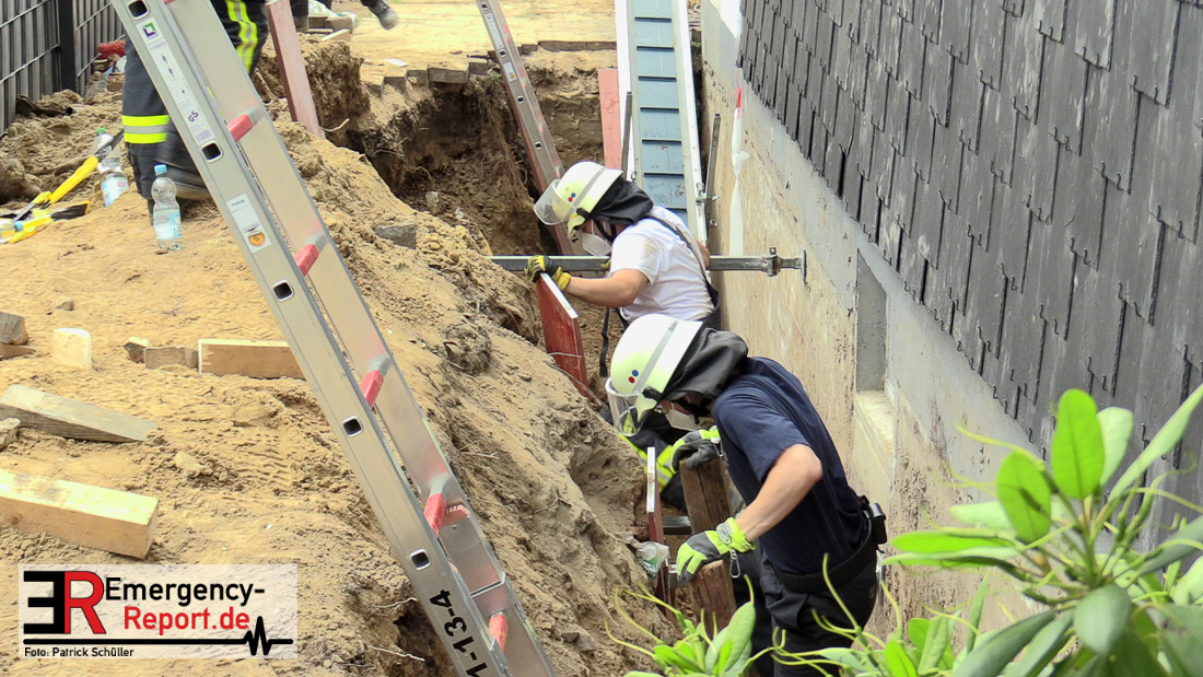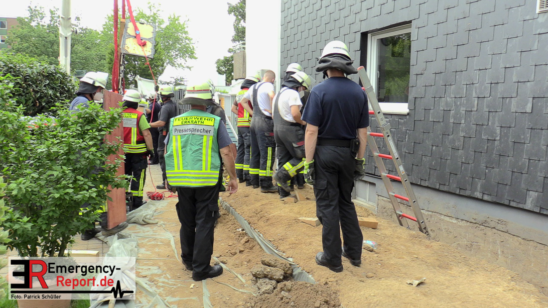Am Nachmittag (03.07.2021) um 14:48 Uhr wurde die Feuerwehr Erkrath zu einer verschütteten Person in einer Baugrube an der Adalbert-Stifter-Straße im Stadtteil Unterfeldhaus alarmiert. Beim Aushub eines Schachtes an einer Hauswand waren die Erdmassen abgerutscht und hatten den Bauarbeiter verschüttet.