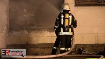 Die Einsatzstelle wurde in zwei Abschnitte gegliedert. Der vollständig brennende Gebäudeteil, in dem zahlreiche Paletten mit Druckerpapier und Multifunktionsgeräte (Drucker-/Kopierer-/Scan-/Fax-Kombi) gelagert wurden, konnte nicht mehr betreten werden, da Einsturzgefahr drohte. Die übrigen Gebäudebereiche wurden von den Einsatzkräften begangen und kontrolliert. In diesen wurden ebenfalls Multifunktionsgeräte gelagert und bearbeitet, außerdem handelte es sich um Bürobereiche. Diese wurden durch Rauch- und Rußeinwirkung erheblich in Mitleidenschaft gezogen, zudem drang Löschwasser ein. Das Dach musste auf der Suche nach Brandnestern unter dem Einsatz von Wärmebildkameras zum Teil geöffnet werden.