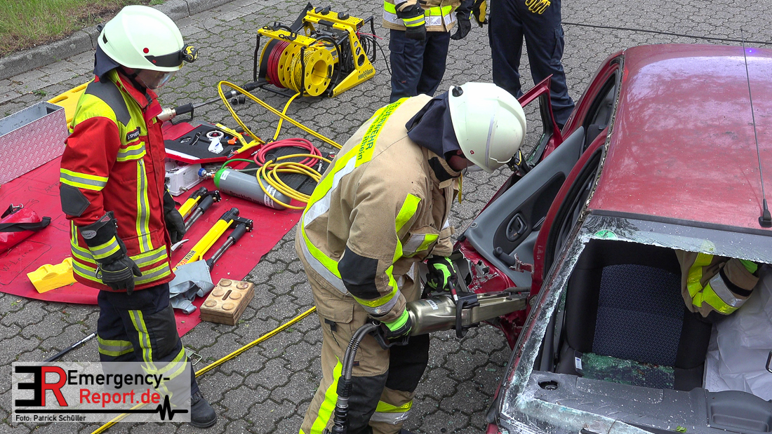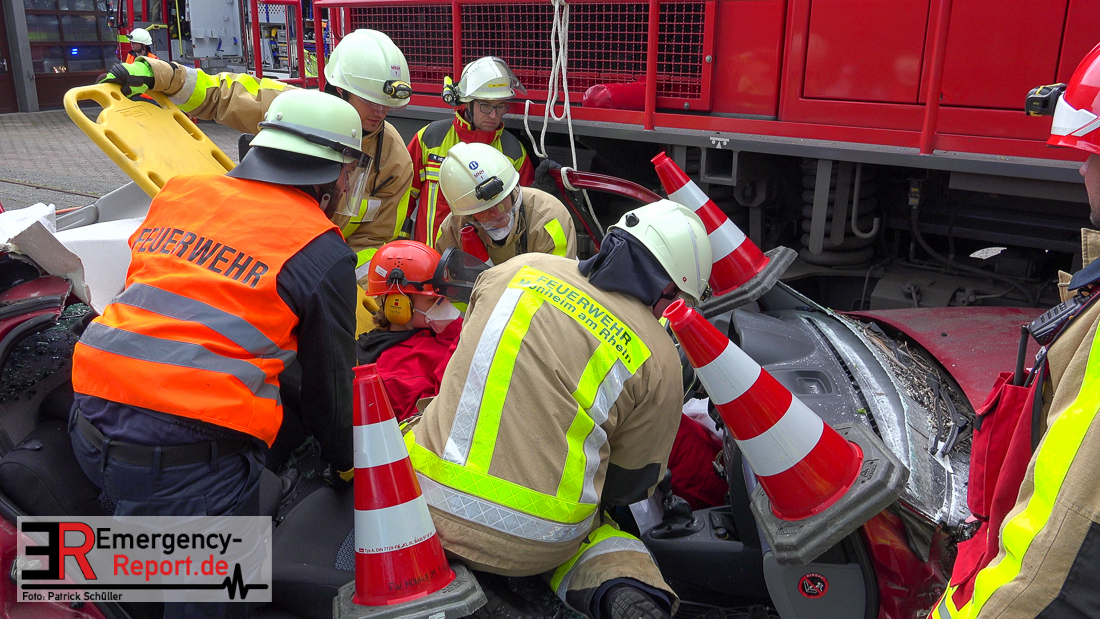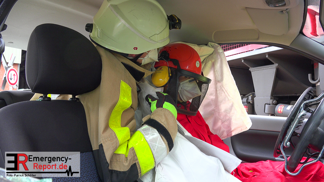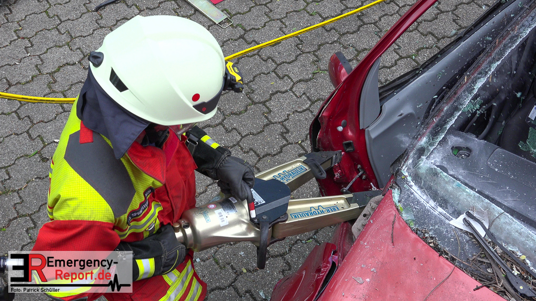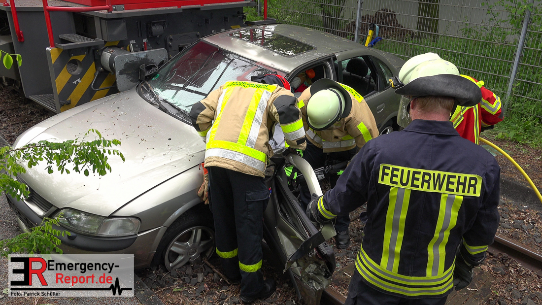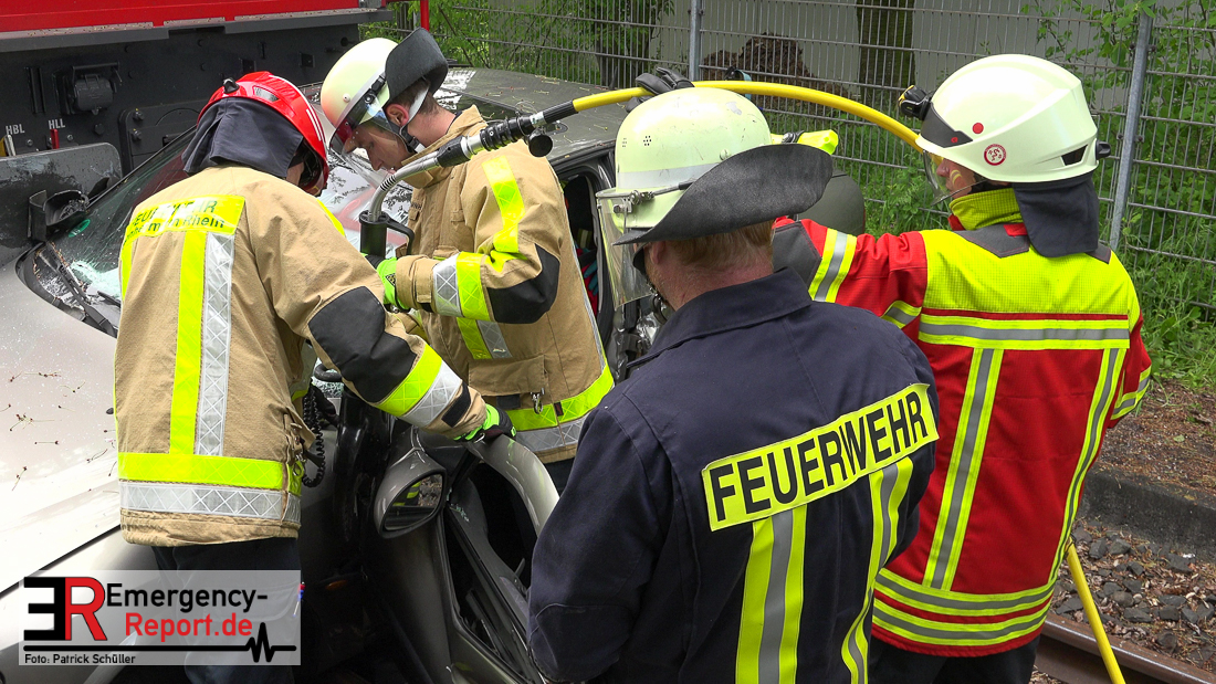Bei Eintreffen der ersten Einsatzkräfte bestätigte sich die von den Anruferngeschilderte Lage. Nach einer umfangreichen Lageerkundung galt es die in beiden Autos eingeklemmten Fahrerinnen und den überrollten, lebensbedrohlich verletzten, Radfahrer mit hydraulischem Rettungsgerät zu befreien. Der schwer geschockte, aber unverletzte Bahnfahrer, wurde dauerhaft durch die Feuerwehrmänner betreut.