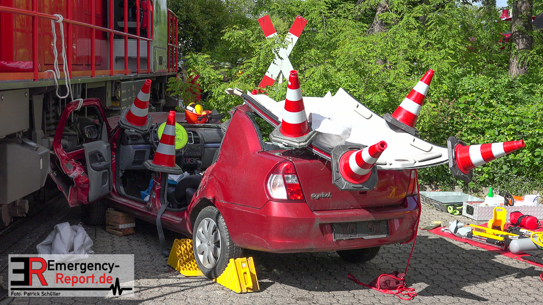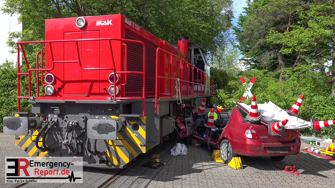 Aufgeregte Anrufer meldeten einen Zusammenstoss zwischen einer Lokomotive und zwei Autos an einem Bahnübergang, ein Radfahrer sollte unter einem der Autos eingeklemmt sein. Glücklicherweise handelte es sich nicht um einen Realeinsatz, sondern um eine Übung.