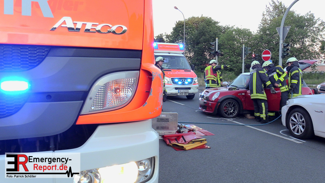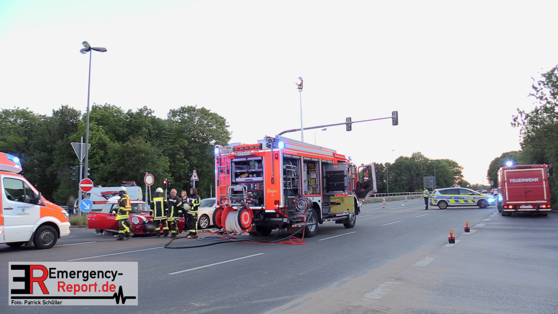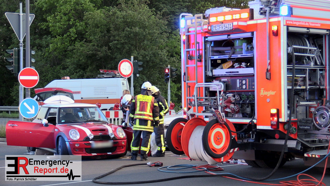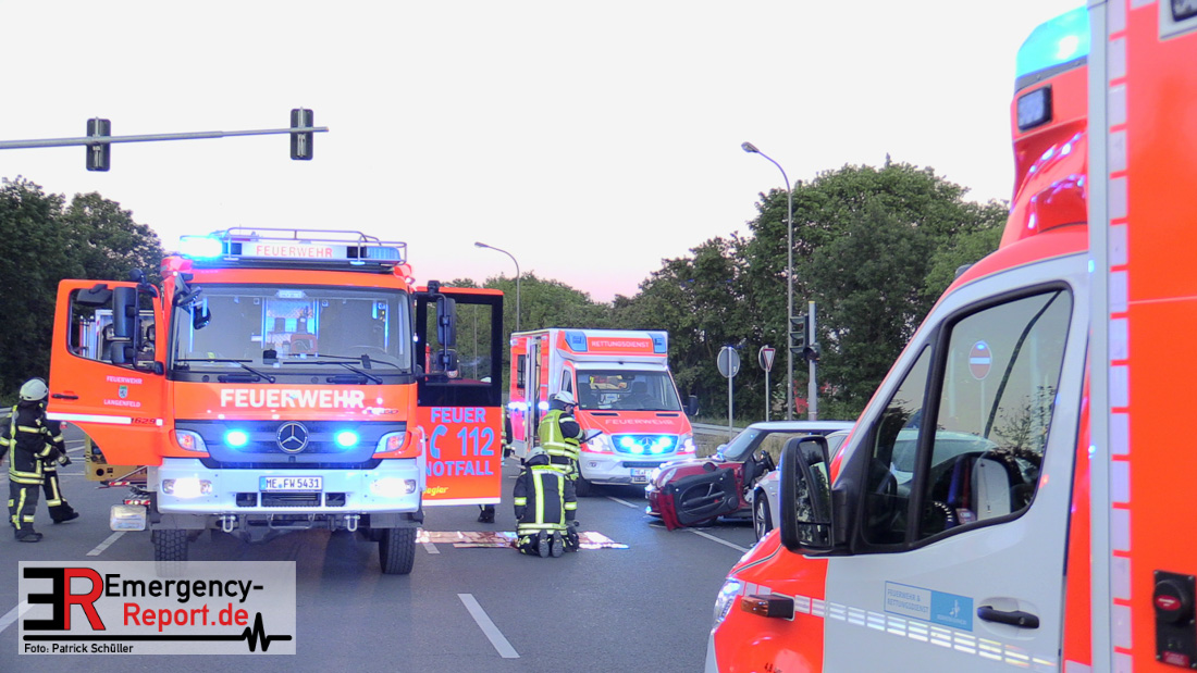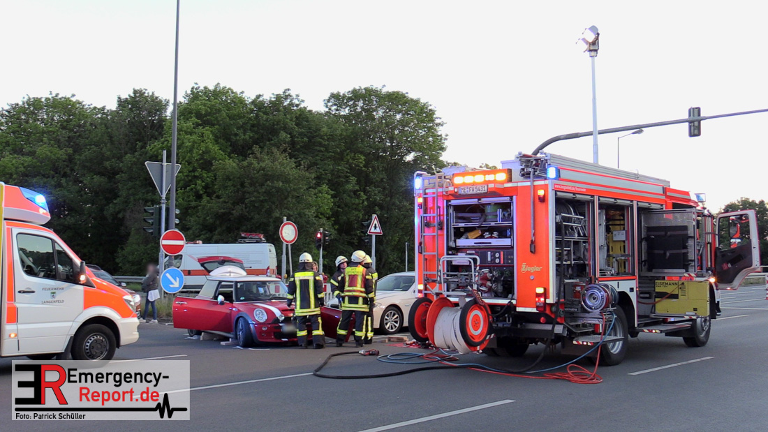 Am Dienstag, den 5. Mai, wurde die Feuerwehr Langenfeld in den Abendstunden zu einem Verkehrsunfall auf die Berghausener Straße alarmiert. Vor Ort eingetroffen stellten die Einsatzkräfte fest, dass im Kreuzungsbereich mit der Karl-Benz- Straße zwei Fahrzeuge kollidiert waren. Insgesamt gab es drei betroffene Personen.