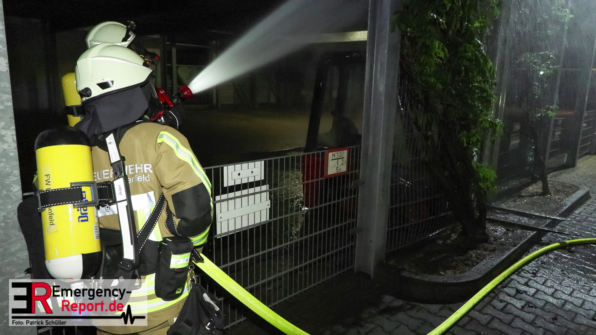 Gegen 1 Uhr bemerkte ein aufmerksamer Zeuge einen Brand auf einem Grundstück an der Katzbergstraße und verständigte den Notruf. Einsatzkräfte der Feuerwehr Langenfeld fanden nach ihrem schnellen Eintreffen einen brennenden Gabelstapler vor. Sie konnten das Feuer rasch löschen.