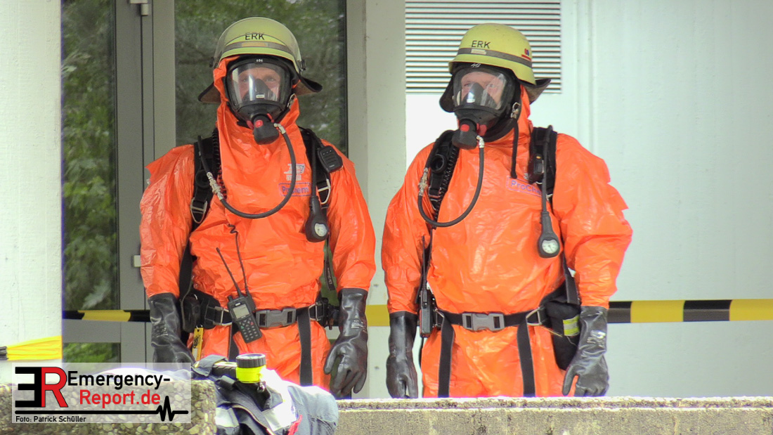 Zunächst wurden die Einsatzkräfte der hauptamtlichen Wache der Feuerwehr Erkrath mit dem Einsatzstichwort „Geruch“ zum Hochhaus am Stadtweiher alarmiert. Die Einsatzleiterin erhöhte umgehend die Alarmstufe auf das Stichwort „BC-Unfall“ nachdem die Mitarbeiter der Entrümpelungsfirma ihr den Sachverhalt geschildert hatten und im Treppenraum des 11. Obergeschosses ein starker, beißender Geruch wahrnehmbar war. Die beiden betroffenen Mitarbeiter, die wie bereits angegeben eigenständig vor dem Eintreffen der Feuerwehr einen Arzt aufgesucht hatten, wurden vom Notarzt der Feuerwehr Mettmann gesichtet und mit einem Rettungswagen der Feuerwehr Haan der Uniklinik Düsseldorf zur ambulanten Behandlung zugeführt.