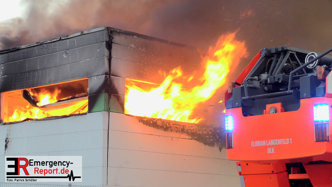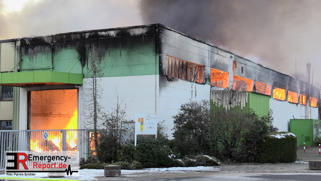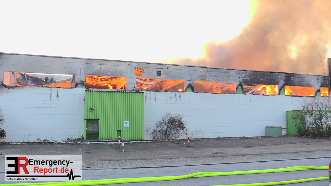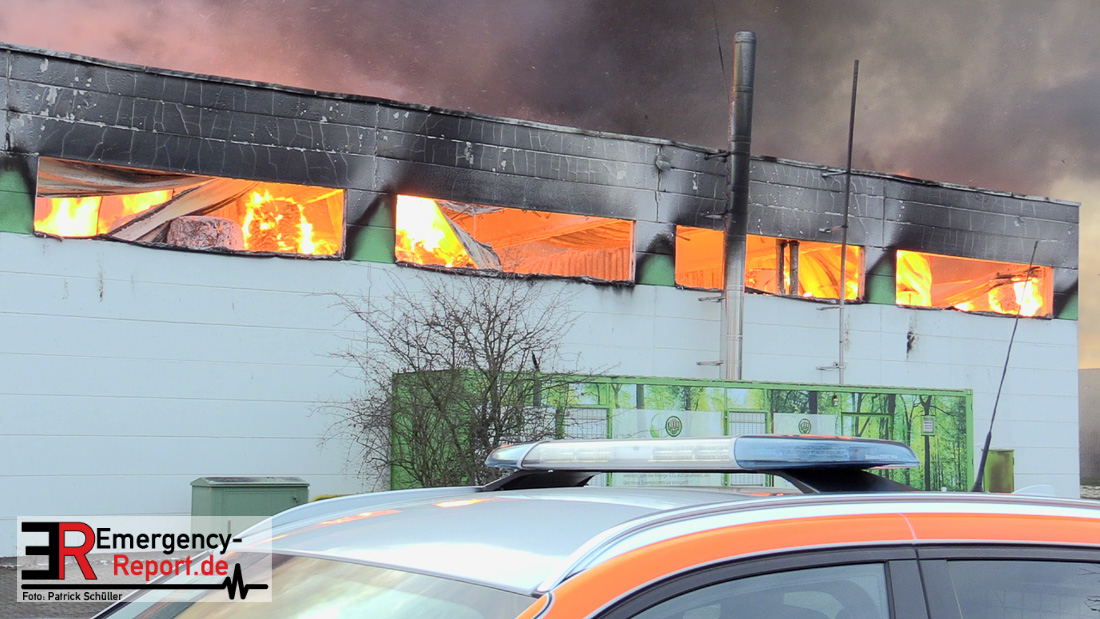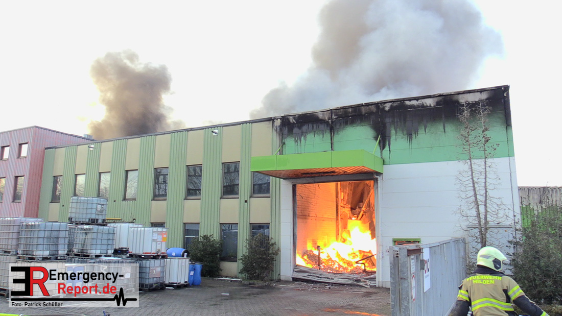 Die Lagerhalle mit den Abmaßen 40 m x 50 m stand in Vollbrand, sodass umgehend überörtliche Unterstützung angefordert wurde. Aufgrund der starken Rauchentwicklung wurde die Bevölkerung über die Warnapp Nina gewarnt. Die Feuerwehr Hilden wird aktuell überörtlich durch Einsatzkräfte der Feuerwehr Erkrath (Löschzug-überörtlich), Feuerwehr Langenfeld (Löschgruppe-überörtlich) sowie durch eine Löschgruppe der Feuerwehr Haan, die den Grundschutz für das Stadtgebiet Hilden auf der Feuer- und Rettungswache Hilden sicherstellt, unterstützt. Des Weiteren befindet sich der Messzug des Kreises Mettmann, der sich aus den Feuerwehren Ratingen und Velbert zusammensetzt im Einsatz.Der Brand ist unter Kontrolle. Aktuell laufen noch aufwändige Nachlöscharbeiten, die sich voraussichtlich noch bis in den frühen Morgen hinziehen werden. Im Einsatz befinden sich zurzeit über 120 Einsatzkräfte der Feuerwehren sowie das THW, das für die Nacht zum Ausleuchten der Einsatzstelle alarmiert wurde. Die Verpflegung wird durch das DRK sichergestellt.