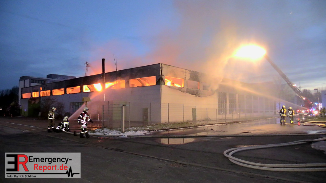 Gegen 16:30 Uhr meldete ein Zeuge einen Brandausbruch in einer Produktions- und Lagerhalle einer Papierfabrik an der Heinrich-Hertz-Straße in Hilden. Bei Eintreffen der von ihm alarmierten Feuerwehr stand die in einer Sackgasse eines Industriegebietes gelegene, circa 40mx50m große Halle bereits in Vollbrand. Trotz eines hohen Kräfteansatzes der Einsatzkräfte der Feuerwehr Hilden sowie überörtlicher Feuerwehrwachen konnte nicht verhindert werden, dass die Halle vollständig ausbrannte.