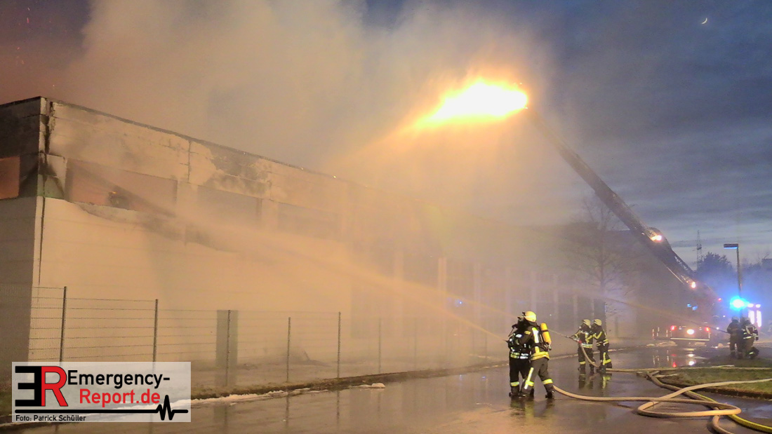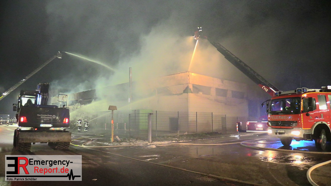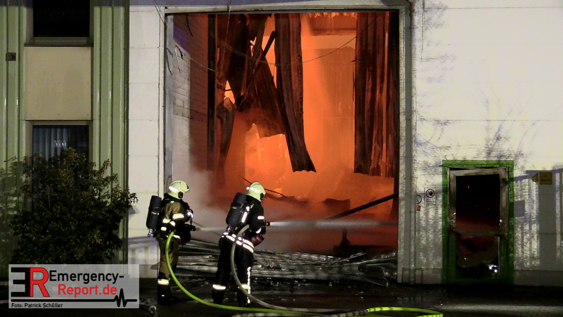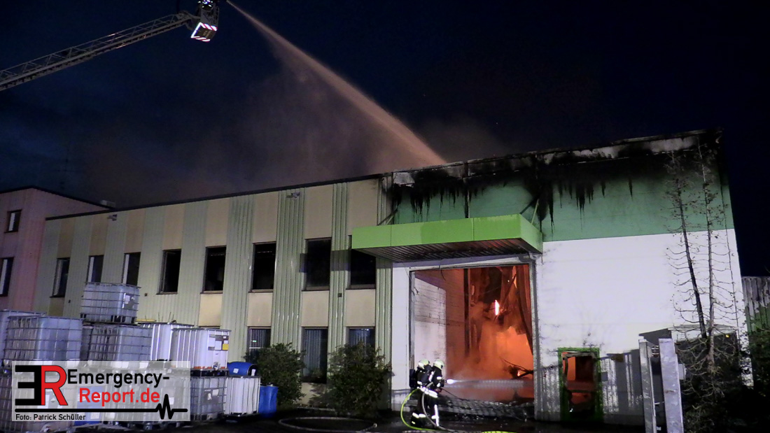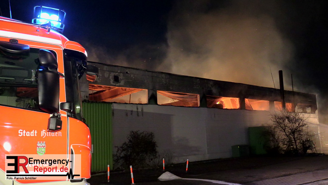 Die Lagerhalle mit den Abmaßen 40 m x 50 m stand in Vollbrand, sodass umgehend überörtliche Unterstützung angefordert wurde. Aufgrund der starken Rauchentwicklung wurde die Bevölkerung über die Warnapp Nina gewarnt. Die Feuerwehr Hilden wird aktuell überörtlich durch Einsatzkräfte der Feuerwehr Erkrath (Löschzug-überörtlich), Feuerwehr Langenfeld (Löschgruppe-überörtlich) sowie durch eine Löschgruppe der Feuerwehr Haan, die den Grundschutz für das Stadtgebiet Hilden auf der Feuer- und Rettungswache Hilden sicherstellt, unterstützt. Des Weiteren befindet sich der Messzug des Kreises Mettmann, der sich aus den Feuerwehren Ratingen und Velbert zusammensetzt im Einsatz.Der Brand ist unter Kontrolle. Aktuell laufen noch aufwändige Nachlöscharbeiten, die sich voraussichtlich noch bis in den frühen Morgen hinziehen werden. Im Einsatz befinden sich zurzeit über 120 Einsatzkräfte der Feuerwehren sowie das THW, das für die Nacht zum Ausleuchten der Einsatzstelle alarmiert wurde. Die Verpflegung wird durch das DRK sichergestellt.