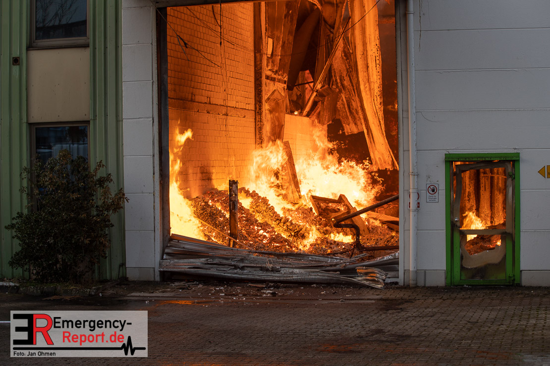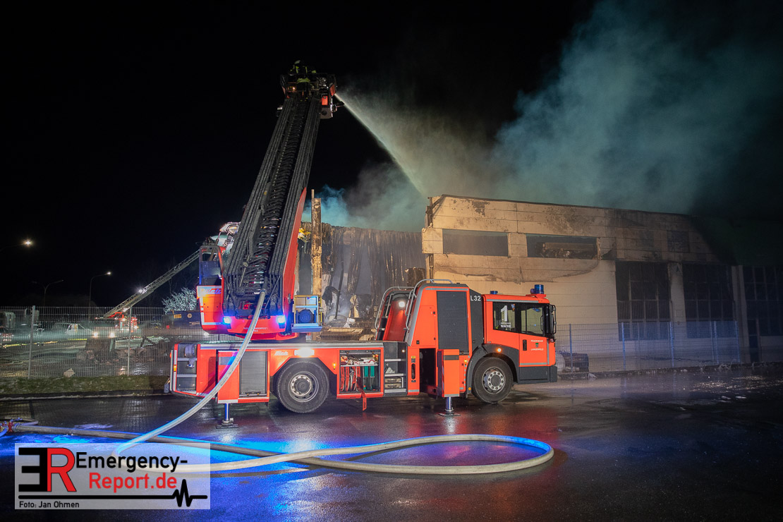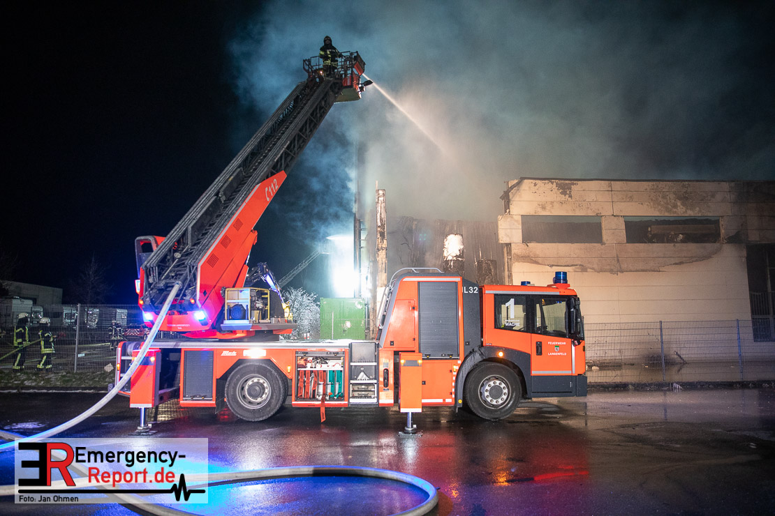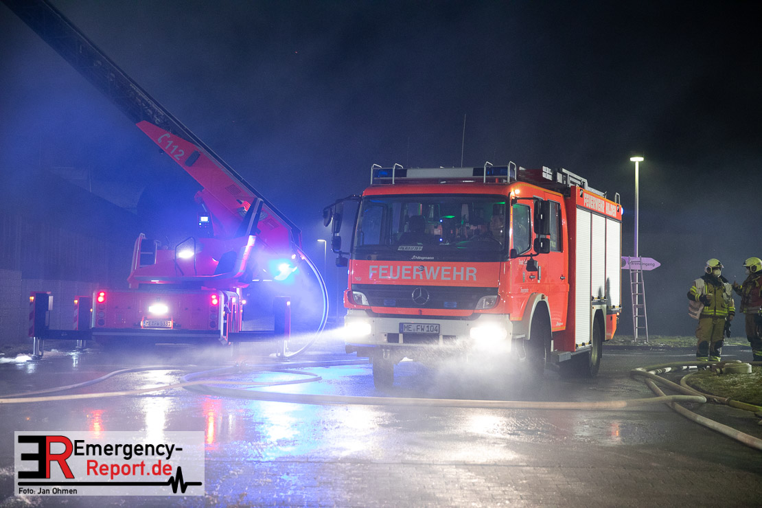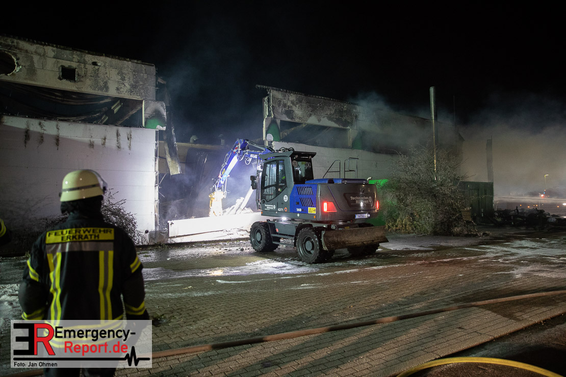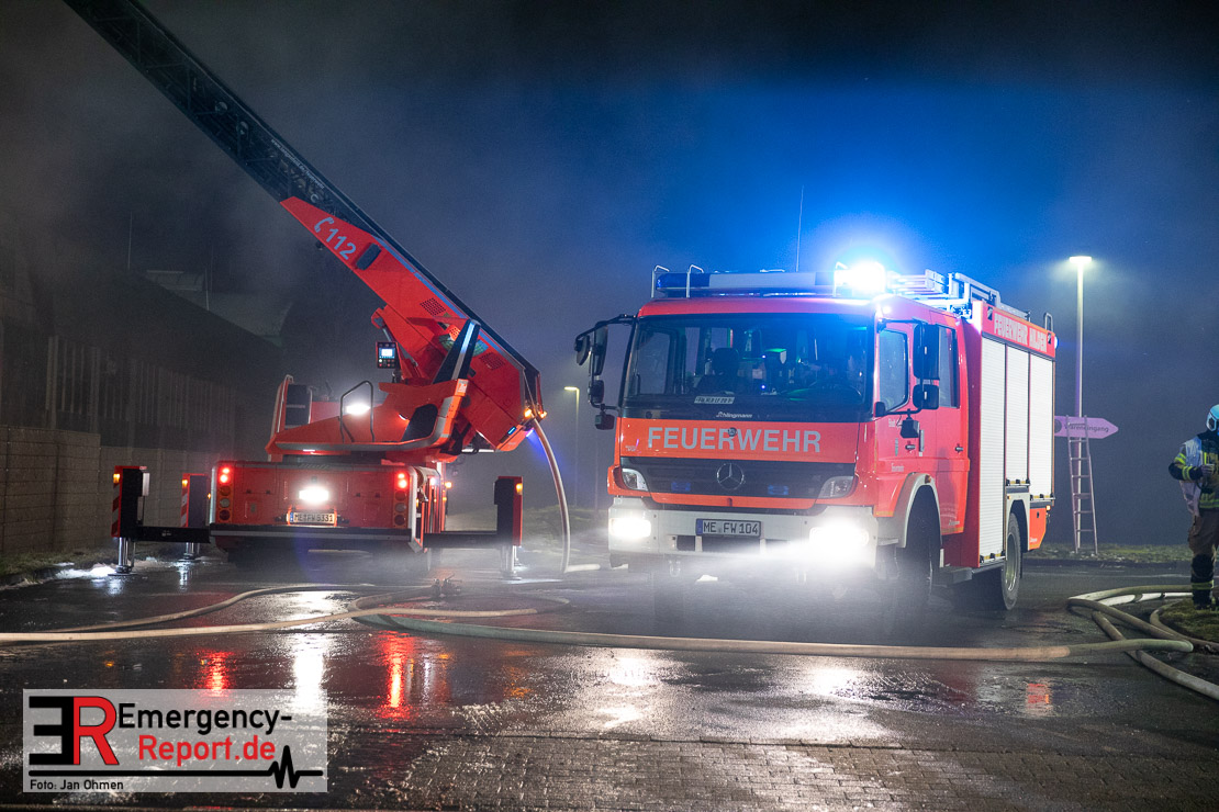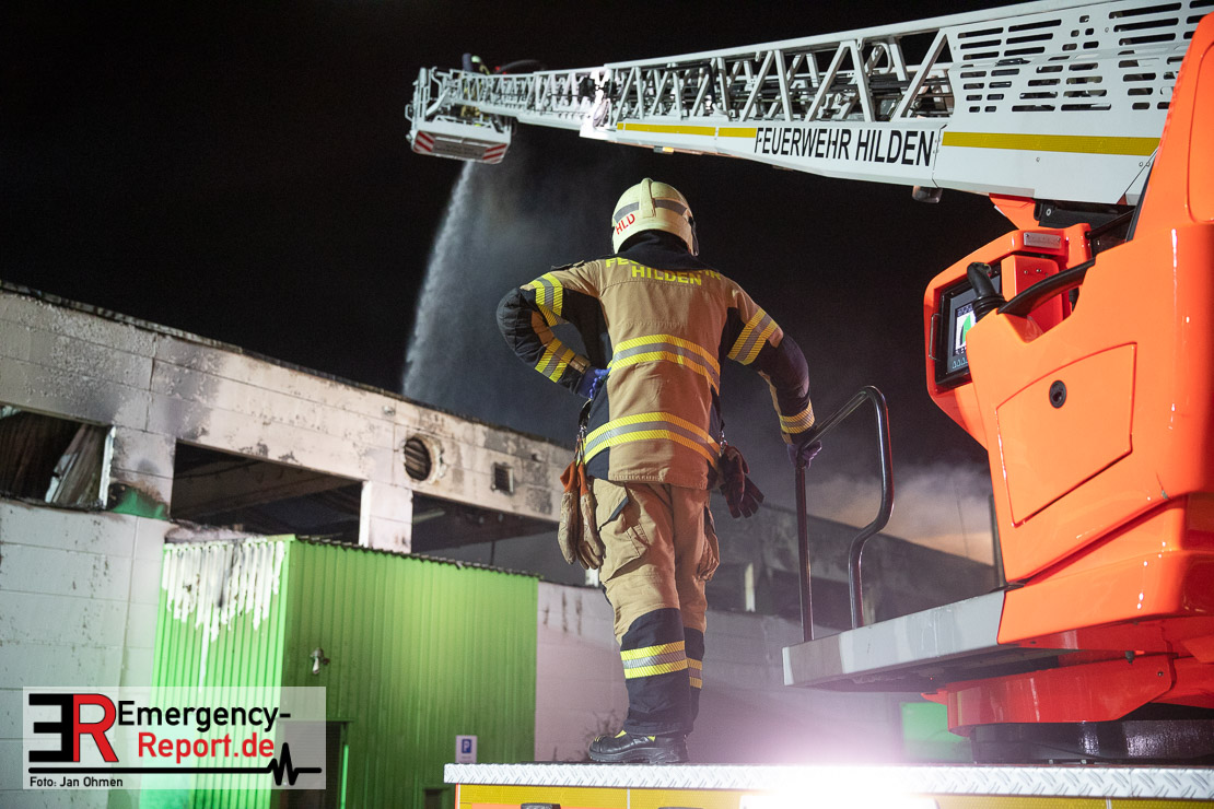 Die Lagerhalle mit den Abmaßen 40 m x 50 m stand in Vollbrand, sodass umgehend überörtliche Unterstützung angefordert wurde. Aufgrund der starken Rauchentwicklung wurde die Bevölkerung über die Warnapp Nina gewarnt. Die Feuerwehr Hilden wird aktuell überörtlich durch Einsatzkräfte der Feuerwehr Erkrath (Löschzug-überörtlich), Feuerwehr Langenfeld (Löschgruppe-überörtlich) sowie durch eine Löschgruppe der Feuerwehr Haan, die den Grundschutz für das Stadtgebiet Hilden auf der Feuer- und Rettungswache Hilden sicherstellt, unterstützt. Des Weiteren befindet sich der Messzug des Kreises Mettmann, der sich aus den Feuerwehren Ratingen und Velbert zusammensetzt im Einsatz.Der Brand ist unter Kontrolle. Aktuell laufen noch aufwändige Nachlöscharbeiten, die sich voraussichtlich noch bis in den frühen Morgen hinziehen werden. Im Einsatz befinden sich zurzeit über 120 Einsatzkräfte der Feuerwehren sowie das THW, das für die Nacht zum Ausleuchten der Einsatzstelle alarmiert wurde. Die Verpflegung wird durch das DRK sichergestellt.