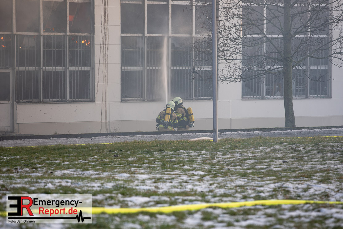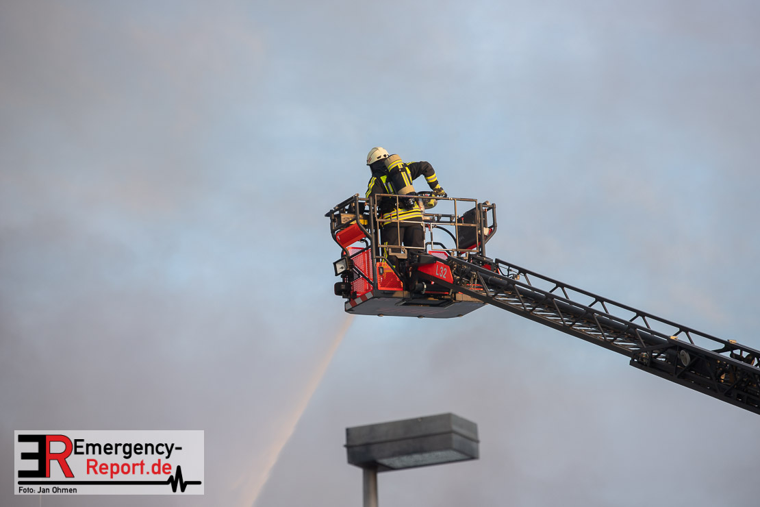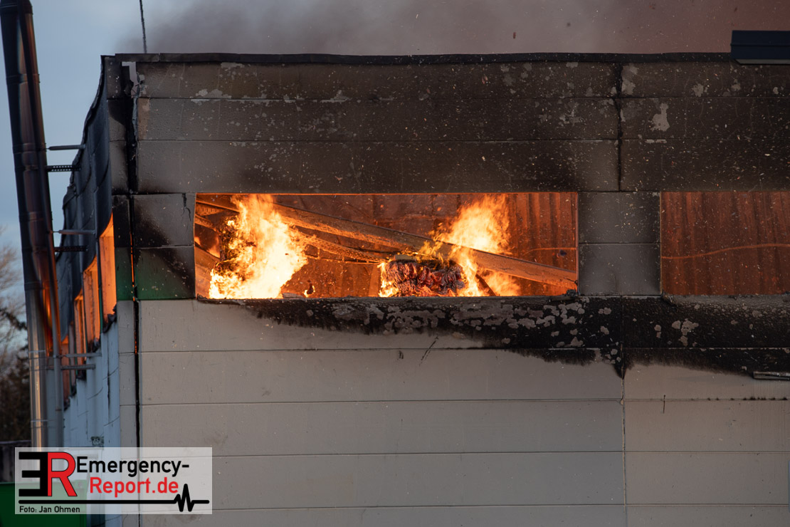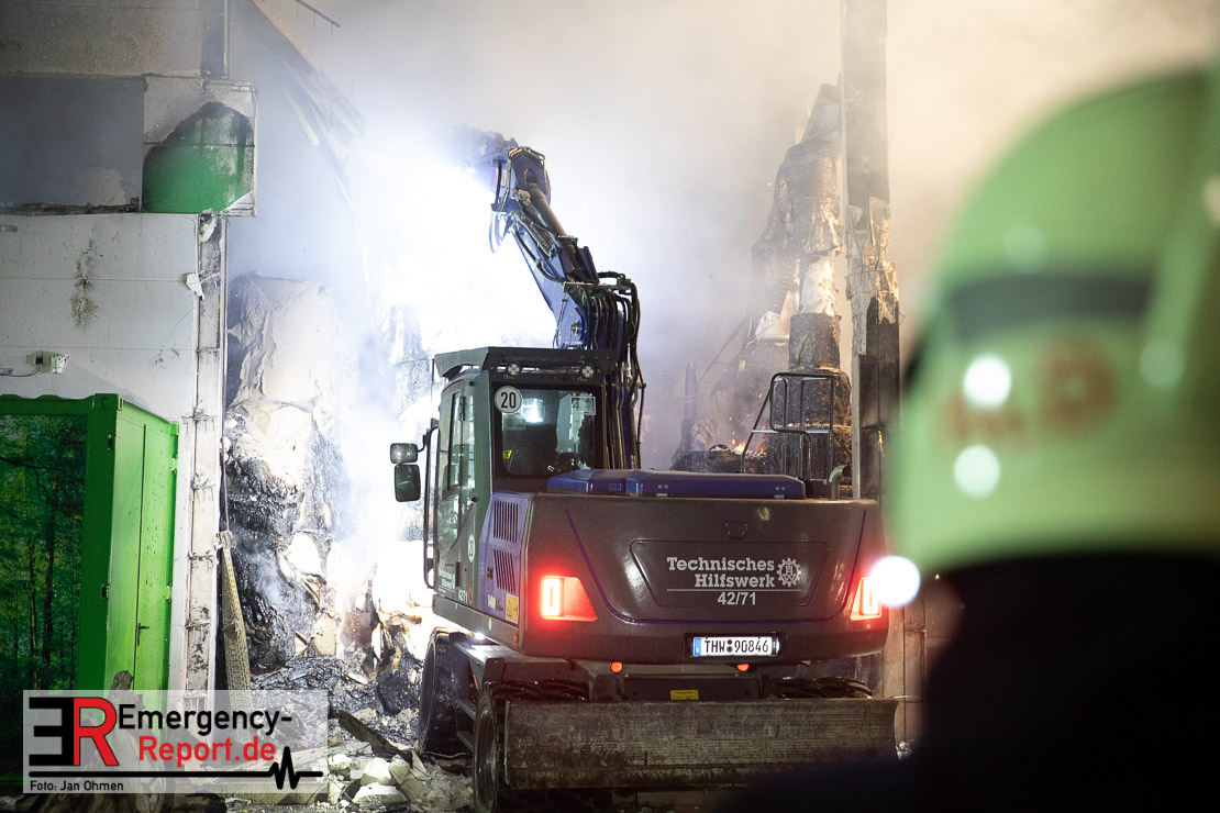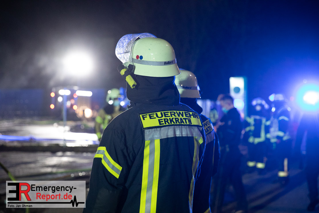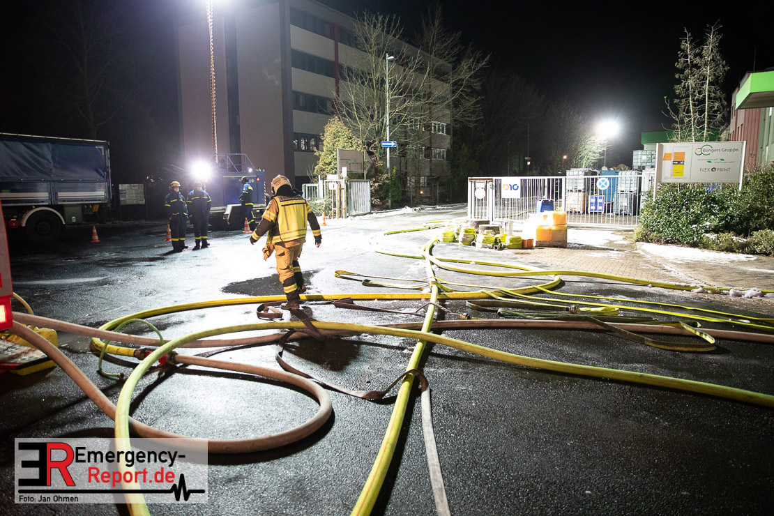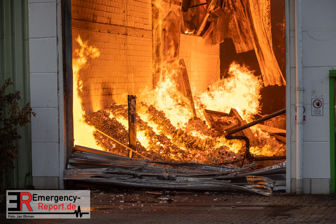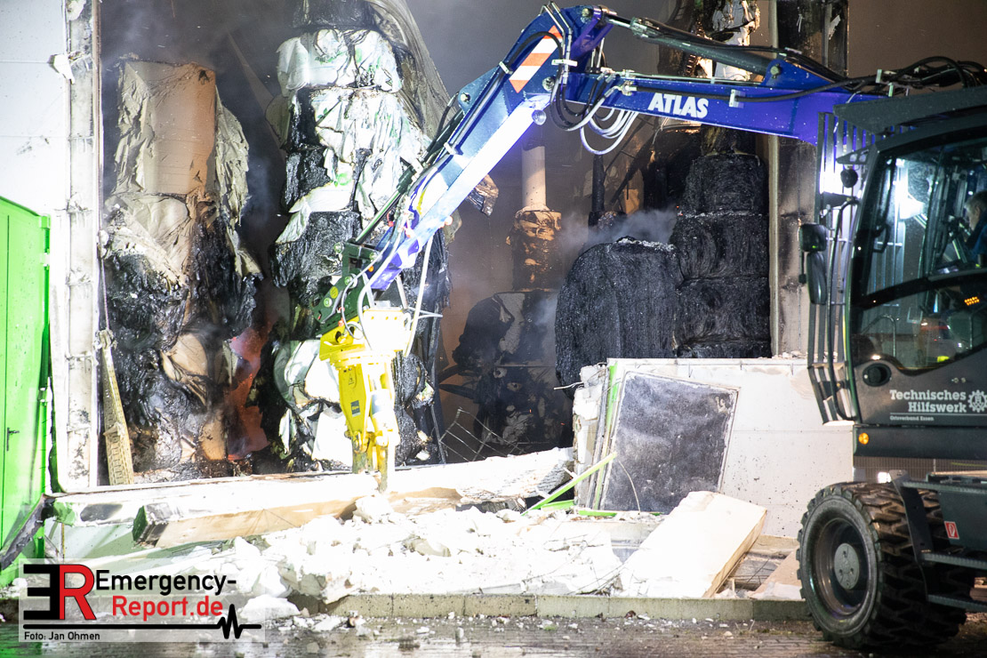 Die Lagerhalle mit den Abmaßen 40 m x 50 m stand in Vollbrand, sodass umgehend überörtliche Unterstützung angefordert wurde. Aufgrund der starken Rauchentwicklung wurde die Bevölkerung über die Warnapp Nina gewarnt. Die Feuerwehr Hilden wird aktuell überörtlich durch Einsatzkräfte der Feuerwehr Erkrath (Löschzug-überörtlich), Feuerwehr Langenfeld (Löschgruppe-überörtlich) sowie durch eine Löschgruppe der Feuerwehr Haan, die den Grundschutz für das Stadtgebiet Hilden auf der Feuer- und Rettungswache Hilden sicherstellt, unterstützt. Des Weiteren befindet sich der Messzug des Kreises Mettmann, der sich aus den Feuerwehren Ratingen und Velbert zusammensetzt im Einsatz.Der Brand ist unter Kontrolle. Aktuell laufen noch aufwändige Nachlöscharbeiten, die sich voraussichtlich noch bis in den frühen Morgen hinziehen werden. Im Einsatz befinden sich zurzeit über 120 Einsatzkräfte der Feuerwehren sowie das THW, das für die Nacht zum Ausleuchten der Einsatzstelle alarmiert wurde. Die Verpflegung wird durch das DRK sichergestellt.
