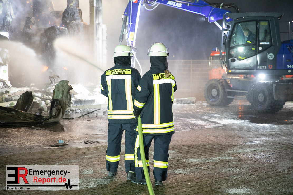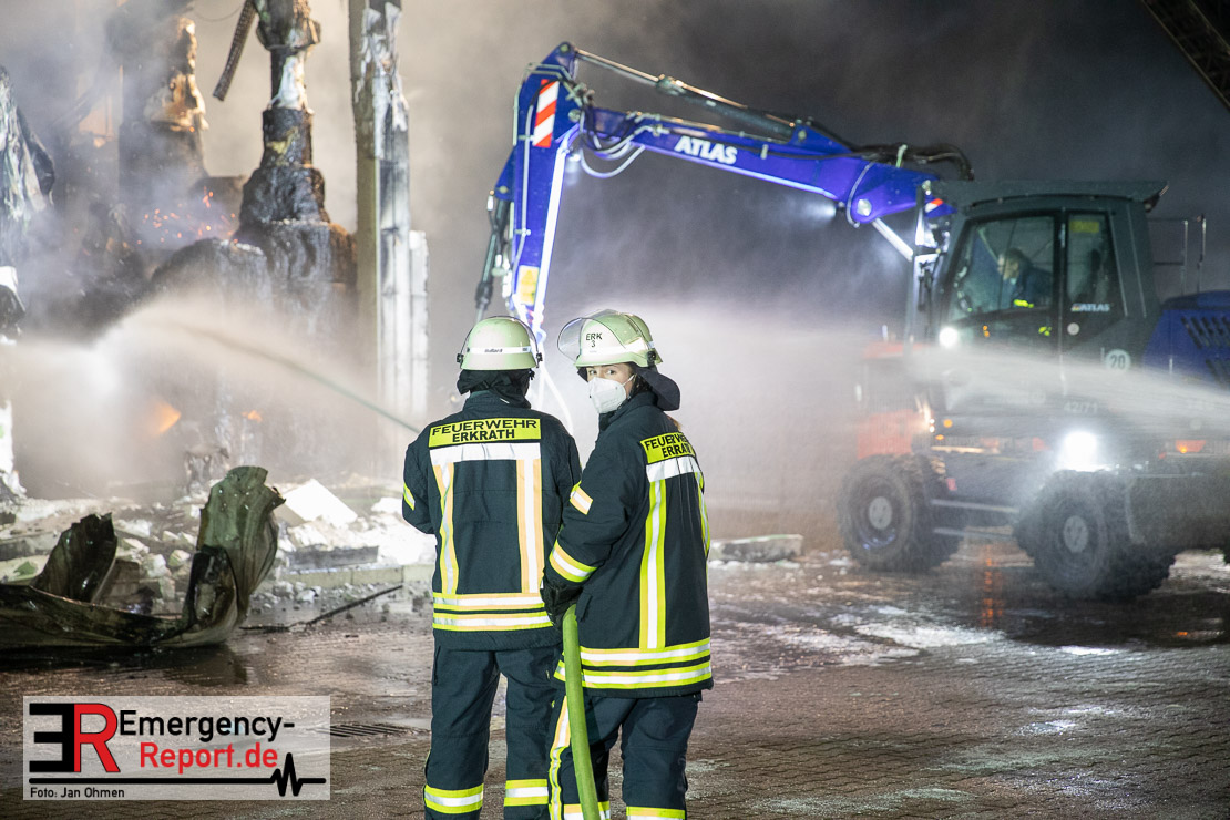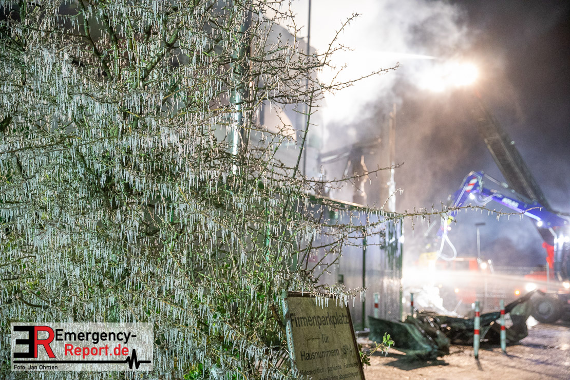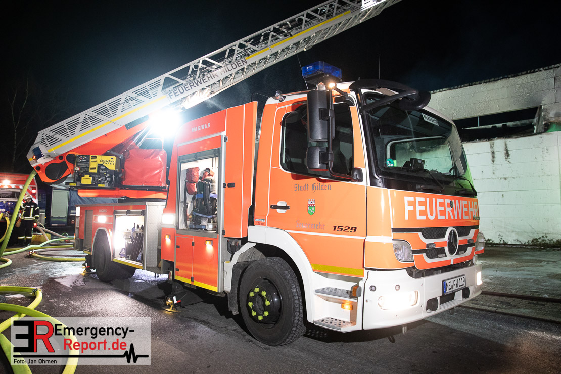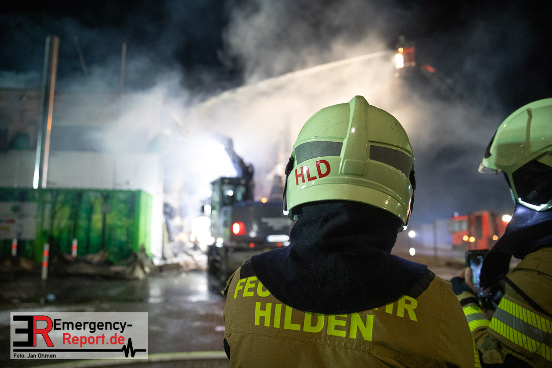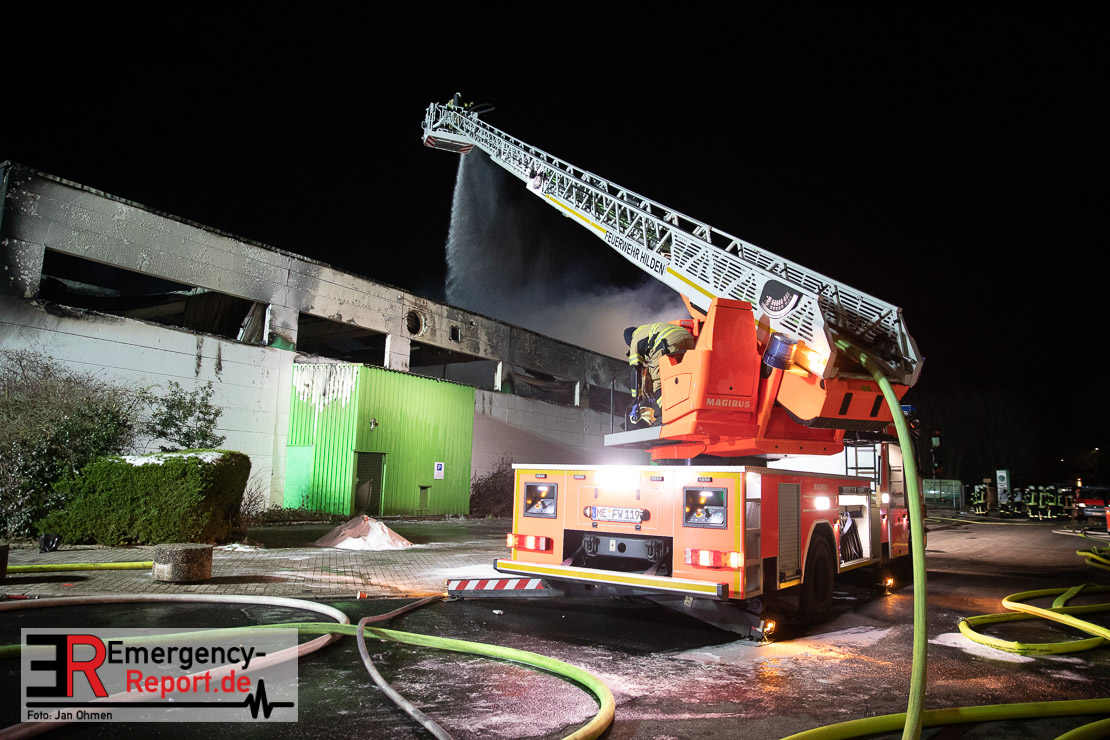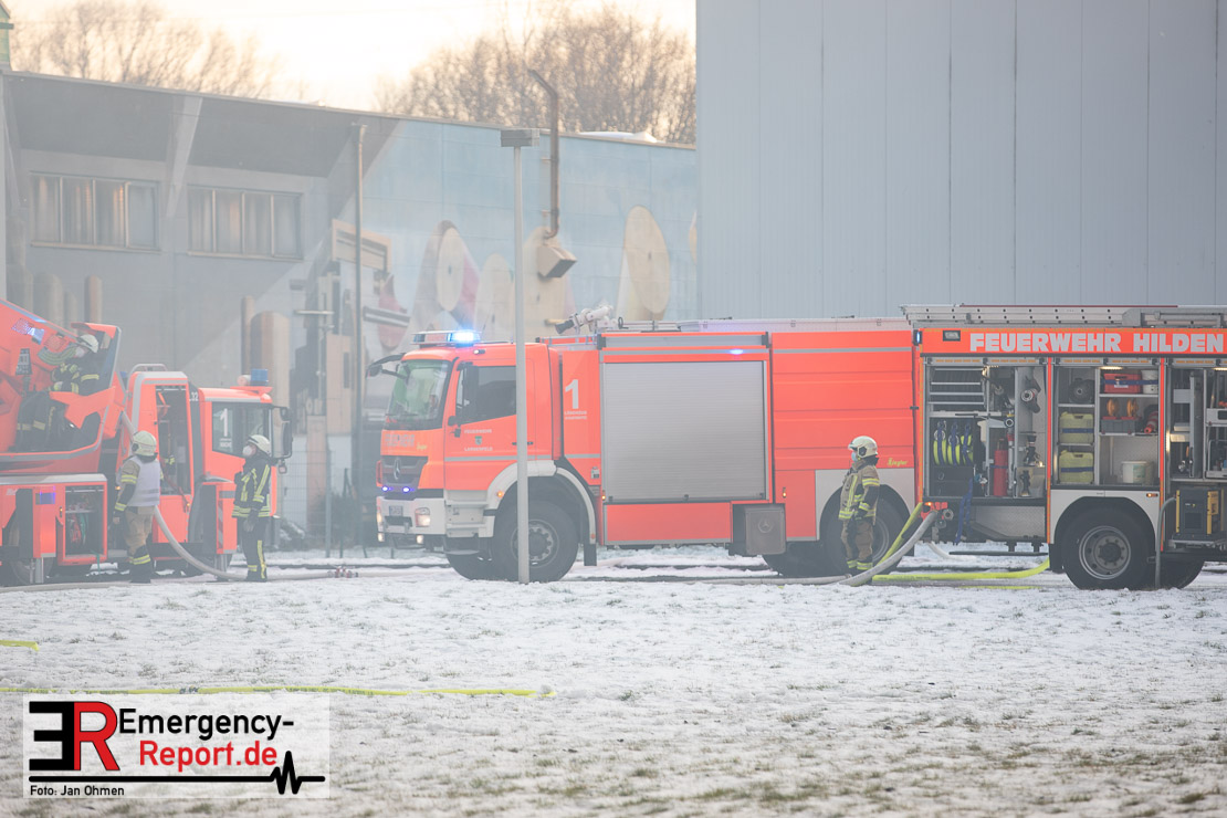 Der Großbrand im Gewerbebetrieb an der Heinrich-Hertz-Straße ist unter Kontrolle. Die Hildener Feuerwehr ist noch mit 22 größtenteils ehrenamtlichen Kräften vor Ort und mit den Nachlöscharbeiten beschäftigt. Im Laufe des heutigen Tages kommt ein Bagger zum Einsatz, um das Brandgut zu räumen. Die Kriminalpolizei hat die Ermittlung der Brandursache aufgenommen. Seit dem späten Nachmittag des gestrigen Tages ist die Feuerwehr im Einsatz. Unterstützung erhielt die Hildener Feuerwehr durch die Kreisleitstelle Mettmann und Kräfte aus Erkrath, Haan, Monheim, Langenfeld und Ratingen. Insgesamt waren ca. 120 Feuerwehrleute zeitgleich vor Ort. Da die gesamte Hildener Wehr im Einsatz war stellte die Haaner Feuerwehr für Hilden den Grundschutz sicher und war hier ebenfalls in weiteren Einsätzen tätig. In der Nacht hat die Monheimer mit der Ratinger Feuerwehr den Einsatz für ca. zweieinhalb Stunden komplett übernommen, damit die Feuerwehrleute aus Hilden eine Verschnaufpause hatten. Dies war nicht nur wegen der langen Einsatzdauer notwendig, sondern auch den eisigen Temperaturen geschuldet.