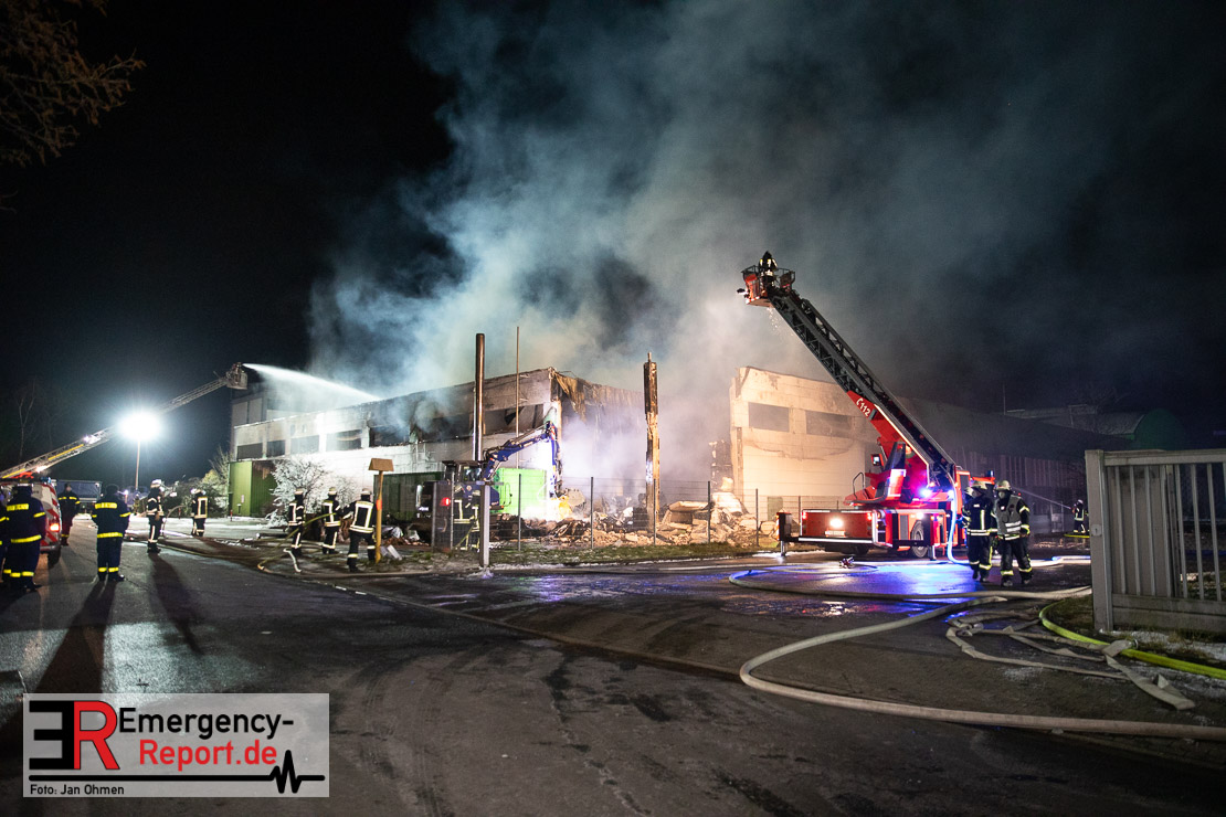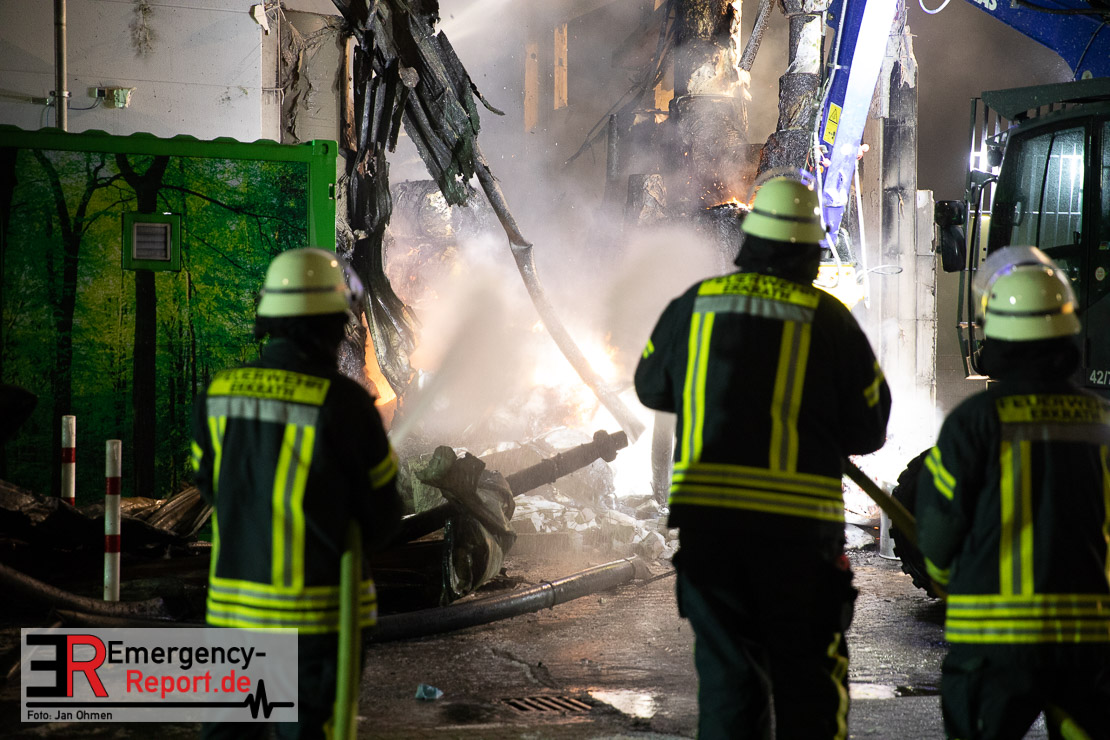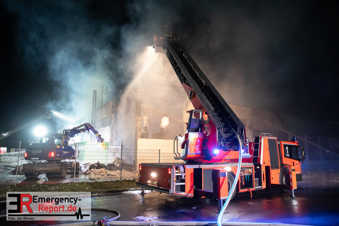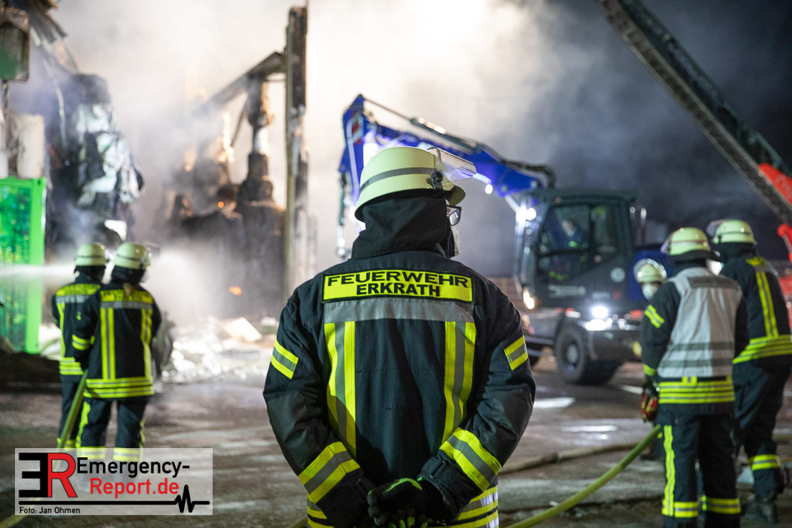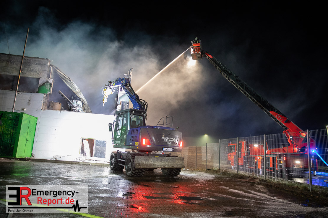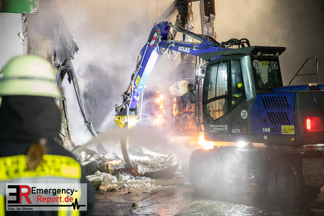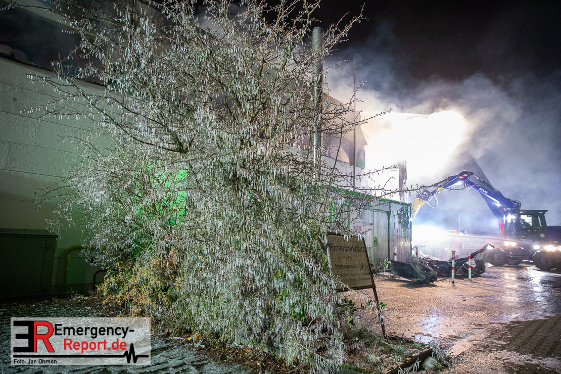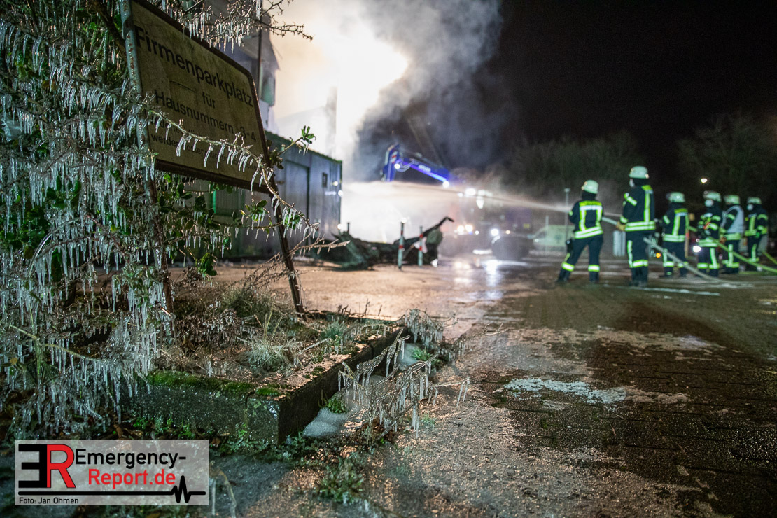 Der Großbrand im Gewerbebetrieb an der Heinrich-Hertz-Straße ist unter Kontrolle. Die Hildener Feuerwehr ist noch mit 22 größtenteils ehrenamtlichen Kräften vor Ort und mit den Nachlöscharbeiten beschäftigt. Im Laufe des heutigen Tages kommt ein Bagger zum Einsatz, um das Brandgut zu räumen. Die Kriminalpolizei hat die Ermittlung der Brandursache aufgenommen. Seit dem späten Nachmittag des gestrigen Tages ist die Feuerwehr im Einsatz. Unterstützung erhielt die Hildener Feuerwehr durch die Kreisleitstelle Mettmann und Kräfte aus Erkrath, Haan, Monheim, Langenfeld und Ratingen. Insgesamt waren ca. 120 Feuerwehrleute zeitgleich vor Ort. Da die gesamte Hildener Wehr im Einsatz war stellte die Haaner Feuerwehr für Hilden den Grundschutz sicher und war hier ebenfalls in weiteren Einsätzen tätig. In der Nacht hat die Monheimer mit der Ratinger Feuerwehr den Einsatz für ca. zweieinhalb Stunden komplett übernommen, damit die Feuerwehrleute aus Hilden eine Verschnaufpause hatten. Dies war nicht nur wegen der langen Einsatzdauer notwendig, sondern auch den eisigen Temperaturen geschuldet.