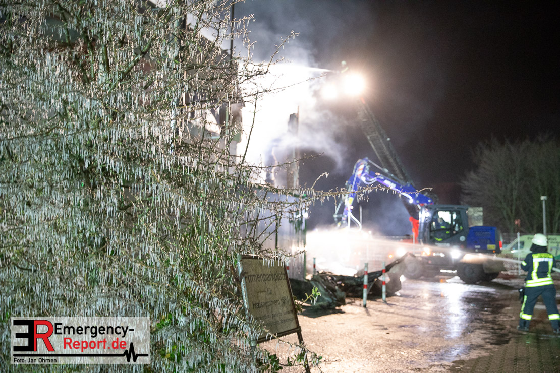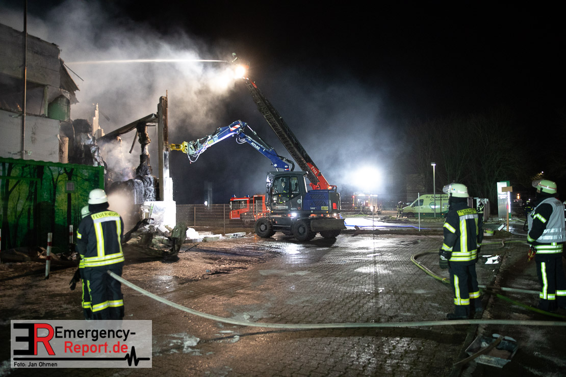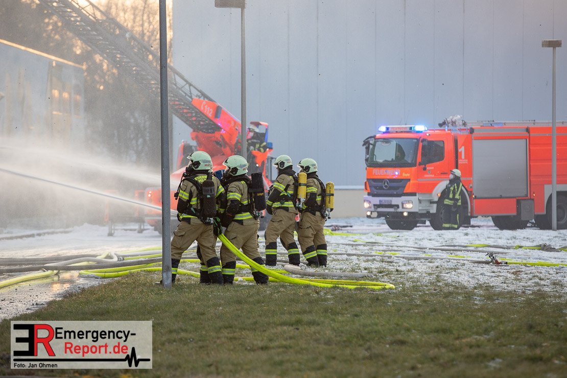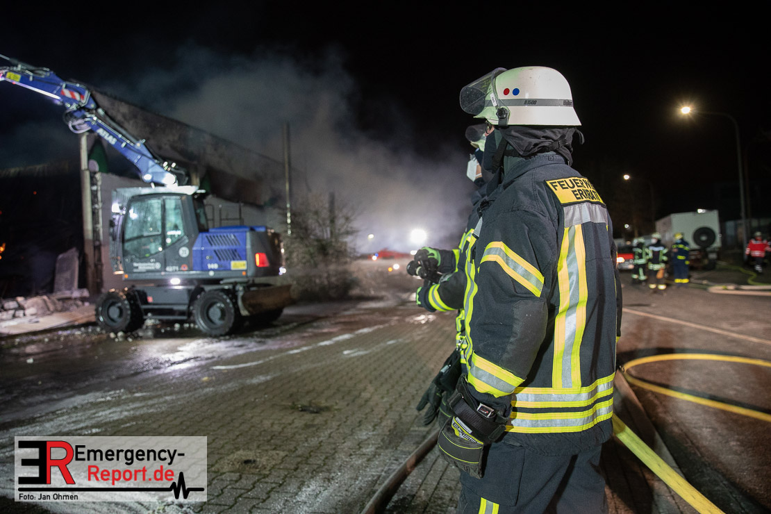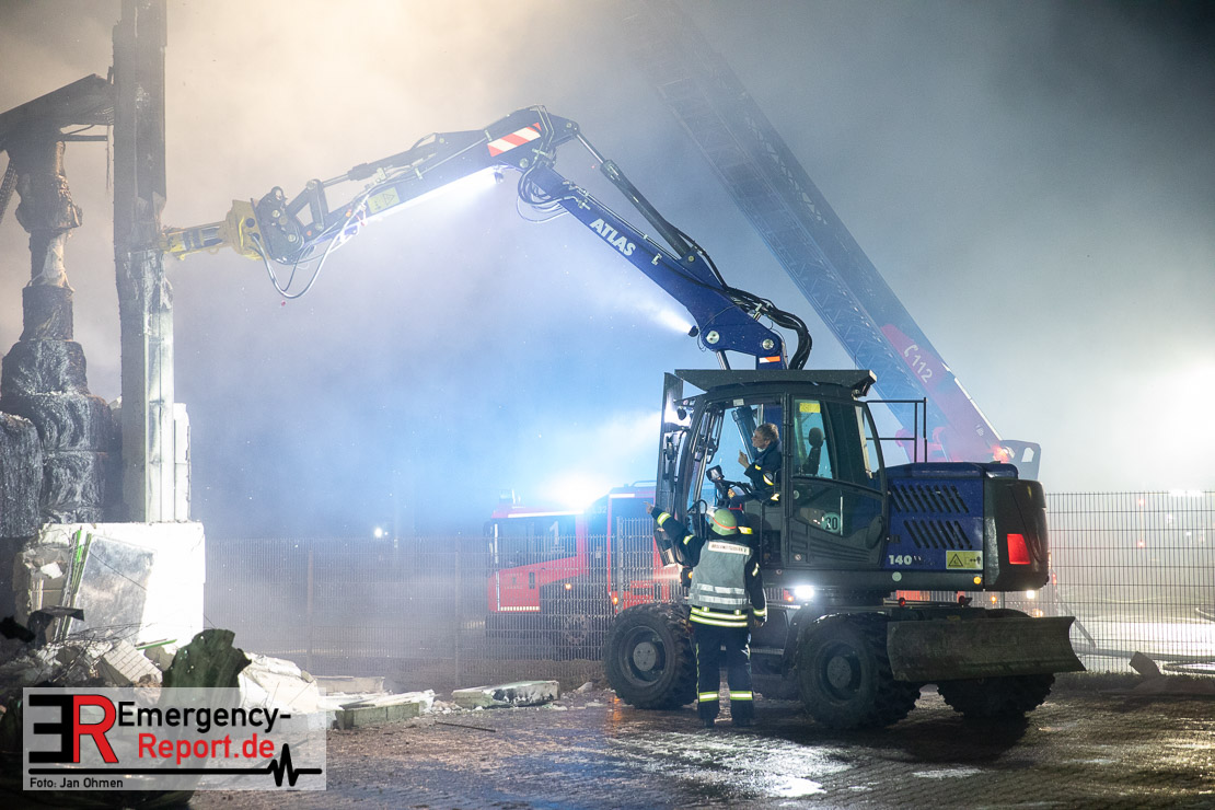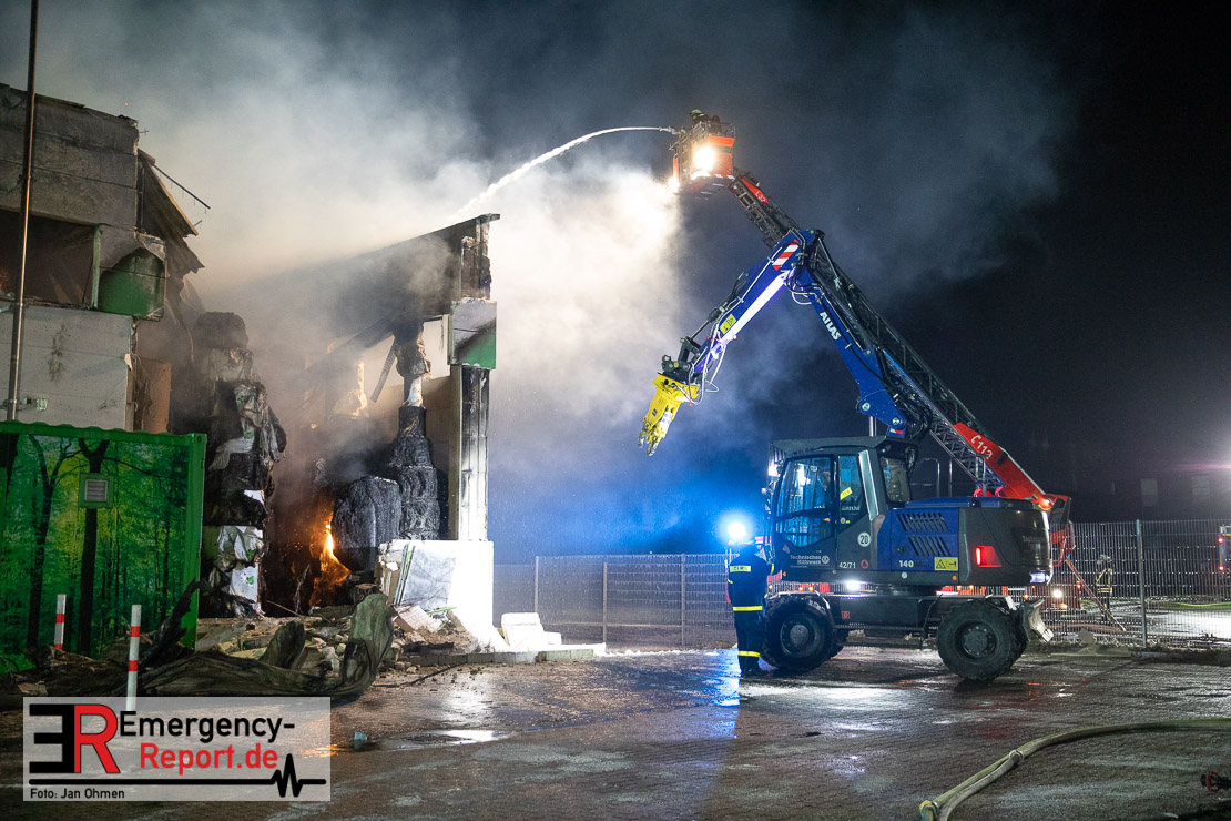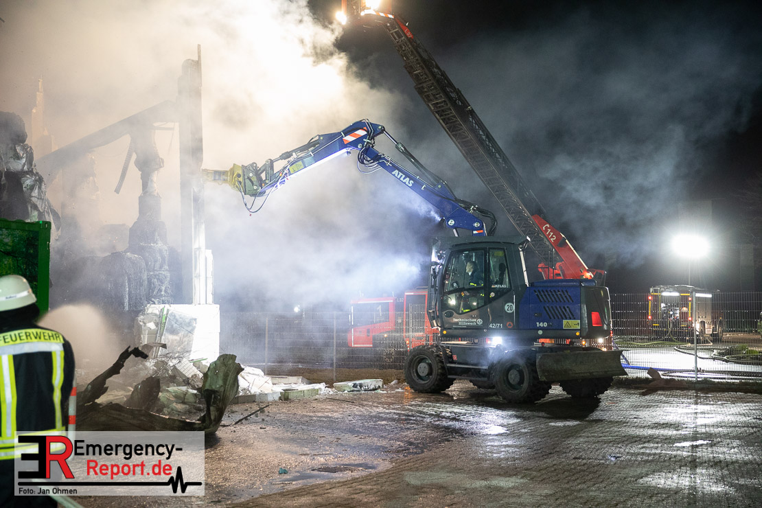 Der Großbrand im Gewerbebetrieb an der Heinrich-Hertz-Straße ist unter Kontrolle. Die Hildener Feuerwehr ist noch mit 22 größtenteils ehrenamtlichen Kräften vor Ort und mit den Nachlöscharbeiten beschäftigt. Im Laufe des heutigen Tages kommt ein Bagger zum Einsatz, um das Brandgut zu räumen. Die Kriminalpolizei hat die Ermittlung der Brandursache aufgenommen. Seit dem späten Nachmittag des gestrigen Tages ist die Feuerwehr im Einsatz. Unterstützung erhielt die Hildener Feuerwehr durch die Kreisleitstelle Mettmann und Kräfte aus Erkrath, Haan, Monheim, Langenfeld und Ratingen. Insgesamt waren ca. 120 Feuerwehrleute zeitgleich vor Ort. Da die gesamte Hildener Wehr im Einsatz war stellte die Haaner Feuerwehr für Hilden den Grundschutz sicher und war hier ebenfalls in weiteren Einsätzen tätig. In der Nacht hat die Monheimer mit der Ratinger Feuerwehr den Einsatz für ca. zweieinhalb Stunden komplett übernommen, damit die Feuerwehrleute aus Hilden eine Verschnaufpause hatten. Dies war nicht nur wegen der langen Einsatzdauer notwendig, sondern auch den eisigen Temperaturen geschuldet.