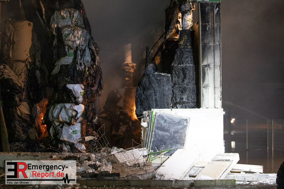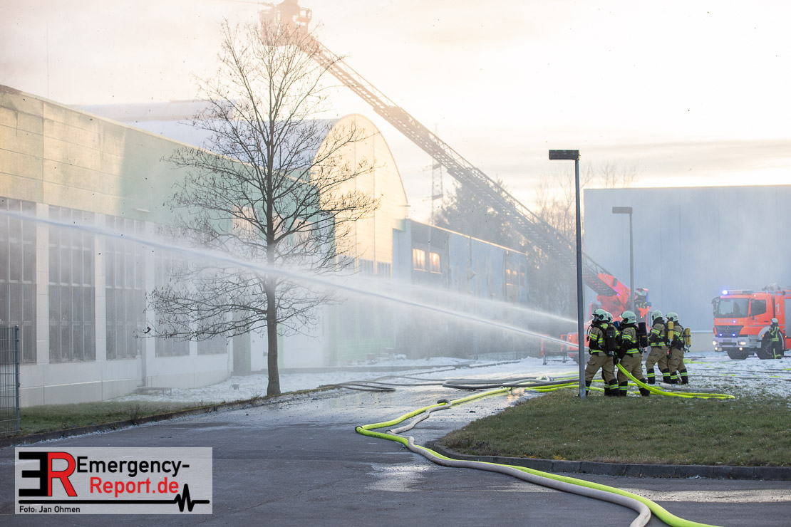 Der Großbrand im Gewerbebetrieb an der Heinrich-Hertz-Straße ist unter Kontrolle. Die Hildener Feuerwehr ist noch mit 22 größtenteils ehrenamtlichen Kräften vor Ort und mit den Nachlöscharbeiten beschäftigt. Im Laufe des heutigen Tages kommt ein Bagger zum Einsatz, um das Brandgut zu räumen. Die Kriminalpolizei hat die Ermittlung der Brandursache aufgenommen. Seit dem späten Nachmittag des gestrigen Tages ist die Feuerwehr im Einsatz. Unterstützung erhielt die Hildener Feuerwehr durch die Kreisleitstelle Mettmann und Kräfte aus Erkrath, Haan, Monheim, Langenfeld und Ratingen. Insgesamt waren ca. 120 Feuerwehrleute zeitgleich vor Ort. Da die gesamte Hildener Wehr im Einsatz war stellte die Haaner Feuerwehr für Hilden den Grundschutz sicher und war hier ebenfalls in weiteren Einsätzen tätig. In der Nacht hat die Monheimer mit der Ratinger Feuerwehr den Einsatz für ca. zweieinhalb Stunden komplett übernommen, damit die Feuerwehrleute aus Hilden eine Verschnaufpause hatten. Dies war nicht nur wegen der langen Einsatzdauer notwendig, sondern auch den eisigen Temperaturen geschuldet.