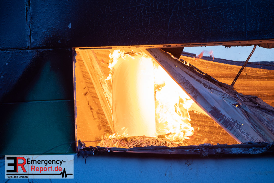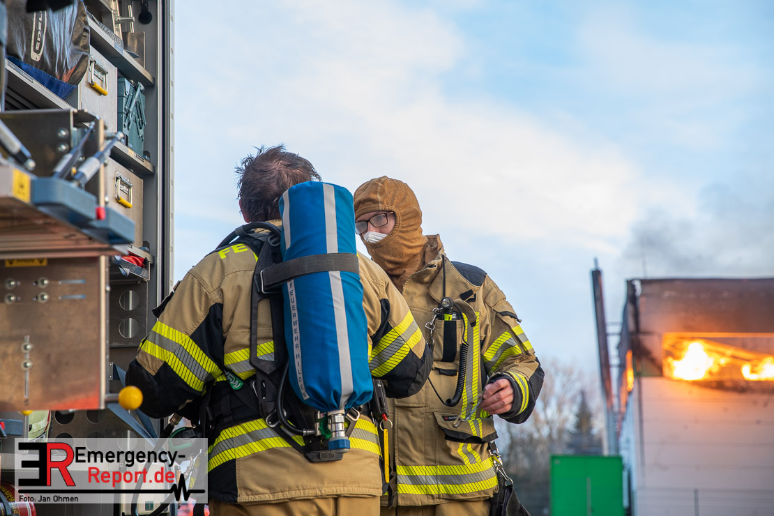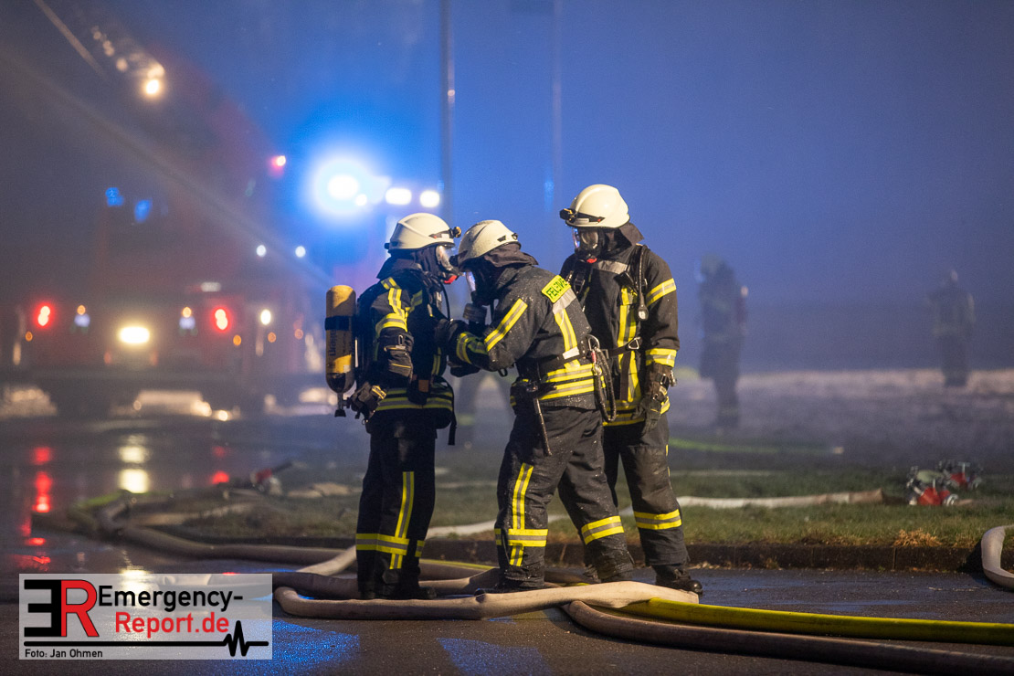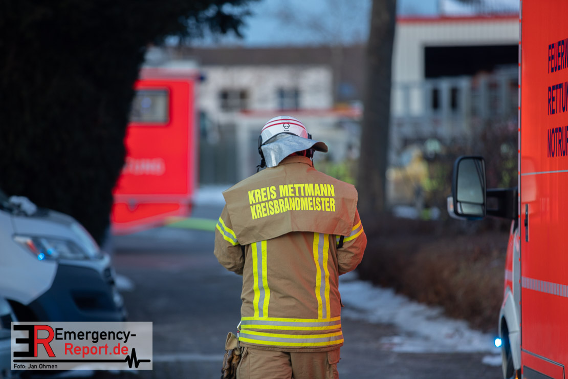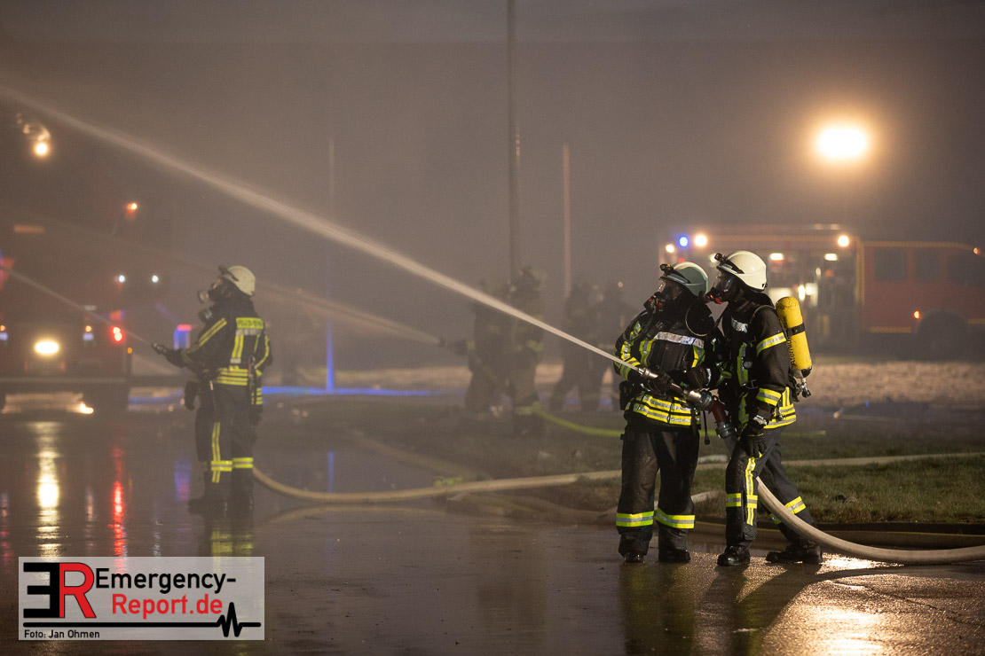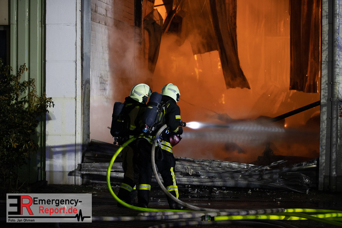 Die Lagerhalle mit den Abmaßen 40 m x 50 m stand in Vollbrand, sodass umgehend überörtliche Unterstützung angefordert wurde. Aufgrund der starken Rauchentwicklung wurde die Bevölkerung über die Warnapp Nina gewarnt. Die Feuerwehr Hilden wird aktuell überörtlich durch Einsatzkräfte der Feuerwehr Erkrath (Löschzug-überörtlich), Feuerwehr Langenfeld (Löschgruppe-überörtlich) sowie durch eine Löschgruppe der Feuerwehr Haan, die den Grundschutz für das Stadtgebiet Hilden auf der Feuer- und Rettungswache Hilden sicherstellt, unterstützt. Des Weiteren befindet sich der Messzug des Kreises Mettmann, der sich aus den Feuerwehren Ratingen und Velbert zusammensetzt im Einsatz.Der Brand ist unter Kontrolle. Aktuell laufen noch aufwändige Nachlöscharbeiten, die sich voraussichtlich noch bis in den frühen Morgen hinziehen werden. Im Einsatz befinden sich zurzeit über 120 Einsatzkräfte der Feuerwehren sowie das THW, das für die Nacht zum Ausleuchten der Einsatzstelle alarmiert wurde. Die Verpflegung wird durch das DRK sichergestellt.