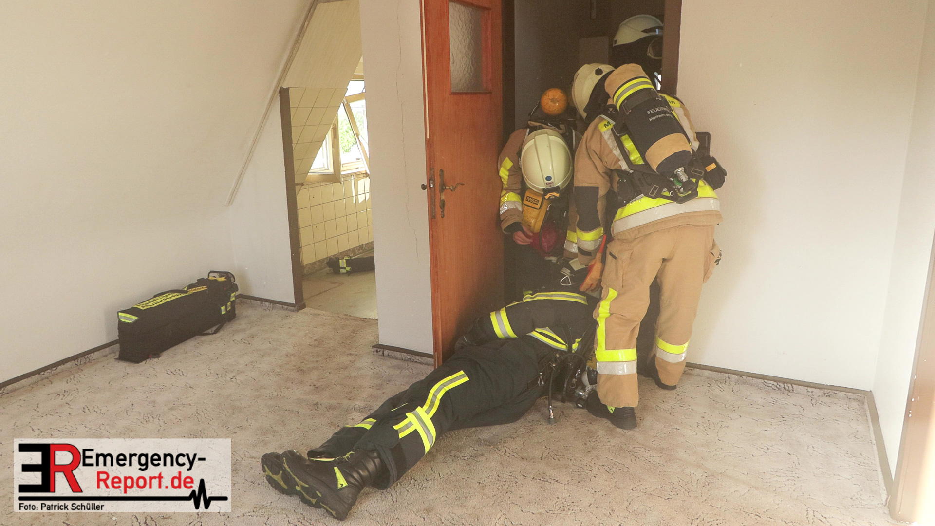 wurde ein Atemschutznotfall geübt. Es galt einen bewusstlosen Feuerwehrmann, aus dem 1. Obergeschoss, durch den Sicherheitstrupp, zu retten.
