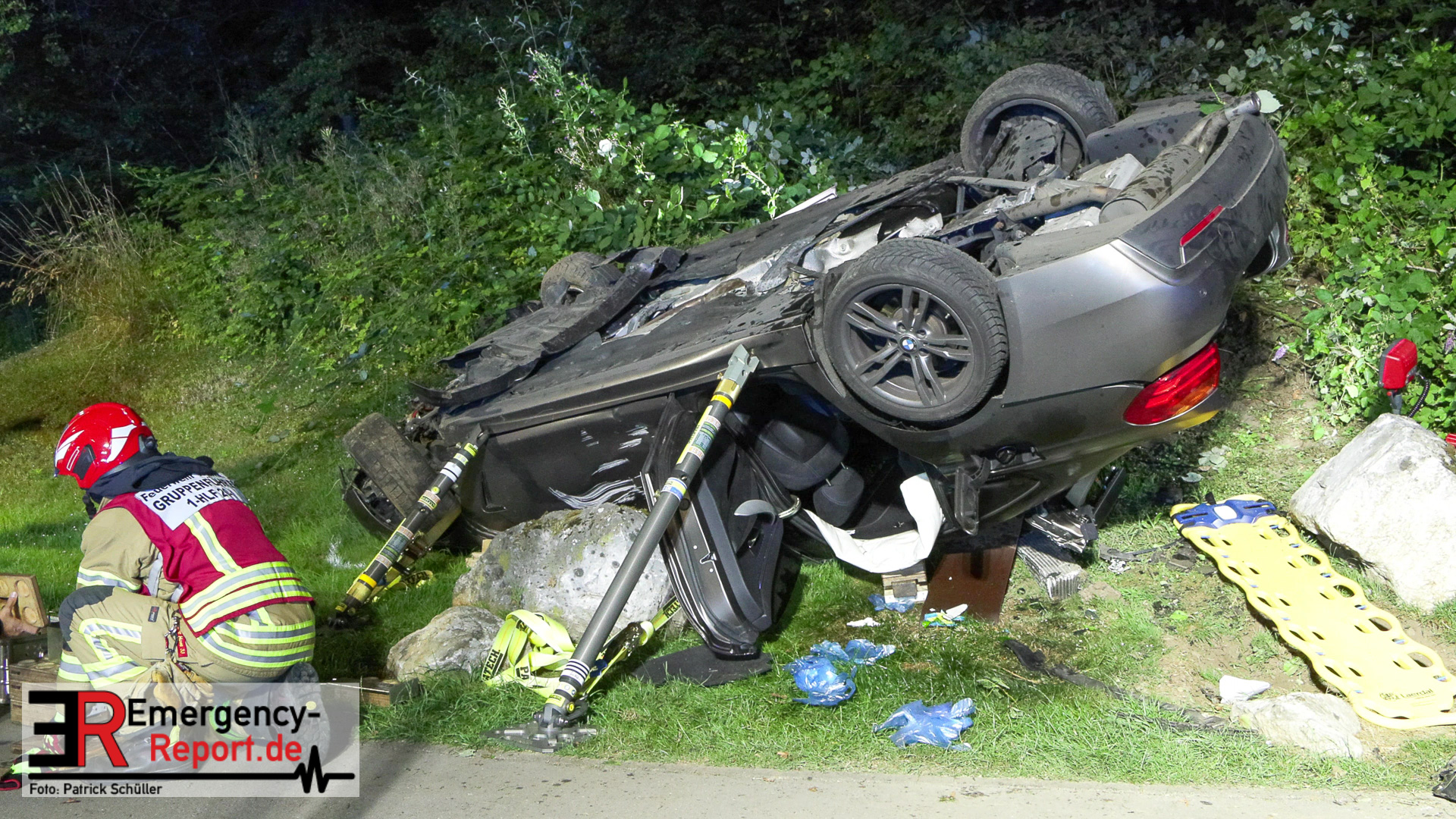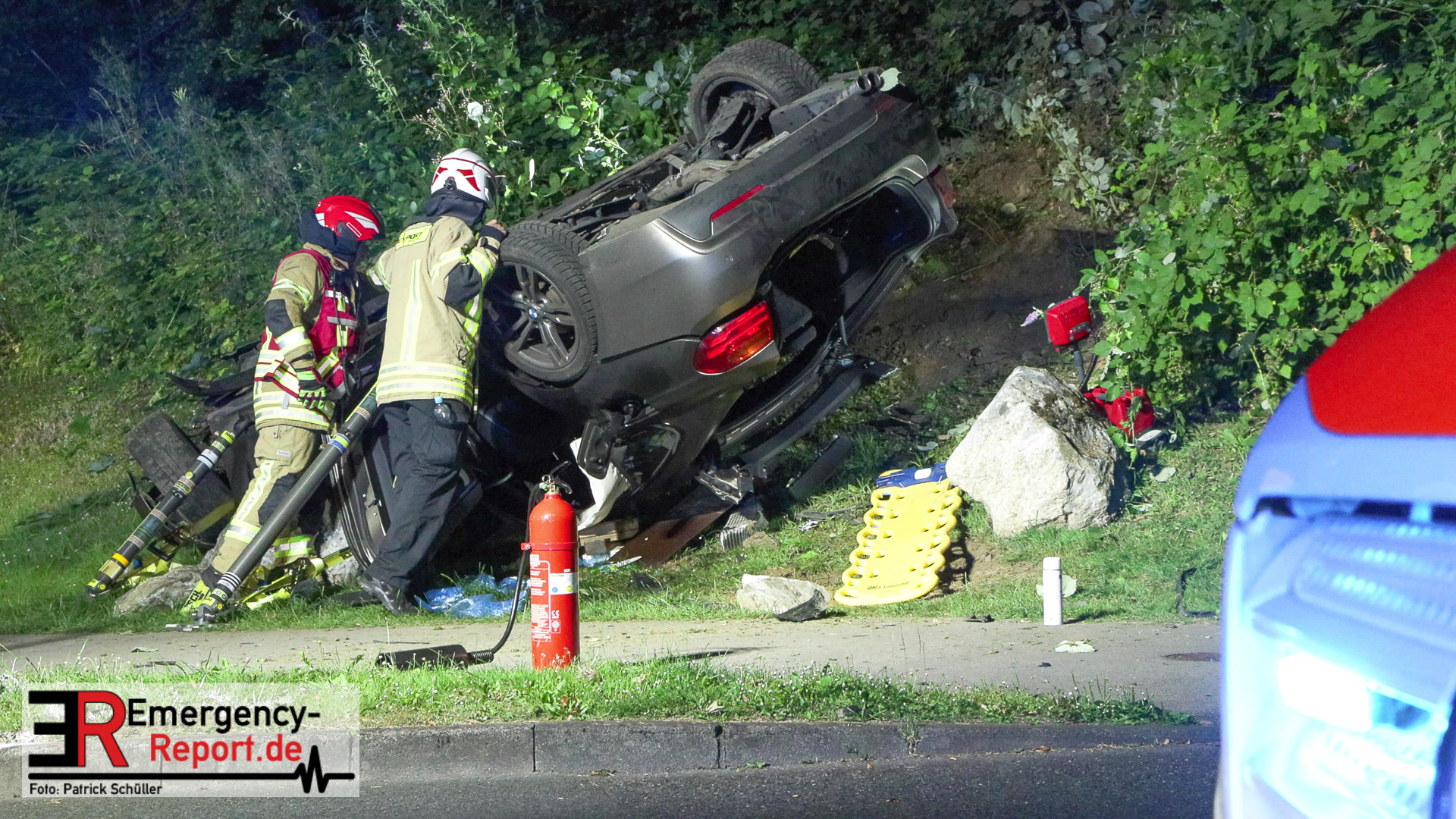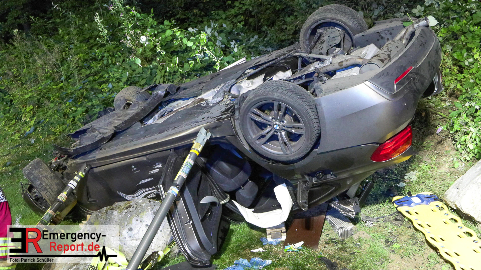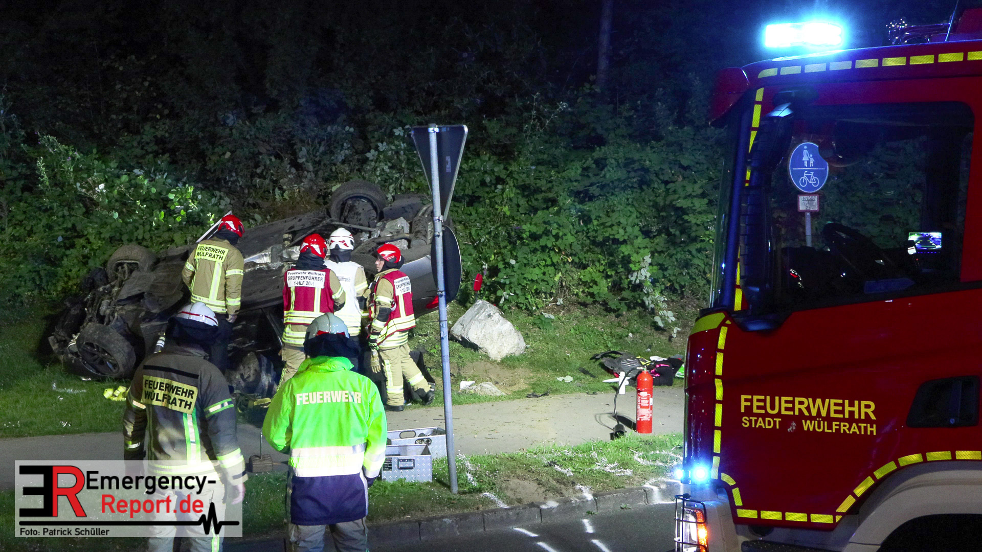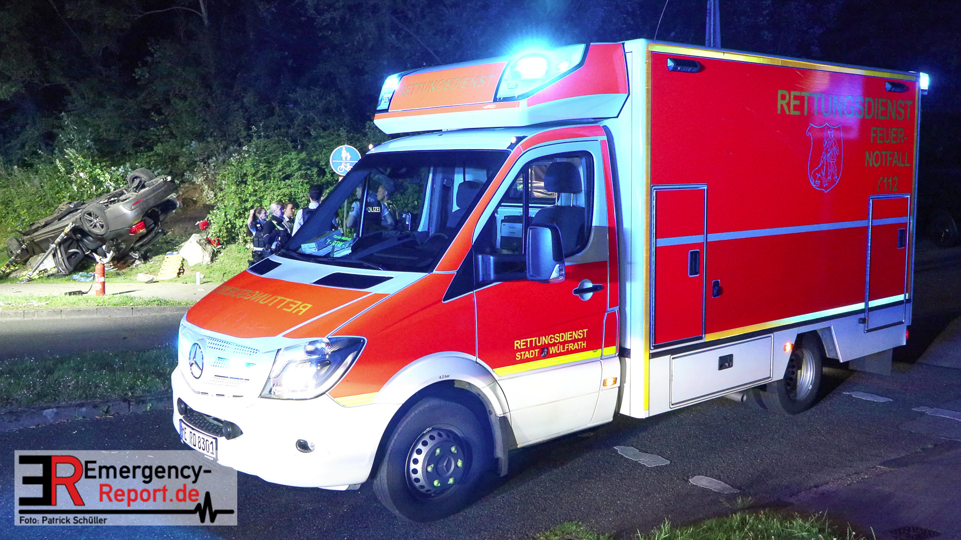 Am nächtlichen Freitagmorgen des 15.07.2022, gegen 03.00 Uhr, befuhr ein 40-jähriger Mann aus Wülfrath, mit seinem dunkelbraunen PKW BMW 420d, die innerörtliche Wilhelmstraße in Wülfrath, aus Richtung Innenstadt kommend, in Fahrtrichtung Velbert / Wuppertal. Bei der Einfahrt in den Kreisverkehr Hammerstein verlor der BMW-Fahrer nach eigenen Angaben die Kontrolle über sein Fahrzeug. Der BMW prallte auf den Bordstein der Mittelinsel und schleuderte über die begrünte Mittelfläche. Dann kam das Fahrzeug kurz zurück auf die Fahrbahn des Kreisverkehrs, bevor er in Höhe der Ausfahrt zum Wanderparkplatz über den dortigen Grünstreifen und Gehweg in die Böschung schleuderte und sich dabei überschlug. Auf dem Dach liegend kam der BMW dort zum Stillstand. In diesem Augenblick setzte ein automatisches Info-System des BMWs sofort einen Alarm an eine Notrufzentrale ab, welche die örtlichen Rettungskräfte alarmierte.