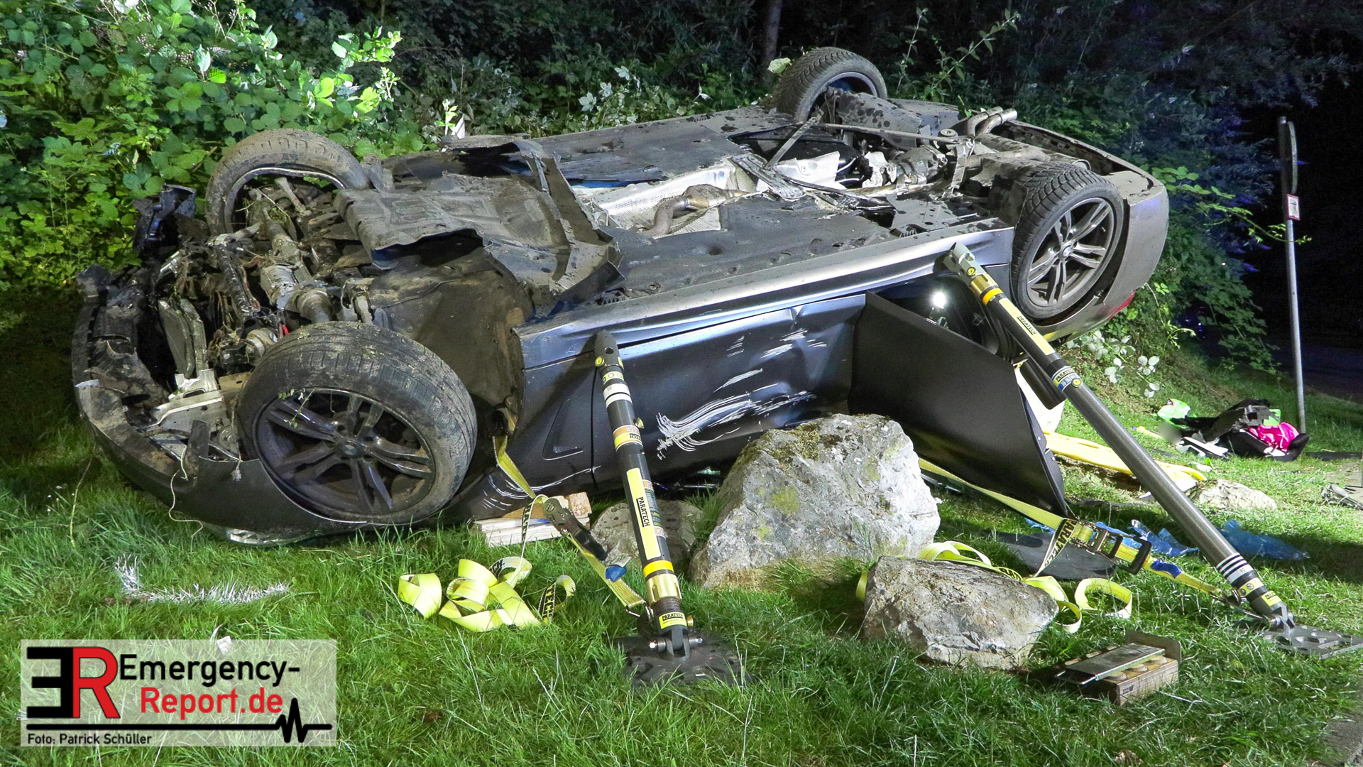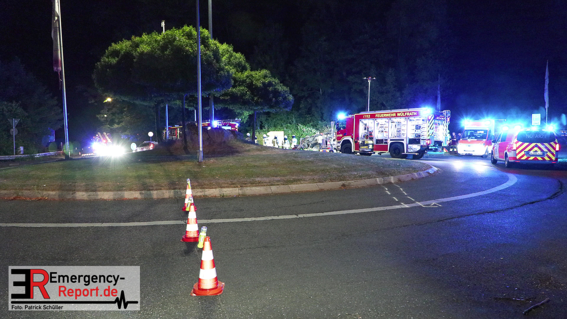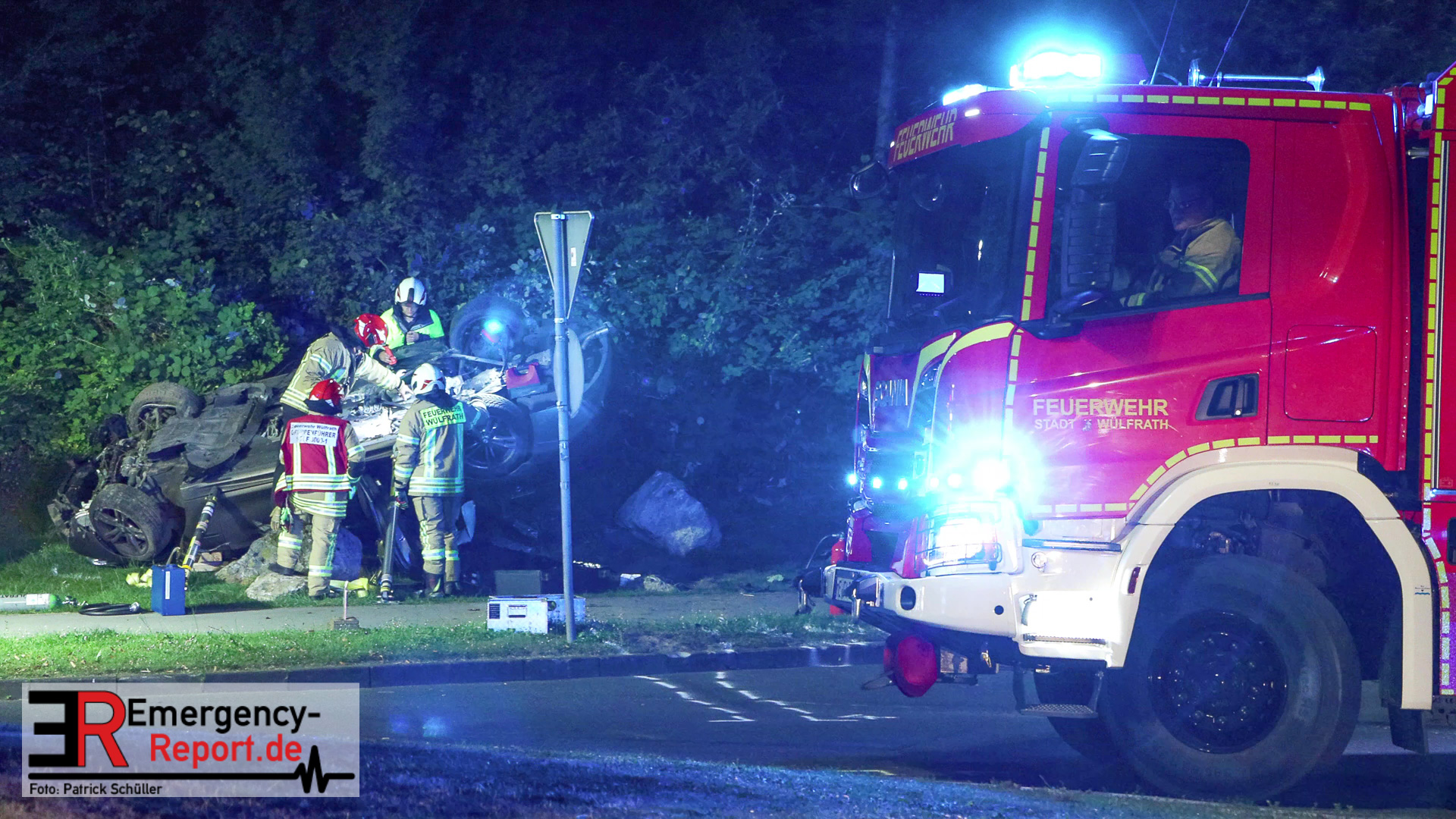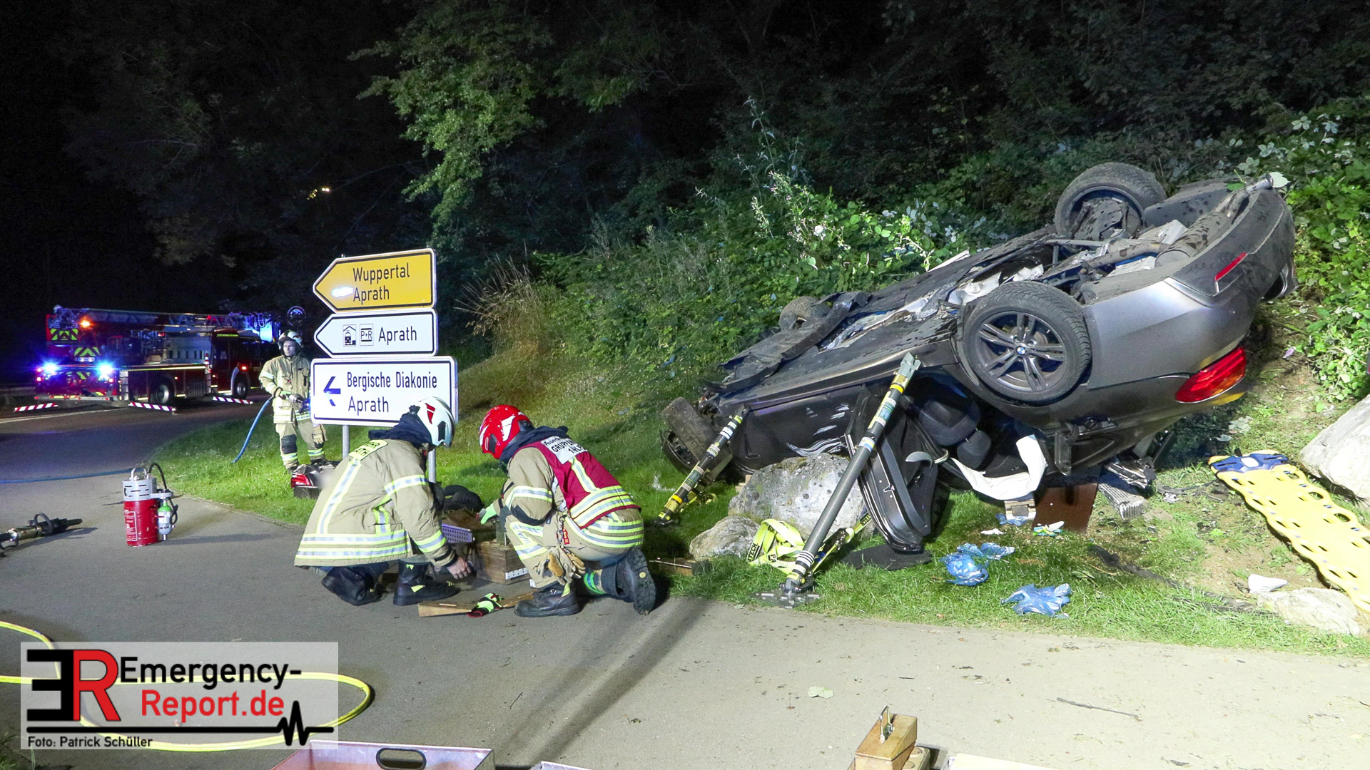 Am nächtlichen Freitagmorgen des 15.07.2022, gegen 03.00 Uhr, befuhr ein 40-jähriger Mann aus Wülfrath, mit seinem dunkelbraunen PKW BMW 420d, die innerörtliche Wilhelmstraße in Wülfrath, aus Richtung Innenstadt kommend, in Fahrtrichtung Velbert / Wuppertal. Bei der Einfahrt in den Kreisverkehr Hammerstein verlor der BMW-Fahrer nach eigenen Angaben die Kontrolle über sein Fahrzeug. Der BMW prallte auf den Bordstein der Mittelinsel und schleuderte über die begrünte Mittelfläche. Dann kam das Fahrzeug kurz zurück auf die Fahrbahn des Kreisverkehrs, bevor er in Höhe der Ausfahrt zum Wanderparkplatz über den dortigen Grünstreifen und Gehweg in die Böschung schleuderte und sich dabei überschlug. Auf dem Dach liegend kam der BMW dort zum Stillstand. In diesem Augenblick setzte ein automatisches Info-System des BMWs sofort einen Alarm an eine Notrufzentrale ab, welche die örtlichen Rettungskräfte alarmierte.