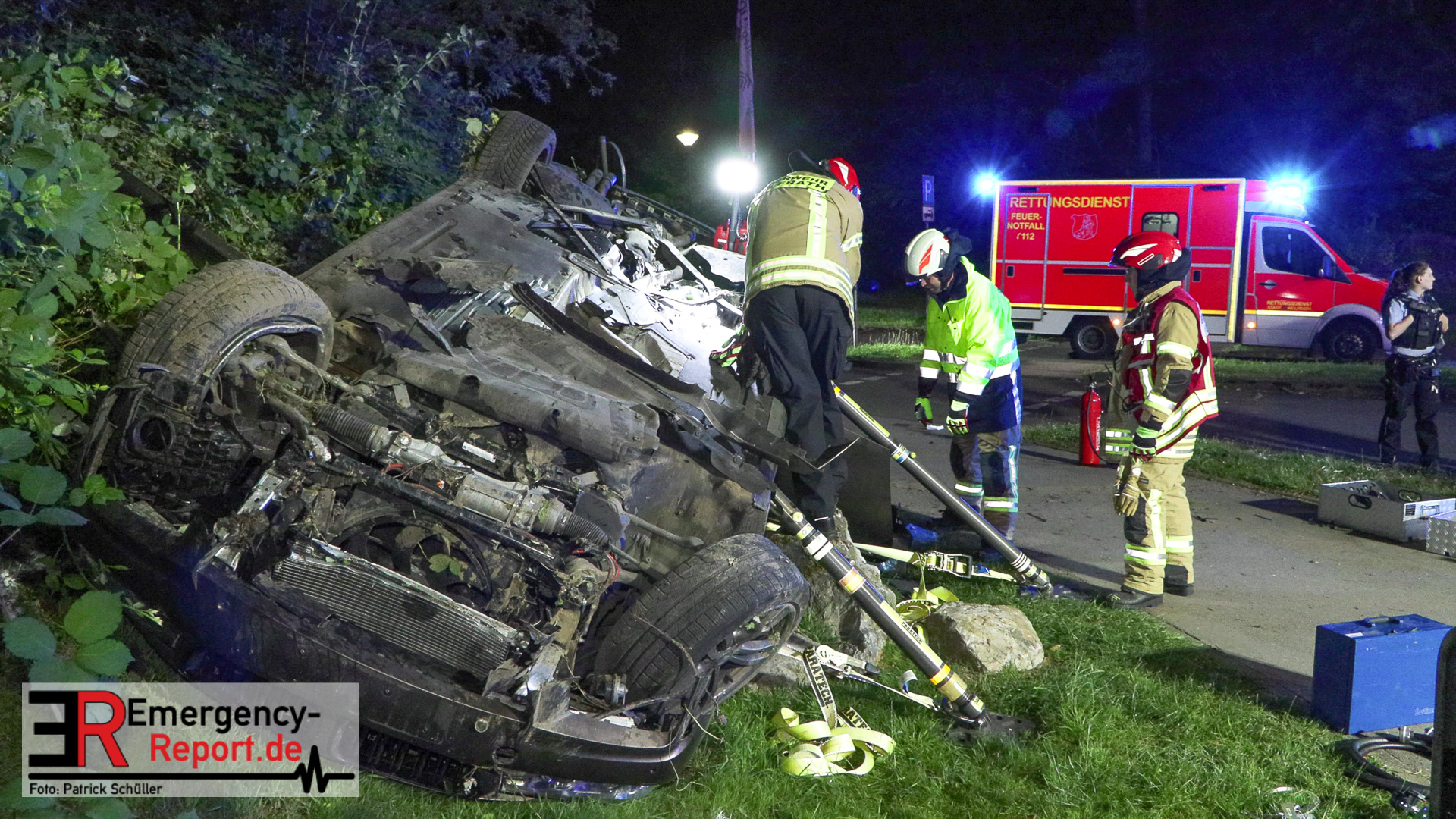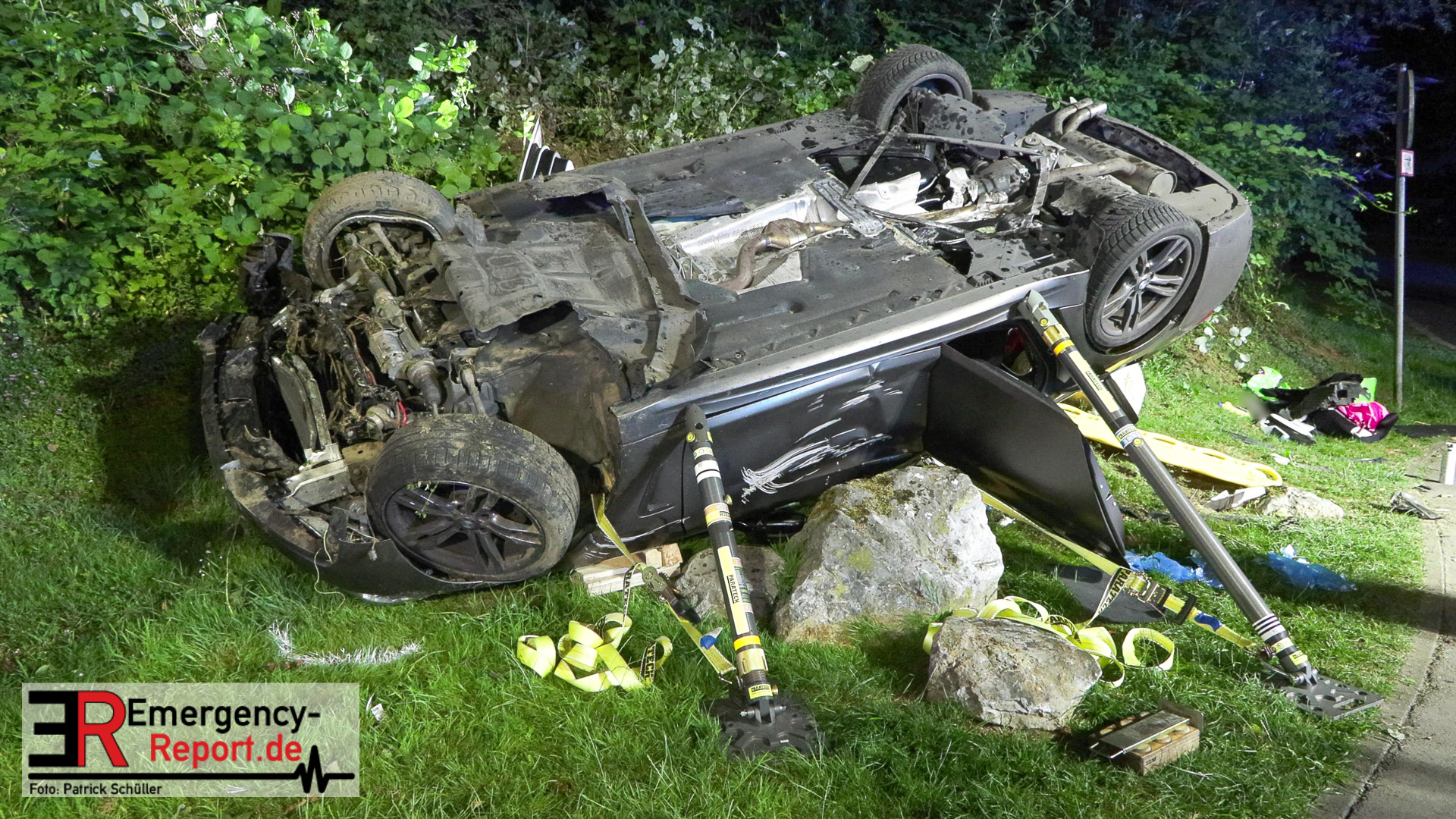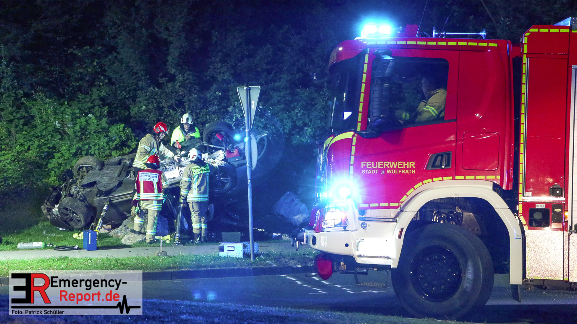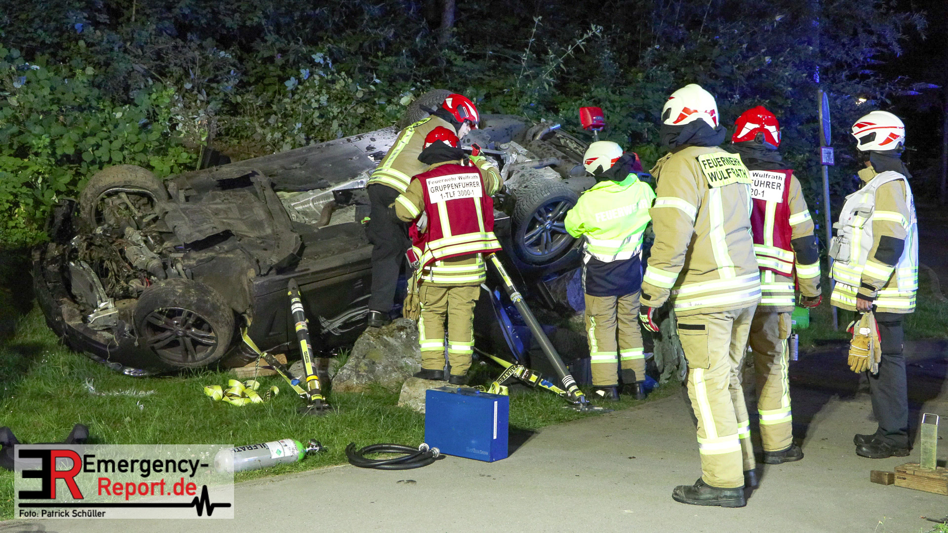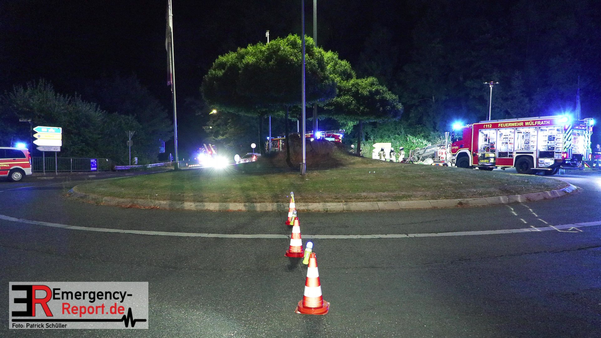 Am nächtlichen Freitagmorgen des 15.07.2022, gegen 03.00 Uhr, befuhr ein 40-jähriger Mann aus Wülfrath, mit seinem dunkelbraunen PKW BMW 420d, die innerörtliche Wilhelmstraße in Wülfrath, aus Richtung Innenstadt kommend, in Fahrtrichtung Velbert / Wuppertal. Bei der Einfahrt in den Kreisverkehr Hammerstein verlor der BMW-Fahrer nach eigenen Angaben die Kontrolle über sein Fahrzeug. Der BMW prallte auf den Bordstein der Mittelinsel und schleuderte über die begrünte Mittelfläche. Dann kam das Fahrzeug kurz zurück auf die Fahrbahn des Kreisverkehrs, bevor er in Höhe der Ausfahrt zum Wanderparkplatz über den dortigen Grünstreifen und Gehweg in die Böschung schleuderte und sich dabei überschlug. Auf dem Dach liegend kam der BMW dort zum Stillstand. In diesem Augenblick setzte ein automatisches Info-System des BMWs sofort einen Alarm an eine Notrufzentrale ab, welche die örtlichen Rettungskräfte alarmierte.