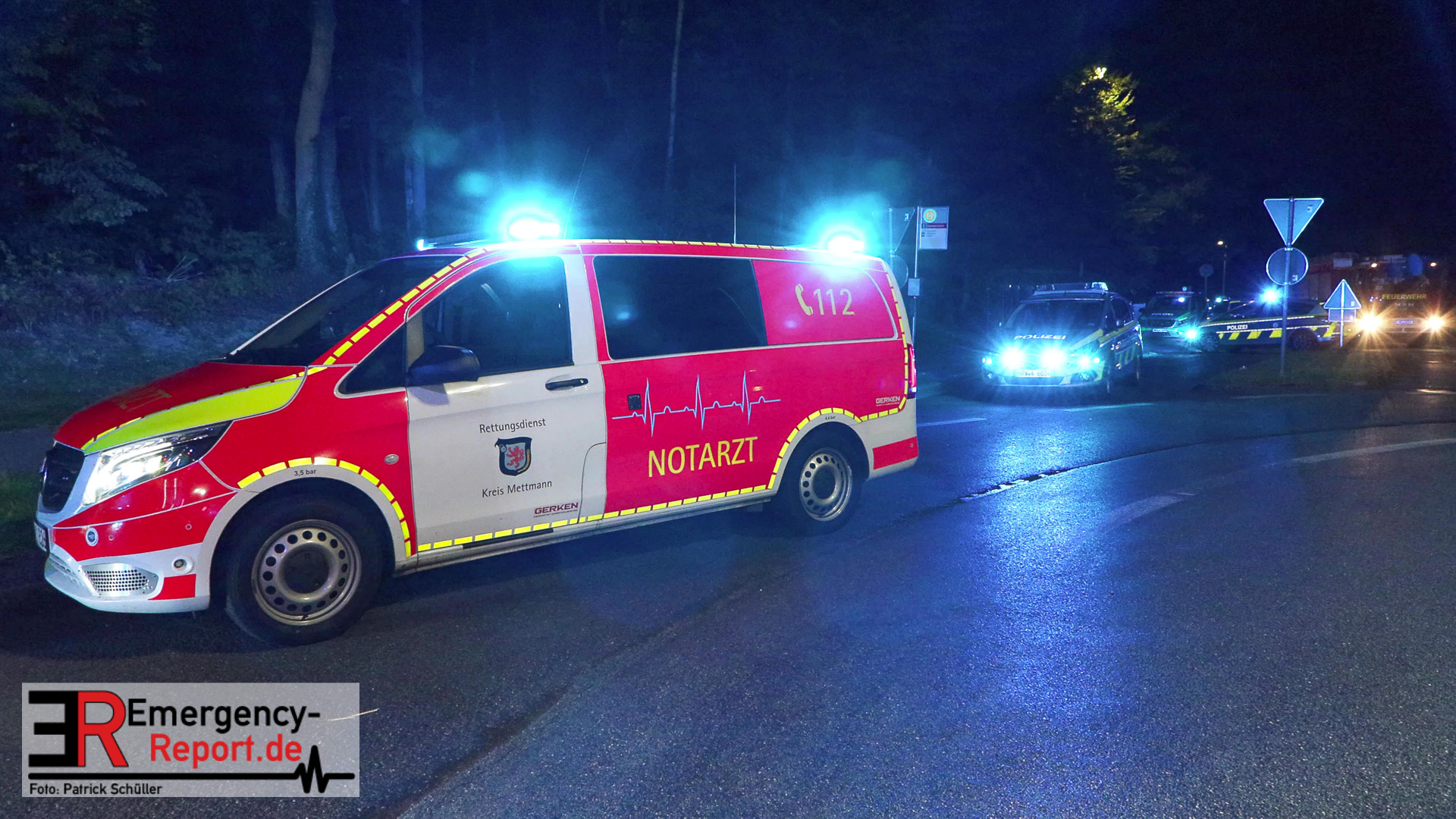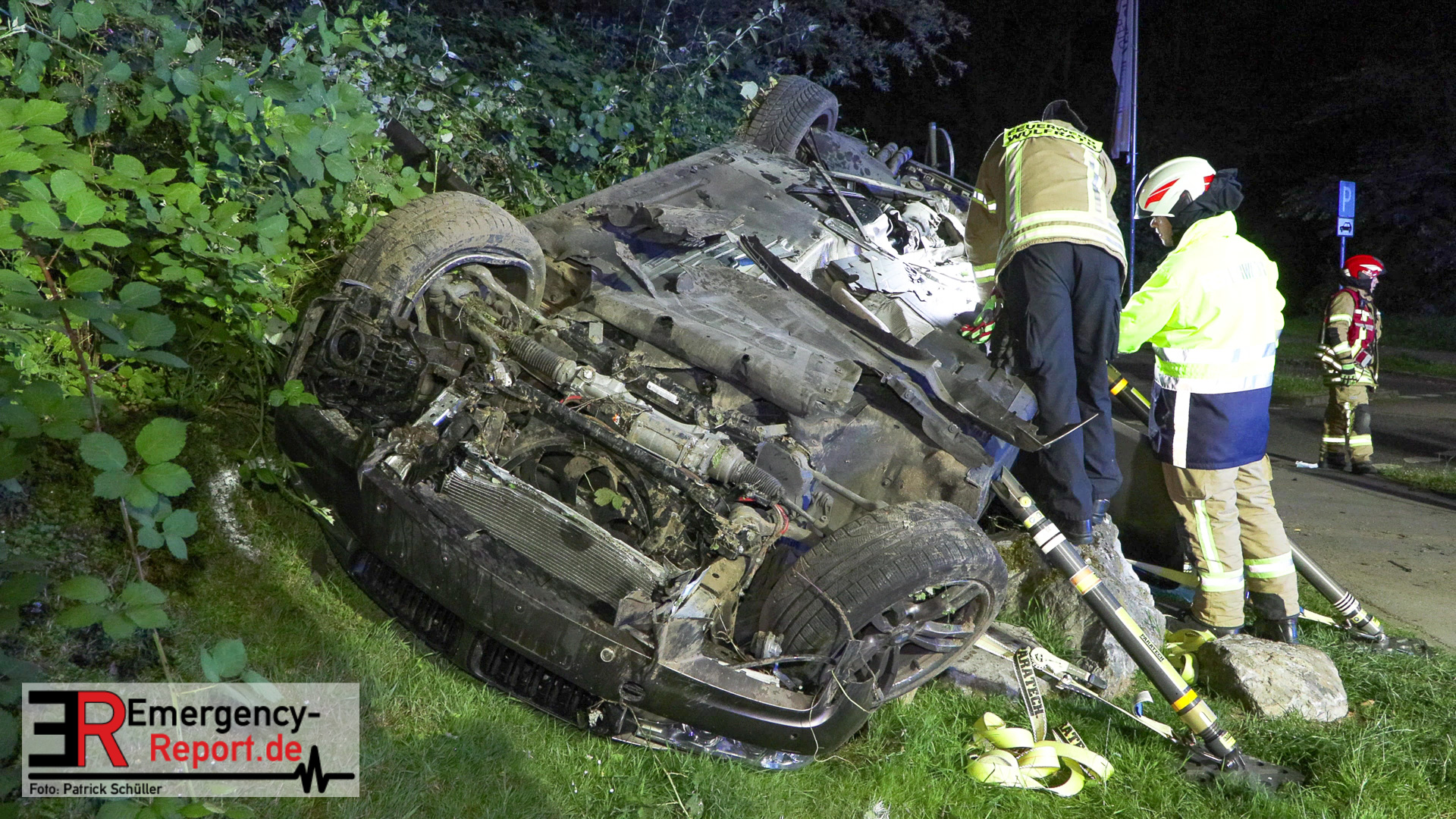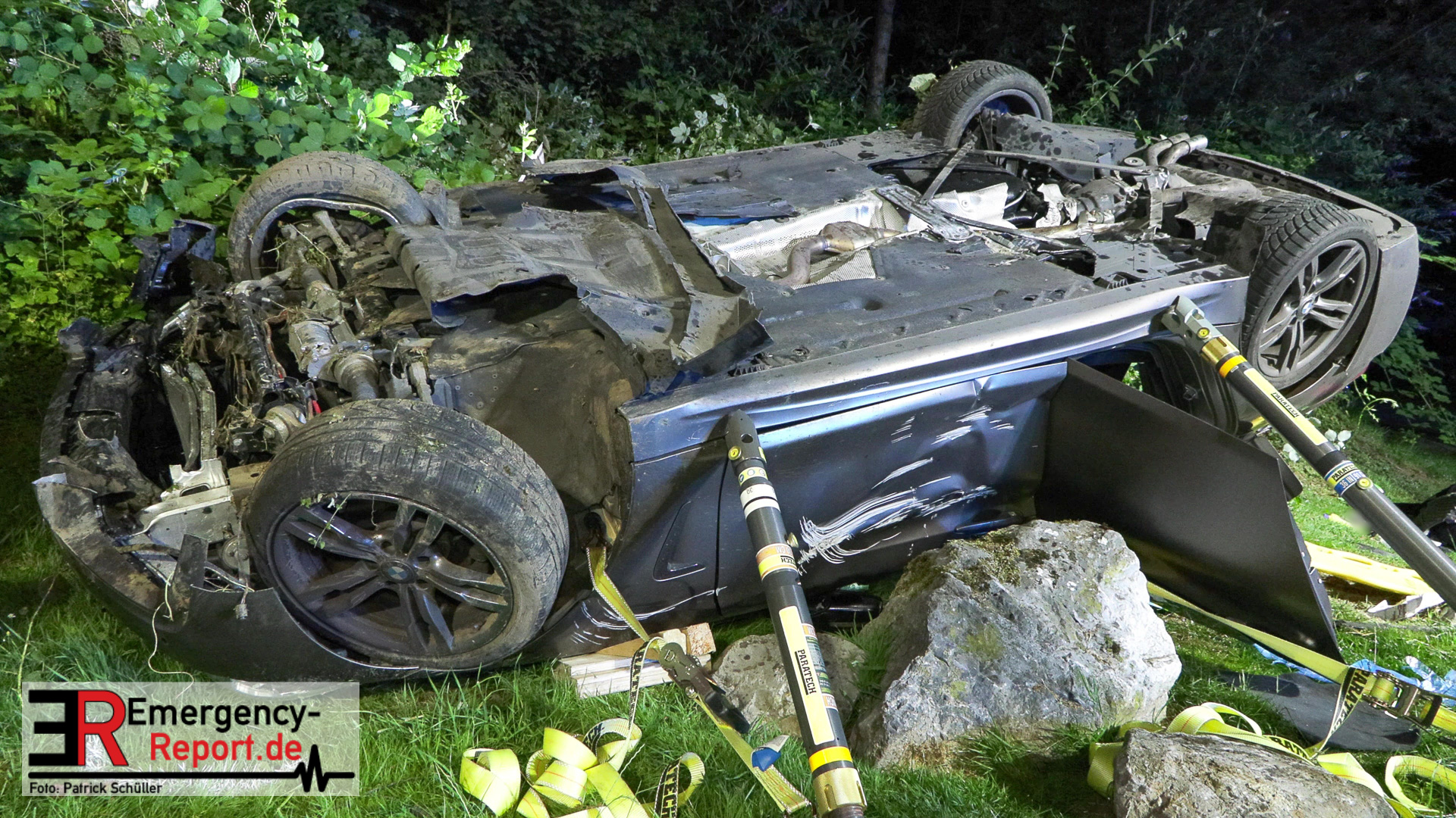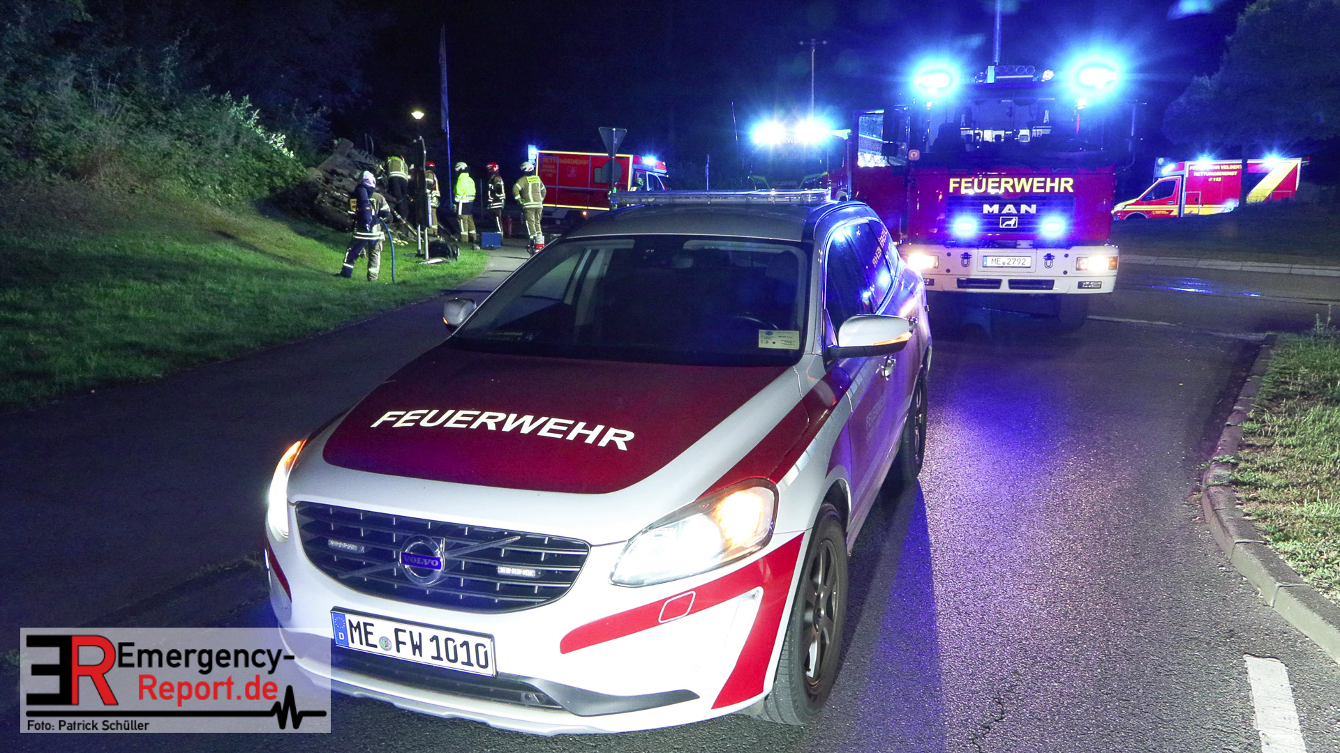 Am nächtlichen Freitagmorgen des 15.07.2022, gegen 03.00 Uhr, befuhr ein 40-jähriger Mann aus Wülfrath, mit seinem dunkelbraunen PKW BMW 420d, die innerörtliche Wilhelmstraße in Wülfrath, aus Richtung Innenstadt kommend, in Fahrtrichtung Velbert / Wuppertal. Bei der Einfahrt in den Kreisverkehr Hammerstein verlor der BMW-Fahrer nach eigenen Angaben die Kontrolle über sein Fahrzeug. Der BMW prallte auf den Bordstein der Mittelinsel und schleuderte über die begrünte Mittelfläche. Dann kam das Fahrzeug kurz zurück auf die Fahrbahn des Kreisverkehrs, bevor er in Höhe der Ausfahrt zum Wanderparkplatz über den dortigen Grünstreifen und Gehweg in die Böschung schleuderte und sich dabei überschlug. Auf dem Dach liegend kam der BMW dort zum Stillstand. In diesem Augenblick setzte ein automatisches Info-System des BMWs sofort einen Alarm an eine Notrufzentrale ab, welche die örtlichen Rettungskräfte alarmierte.