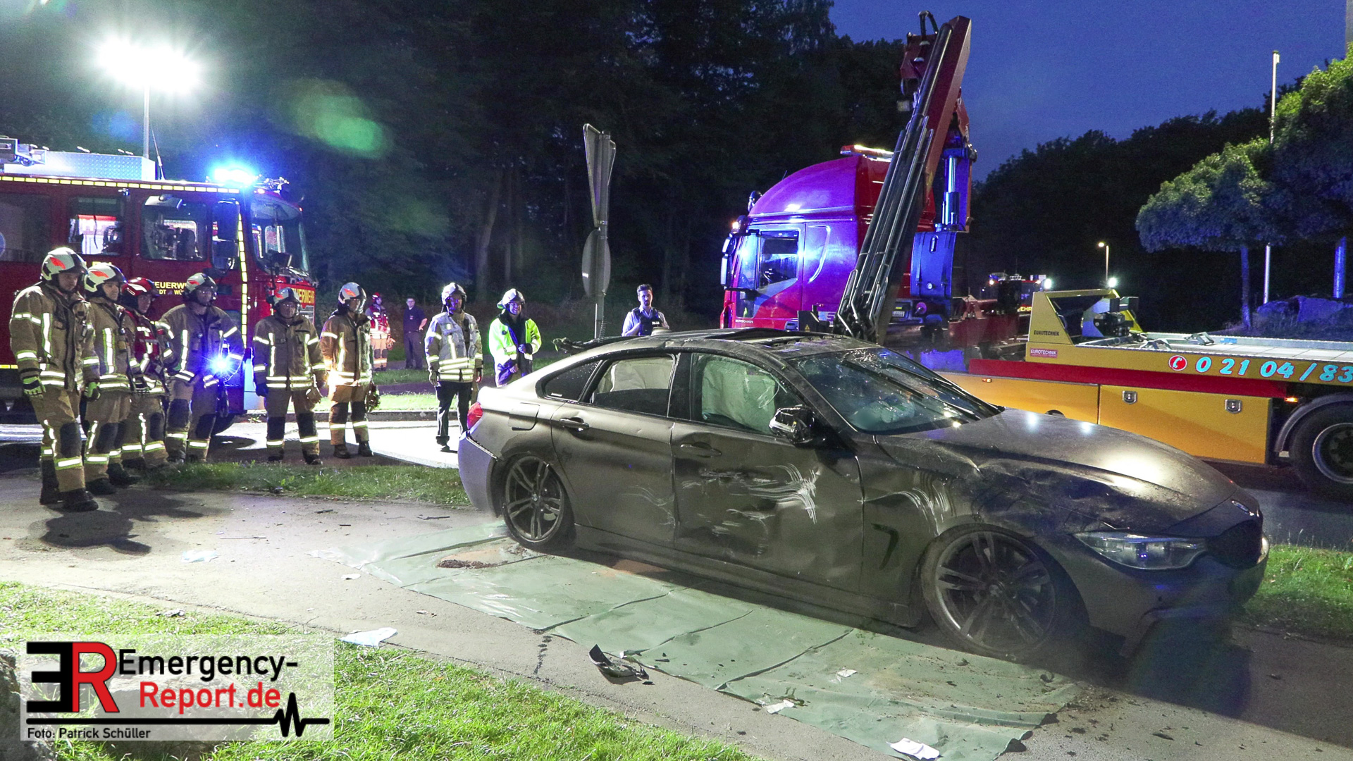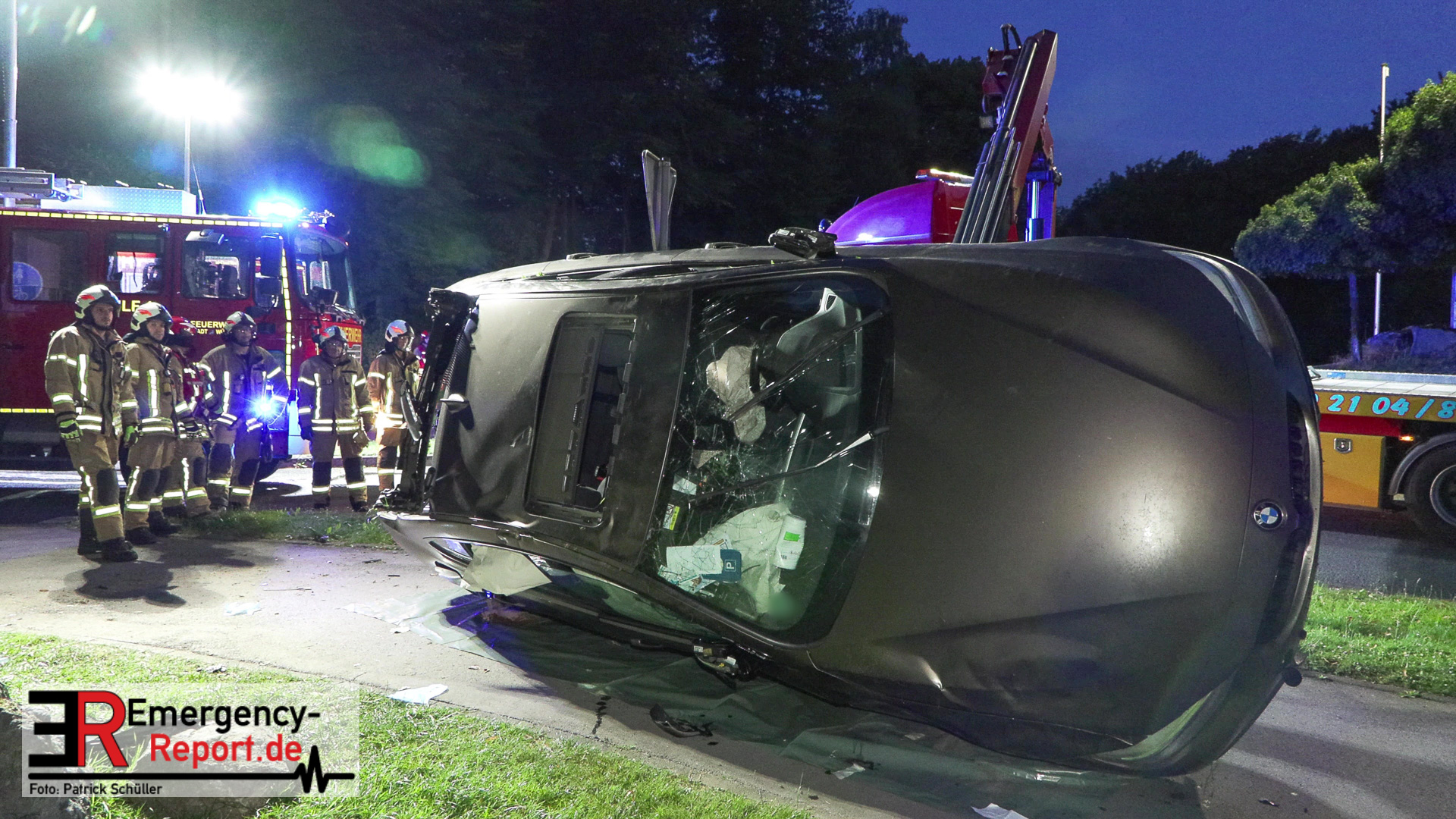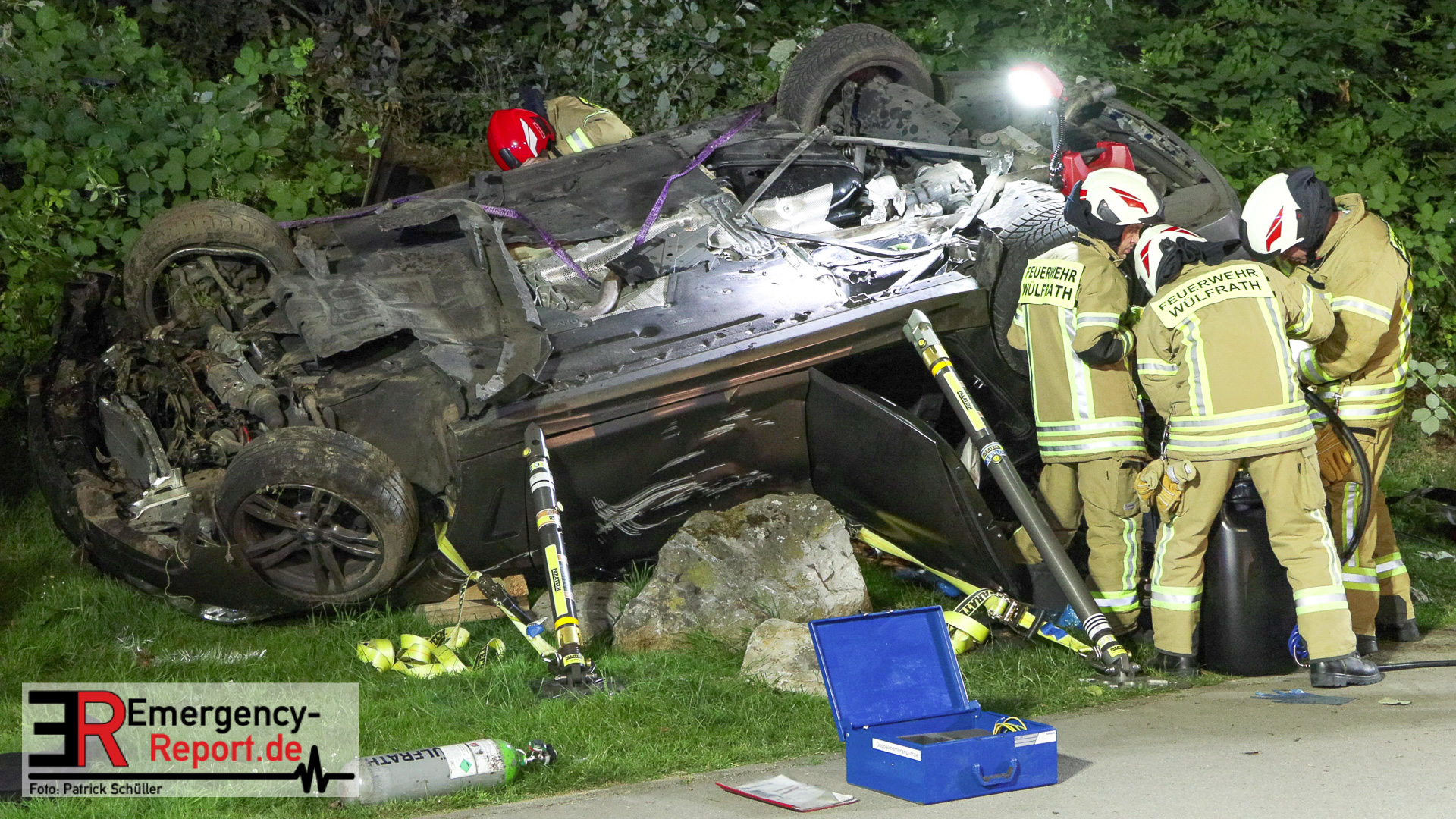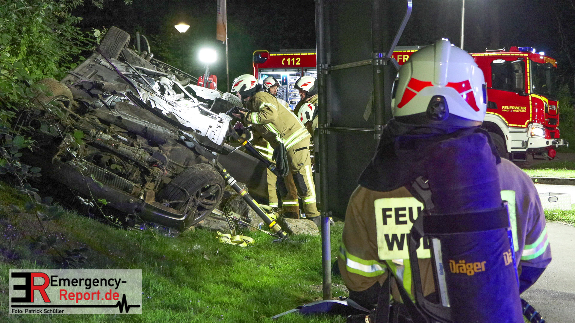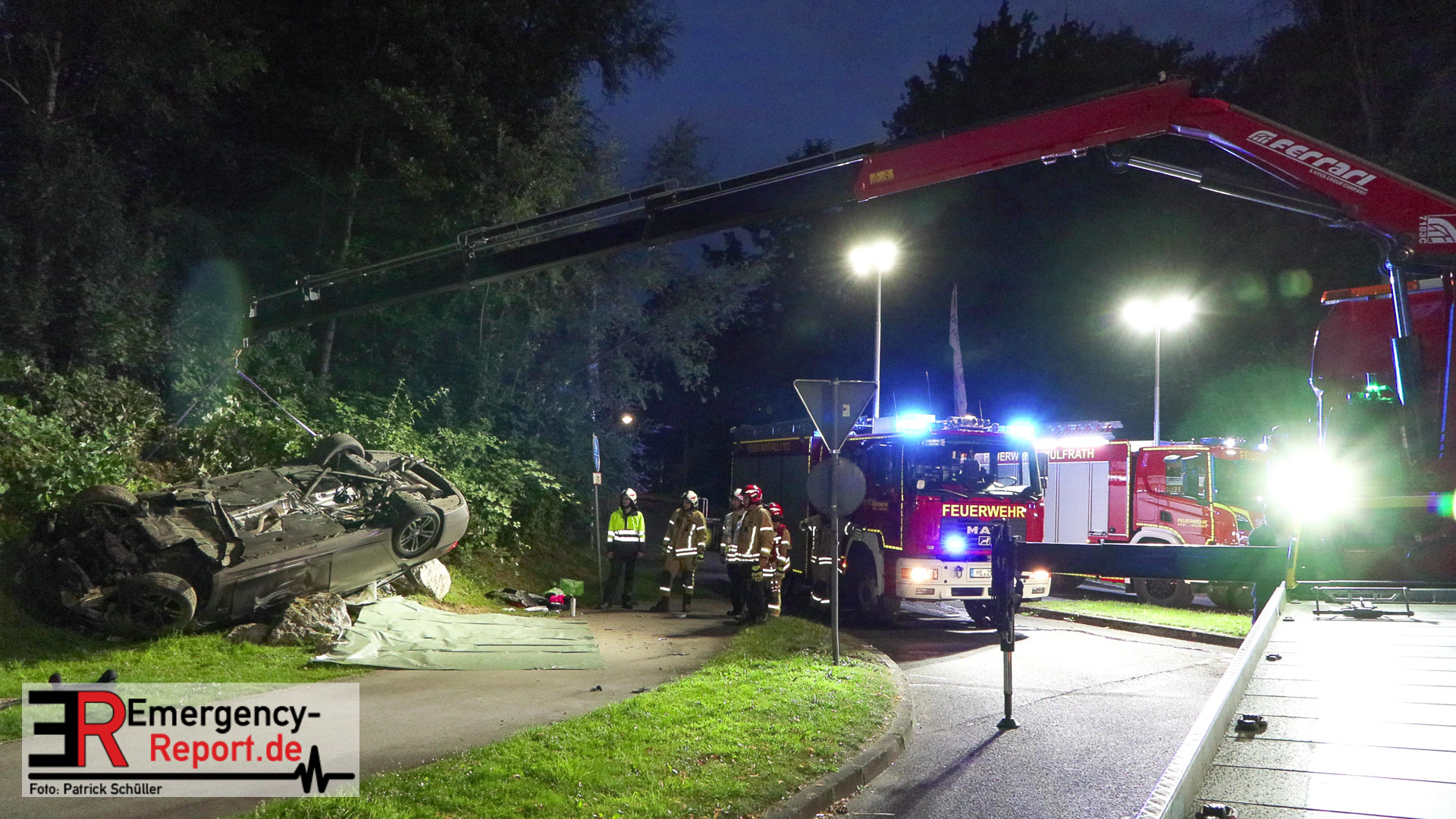 Am nächtlichen Freitagmorgen des 15.07.2022, gegen 03.00 Uhr, befuhr ein 40-jähriger Mann aus Wülfrath, mit seinem dunkelbraunen PKW BMW 420d, die innerörtliche Wilhelmstraße in Wülfrath, aus Richtung Innenstadt kommend, in Fahrtrichtung Velbert / Wuppertal. Bei der Einfahrt in den Kreisverkehr Hammerstein verlor der BMW-Fahrer nach eigenen Angaben die Kontrolle über sein Fahrzeug. Der BMW prallte auf den Bordstein der Mittelinsel und schleuderte über die begrünte Mittelfläche. Dann kam das Fahrzeug kurz zurück auf die Fahrbahn des Kreisverkehrs, bevor er in Höhe der Ausfahrt zum Wanderparkplatz über den dortigen Grünstreifen und Gehweg in die Böschung schleuderte und sich dabei überschlug. Auf dem Dach liegend kam der BMW dort zum Stillstand. In diesem Augenblick setzte ein automatisches Info-System des BMWs sofort einen Alarm an eine Notrufzentrale ab, welche die örtlichen Rettungskräfte alarmierte.