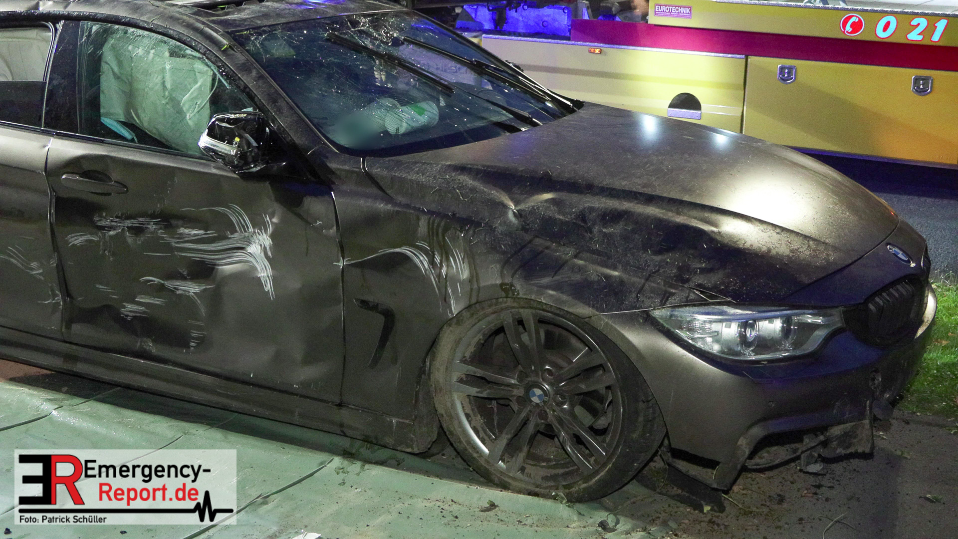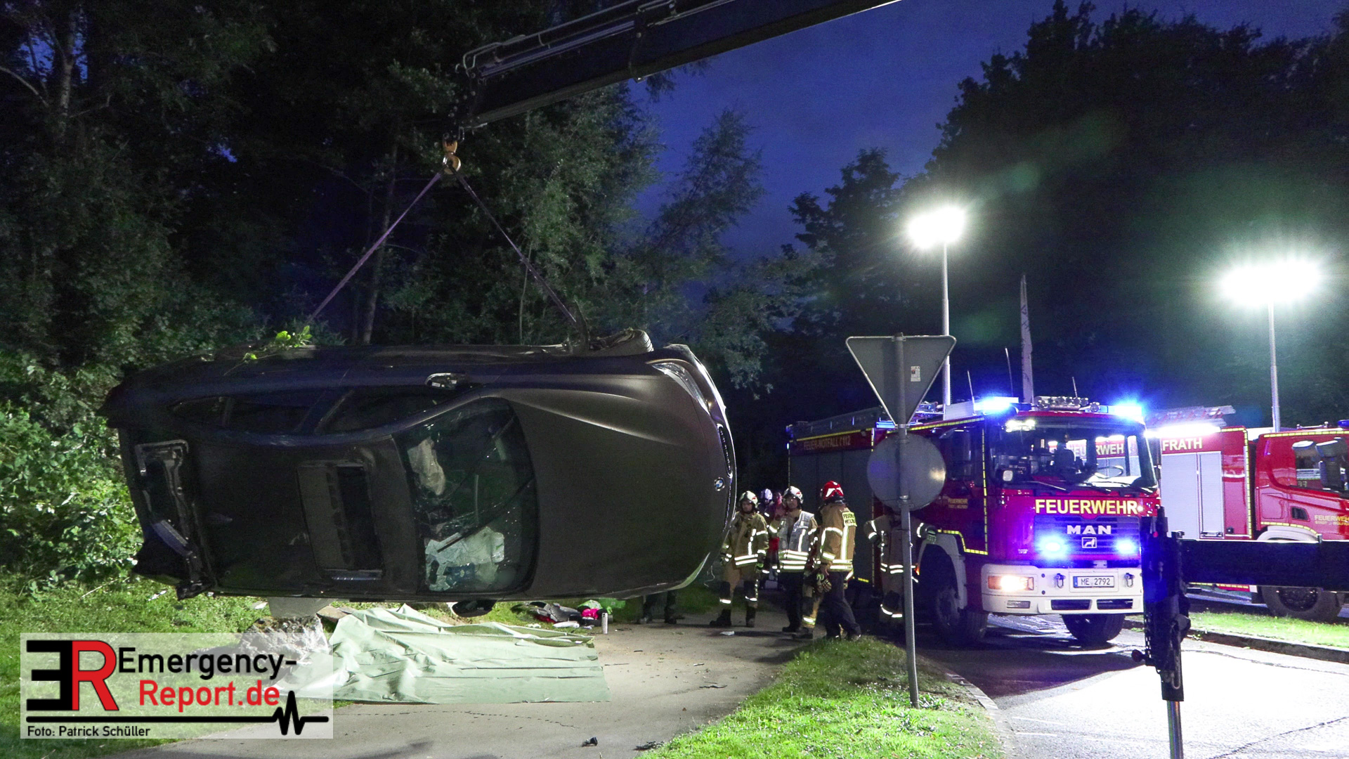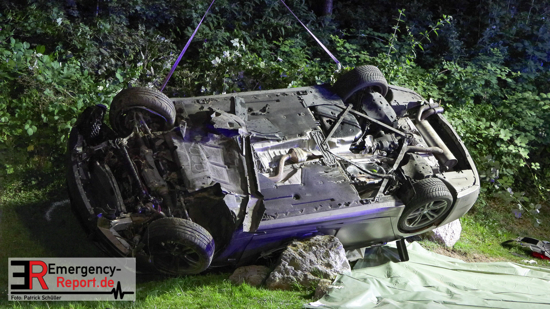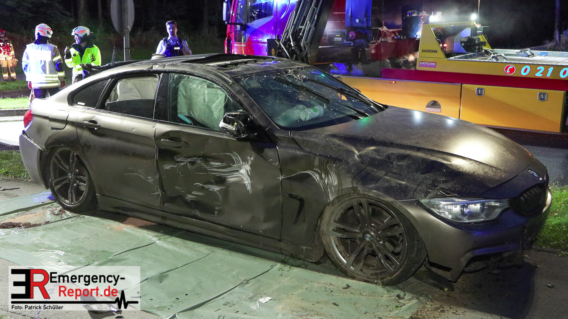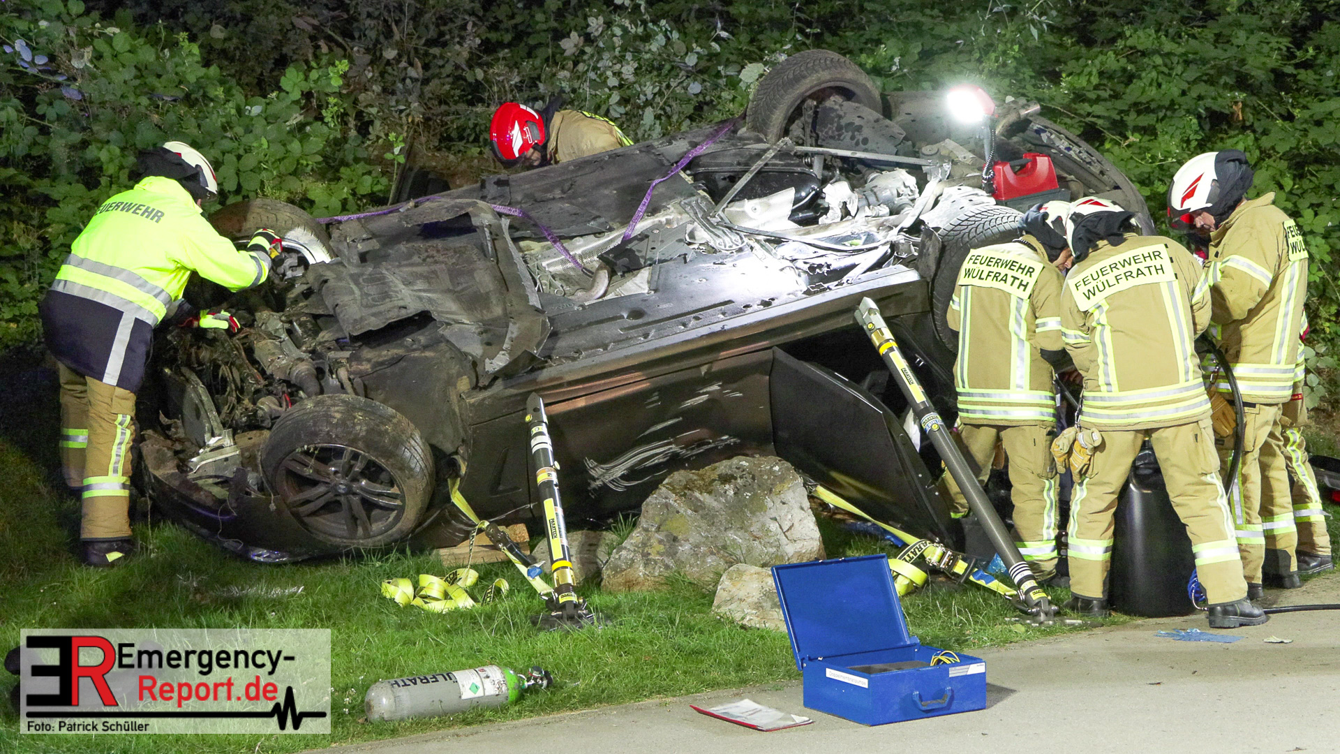 Am nächtlichen Freitagmorgen des 15.07.2022, gegen 03.00 Uhr, befuhr ein 40-jähriger Mann aus Wülfrath, mit seinem dunkelbraunen PKW BMW 420d, die innerörtliche Wilhelmstraße in Wülfrath, aus Richtung Innenstadt kommend, in Fahrtrichtung Velbert / Wuppertal. Bei der Einfahrt in den Kreisverkehr Hammerstein verlor der BMW-Fahrer nach eigenen Angaben die Kontrolle über sein Fahrzeug. Der BMW prallte auf den Bordstein der Mittelinsel und schleuderte über die begrünte Mittelfläche. Dann kam das Fahrzeug kurz zurück auf die Fahrbahn des Kreisverkehrs, bevor er in Höhe der Ausfahrt zum Wanderparkplatz über den dortigen Grünstreifen und Gehweg in die Böschung schleuderte und sich dabei überschlug. Auf dem Dach liegend kam der BMW dort zum Stillstand. In diesem Augenblick setzte ein automatisches Info-System des BMWs sofort einen Alarm an eine Notrufzentrale ab, welche die örtlichen Rettungskräfte alarmierte.