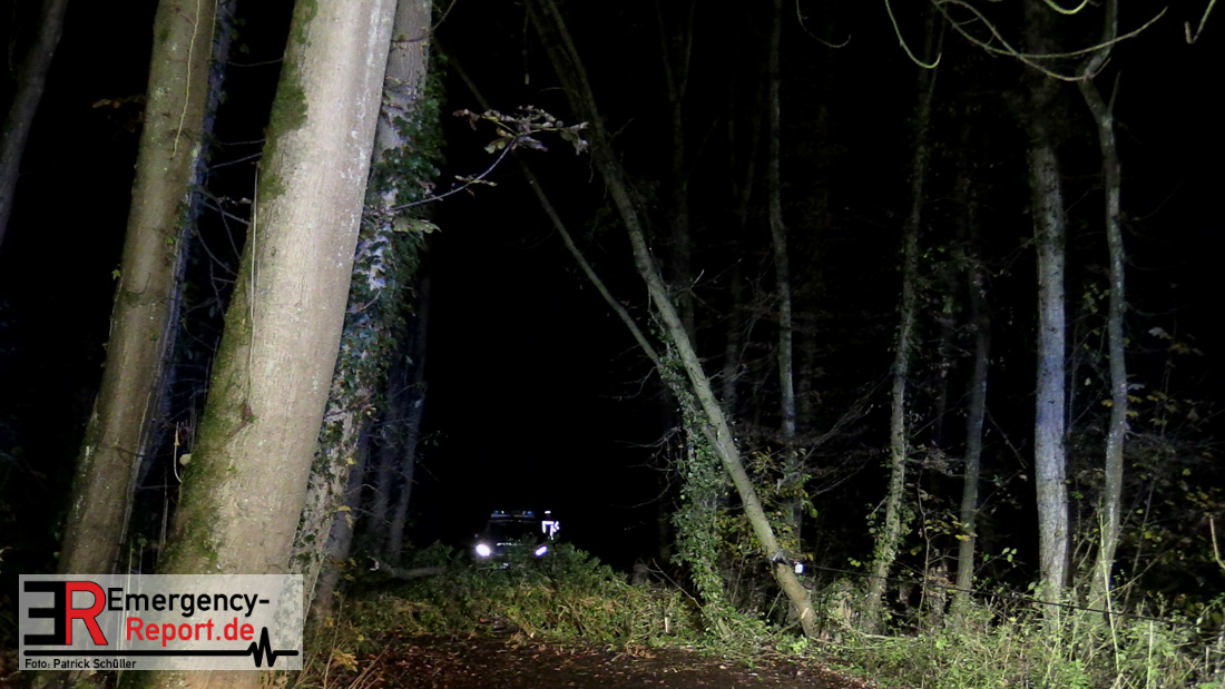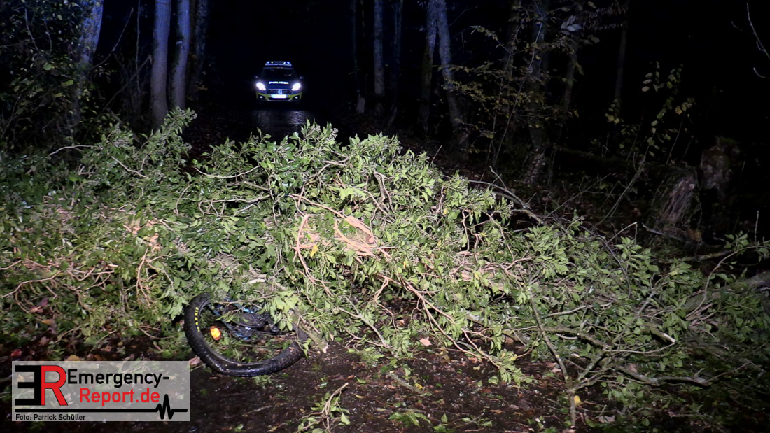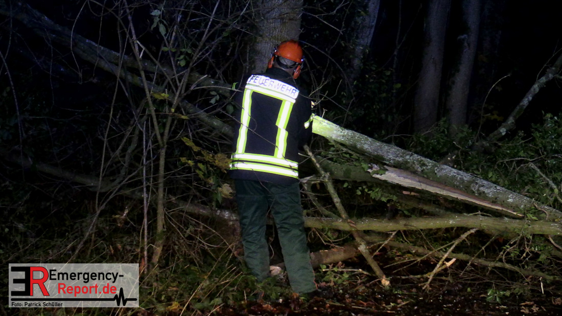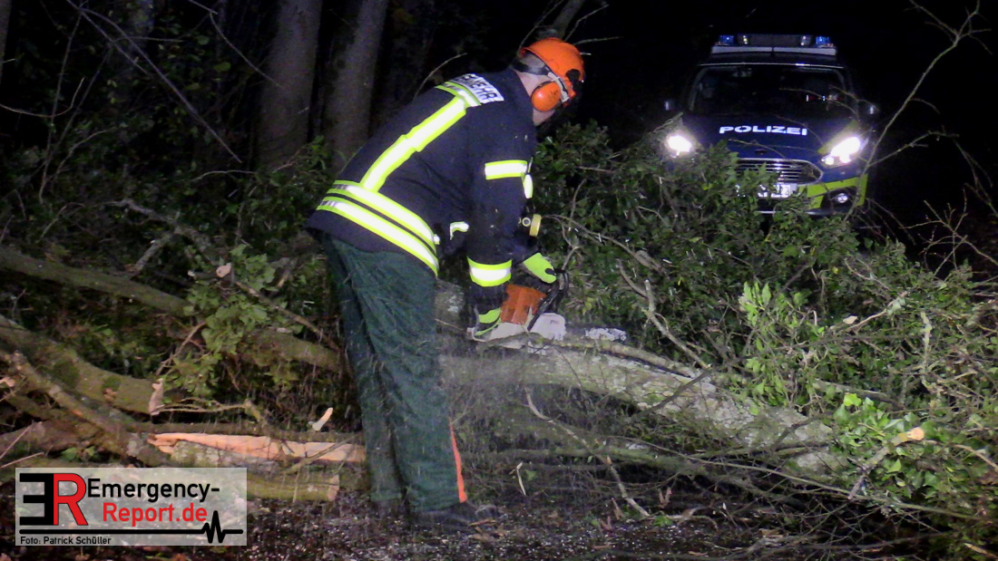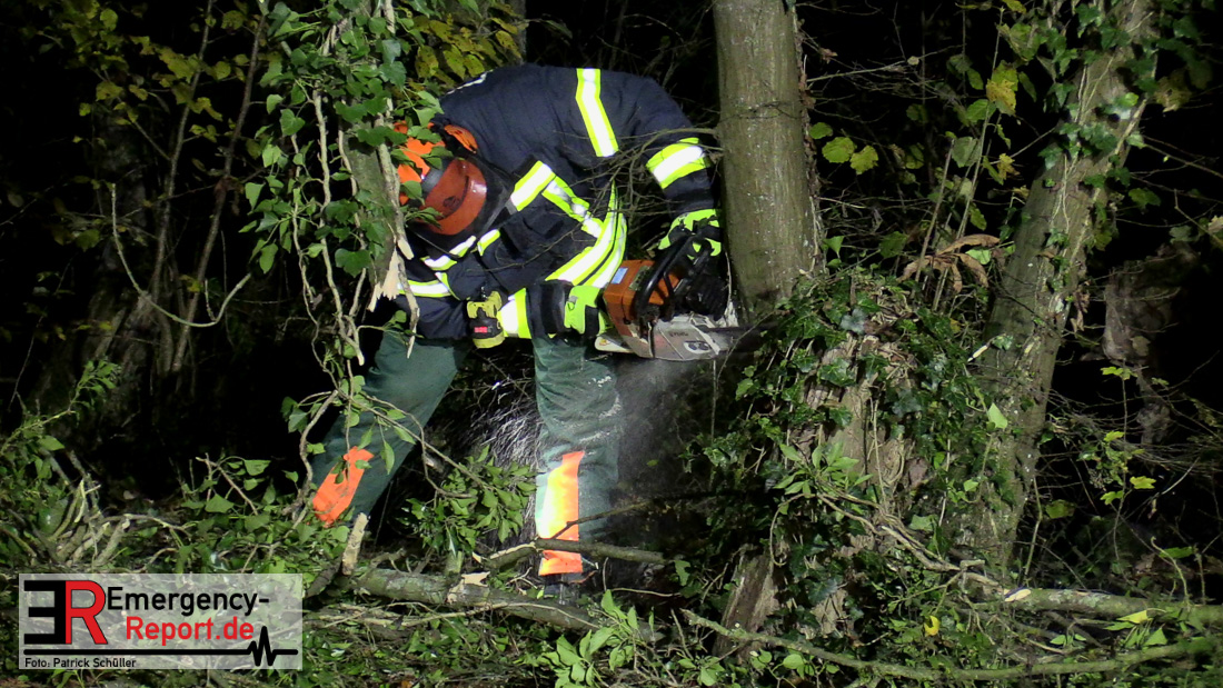 Die Feuerwehr beseitigte anschließend den umgestürzten Baum von der Fahrbahn und fällte noch einen weiteren Baum, der ebenfalls umzustürzen drohte.