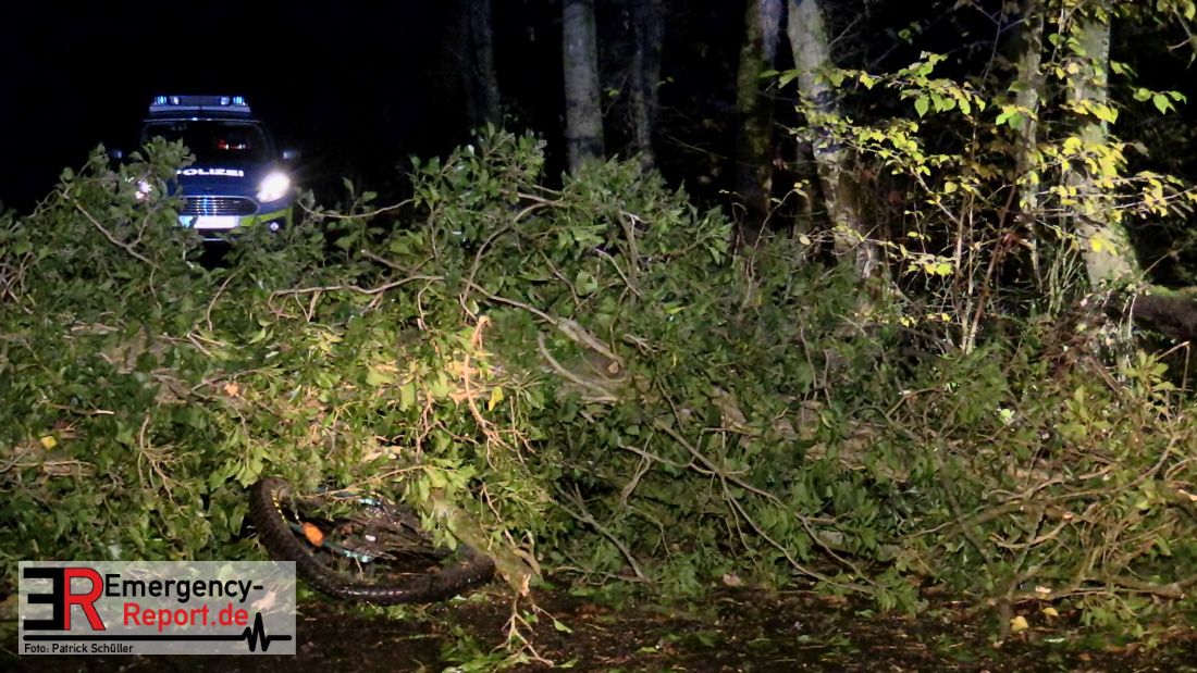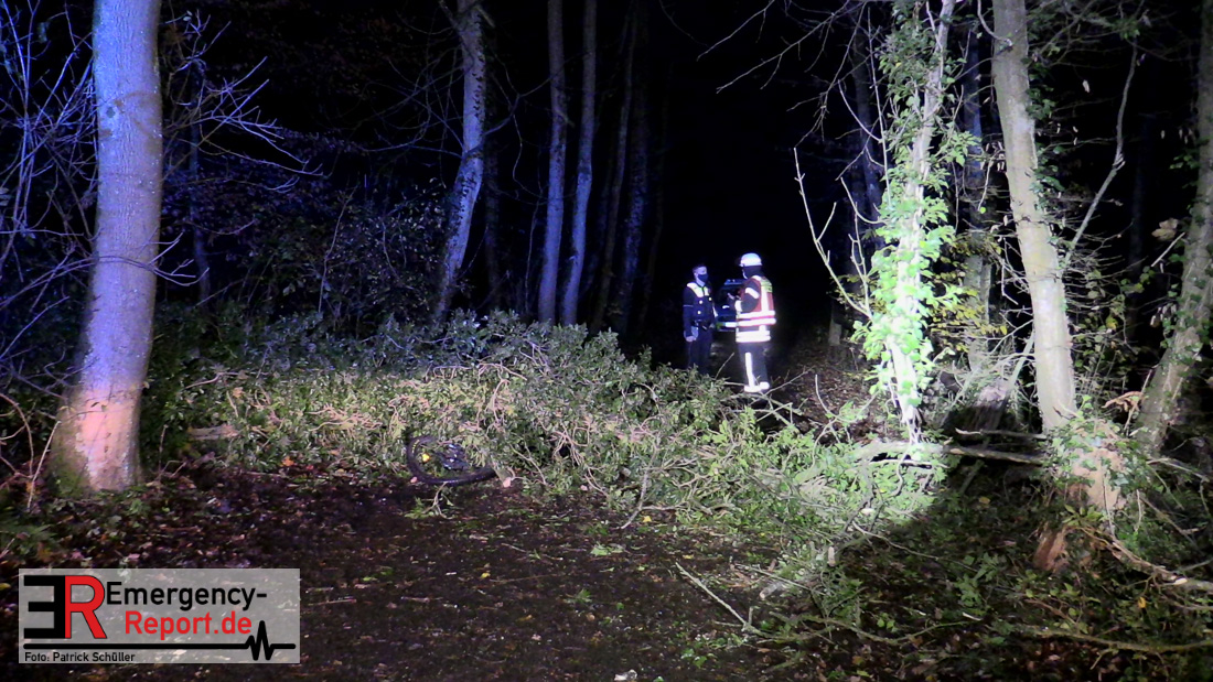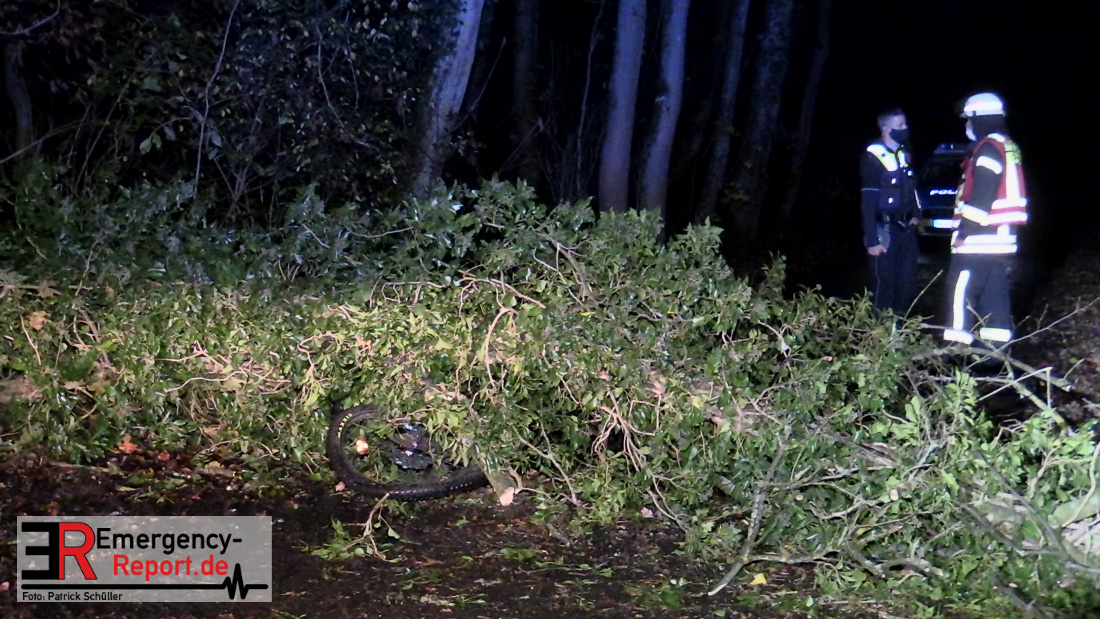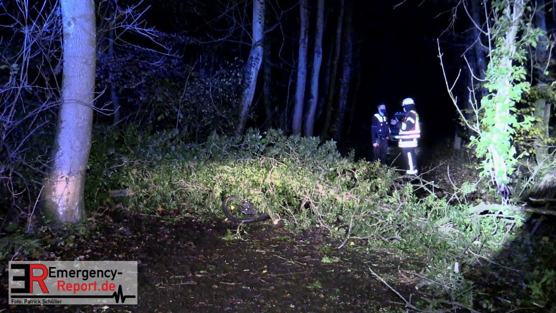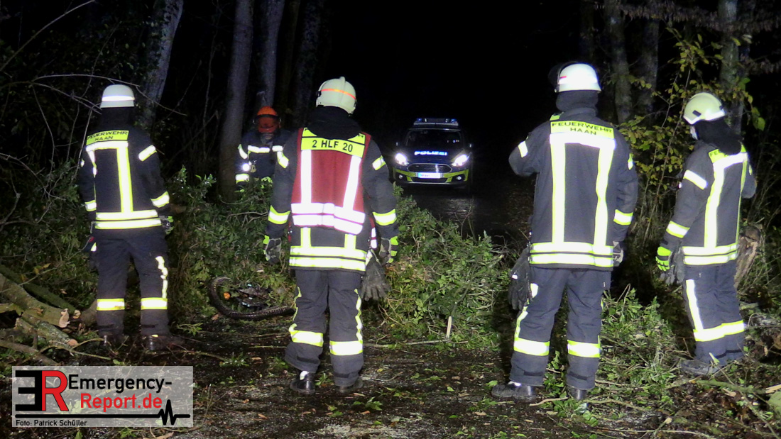 Bei einem Unglücksfall auf der Straße Bracken in Gruiten ist heute (17.11.2020) ein zwölfjähriger Junge lebensgefährlich verletzt worden. Er und ein Freund waren auf Fahrrädern auf der Straße unterwegs, als ein Baum umstürzte und den Jungen erfasste. Er wurde mitsamt Fahrrad in Höhe des Oberkörpers unter dem etwa 25 Meter langen Baum eingeklemmt.