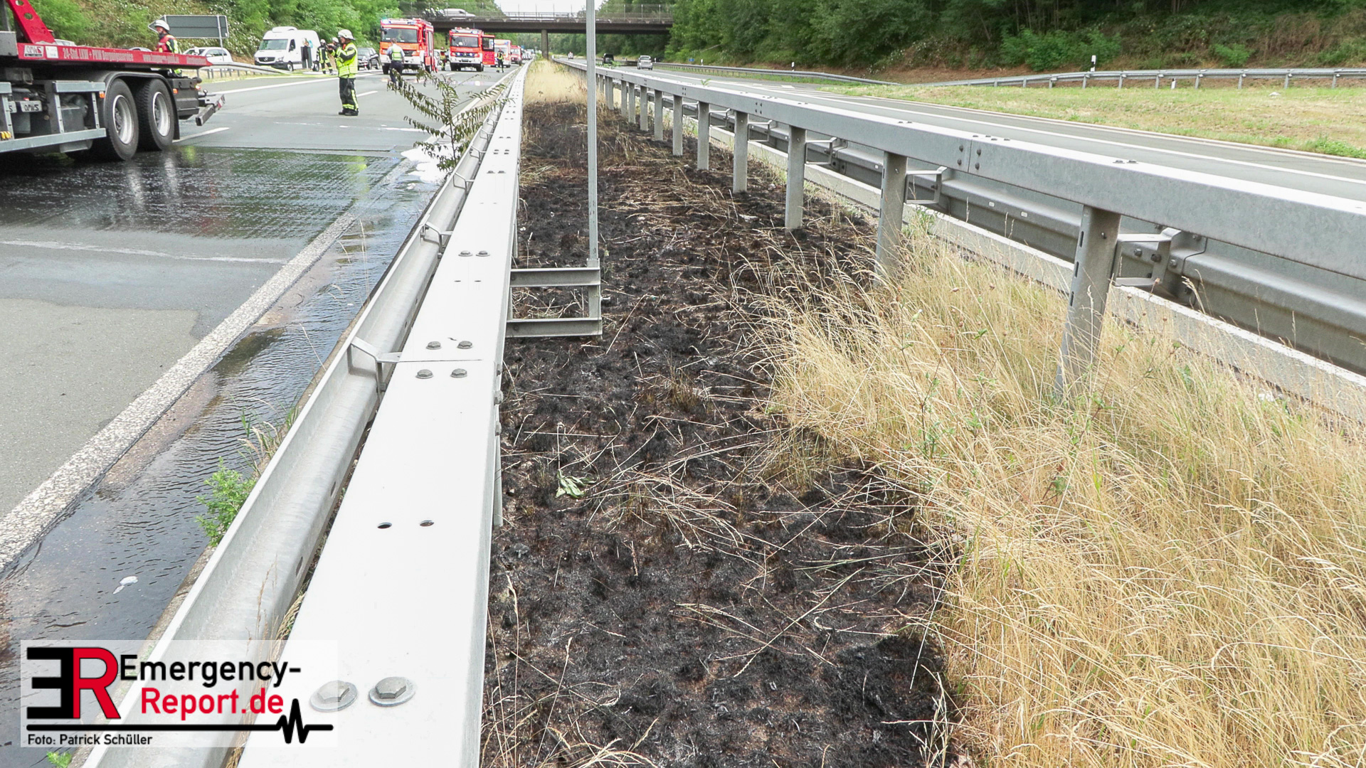 Als die Rettungskräfte an der Einsatzstelle eintrafen, erblickte sie einen Mercedes Kleintransporter, der in Vollbrand auf dem Seitenstreifen stand. Darüber hinaus hatte das Feuer auf den angrenzenden Grünstreifen der Autobahn übergegriffen. Umgehend wurde eine Alarmstufenerhöhung ausgerufen und freiwillige Einsatzkräfte an die Einsatzstelle entsandt. Währenddessen wurde mit der Brandbekämpfung begonnen. Mithilfe von zwei C-Schläuchen bekämpften die Beamten unter schwerem Atemschutz den Brand. Auslaufende Betriebsstoffe erschwerten es den Feuerwehrkräften, einen schnellen Löscherfolg zu erzielen. Daher wurde dem Löschwasser zügig Schaummittel beigemengt. Die unmittelbar eintreffende Freiwillige Feuerwehr unterstützte die Löschmaßnahmen mit einem C-Rohr. Insgesamt waren 2 C-Rohre und ein Schaumrohr im Einsatz. Gegen 12 Uhr konnte das Feuer erfolgreich bekämpft werden. Die Nachlöscharbeiten zogen sich jedoch noch hin. Da durch die Löschmaßnahmen Kraftstoff und Löschwasser in die Kanalisation eingedrungen war, wurde zusätzlich die untere Wasserbehörde an die Einsatzstelle beordert. Eine Überprüfung des angrenzenden Regenrückhaltebeckens ergab keine nennenswerte Kontamination.