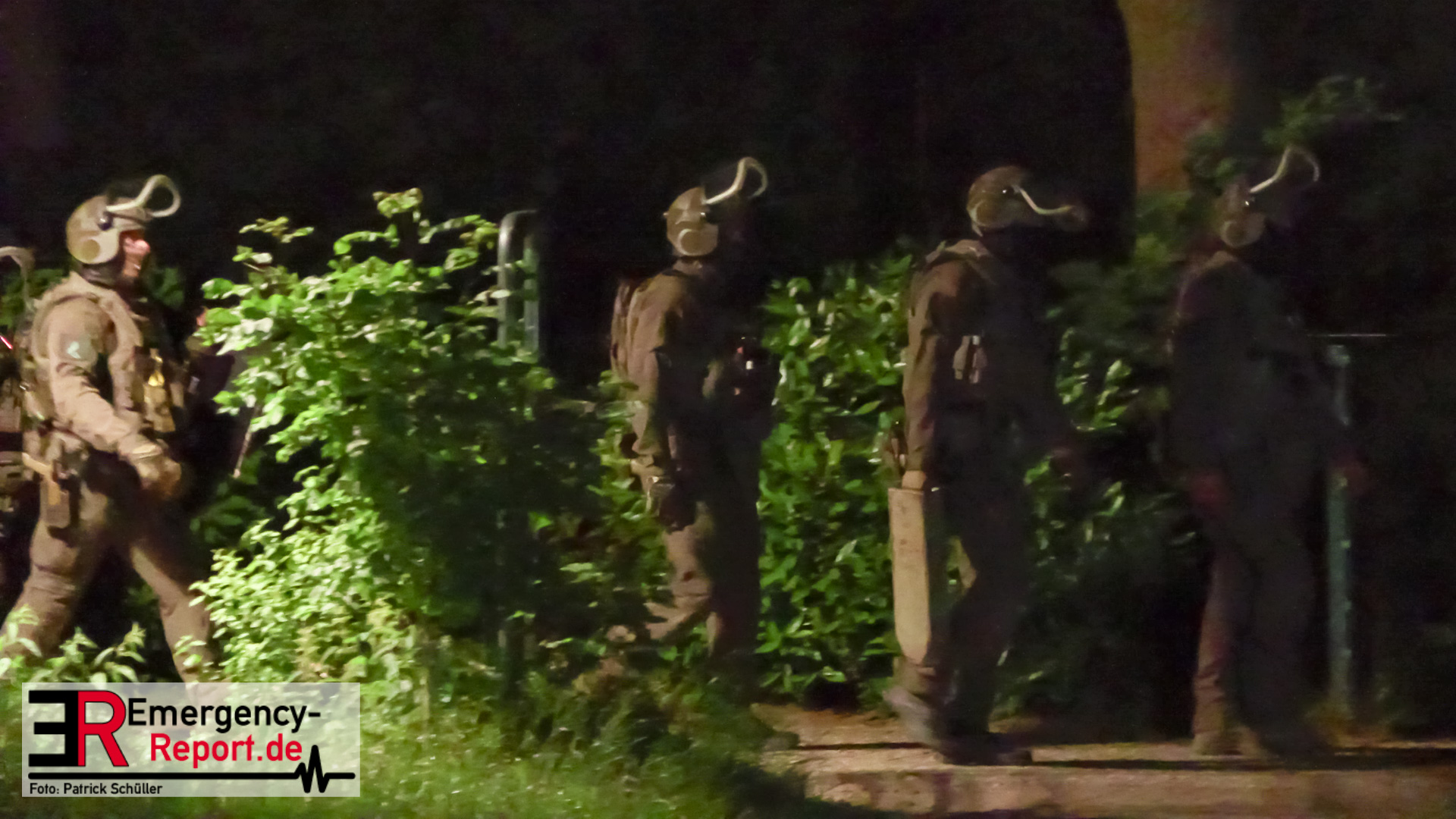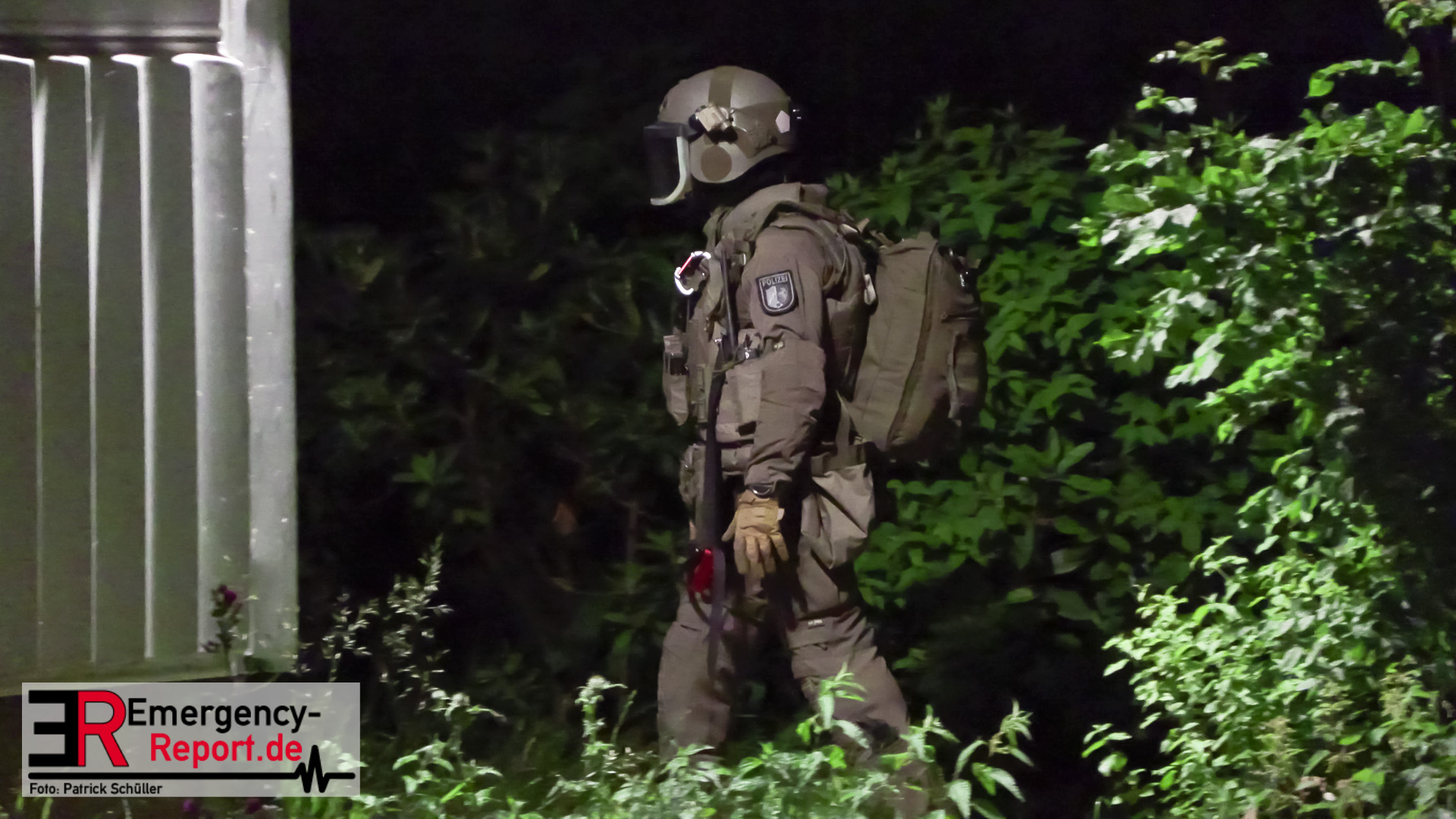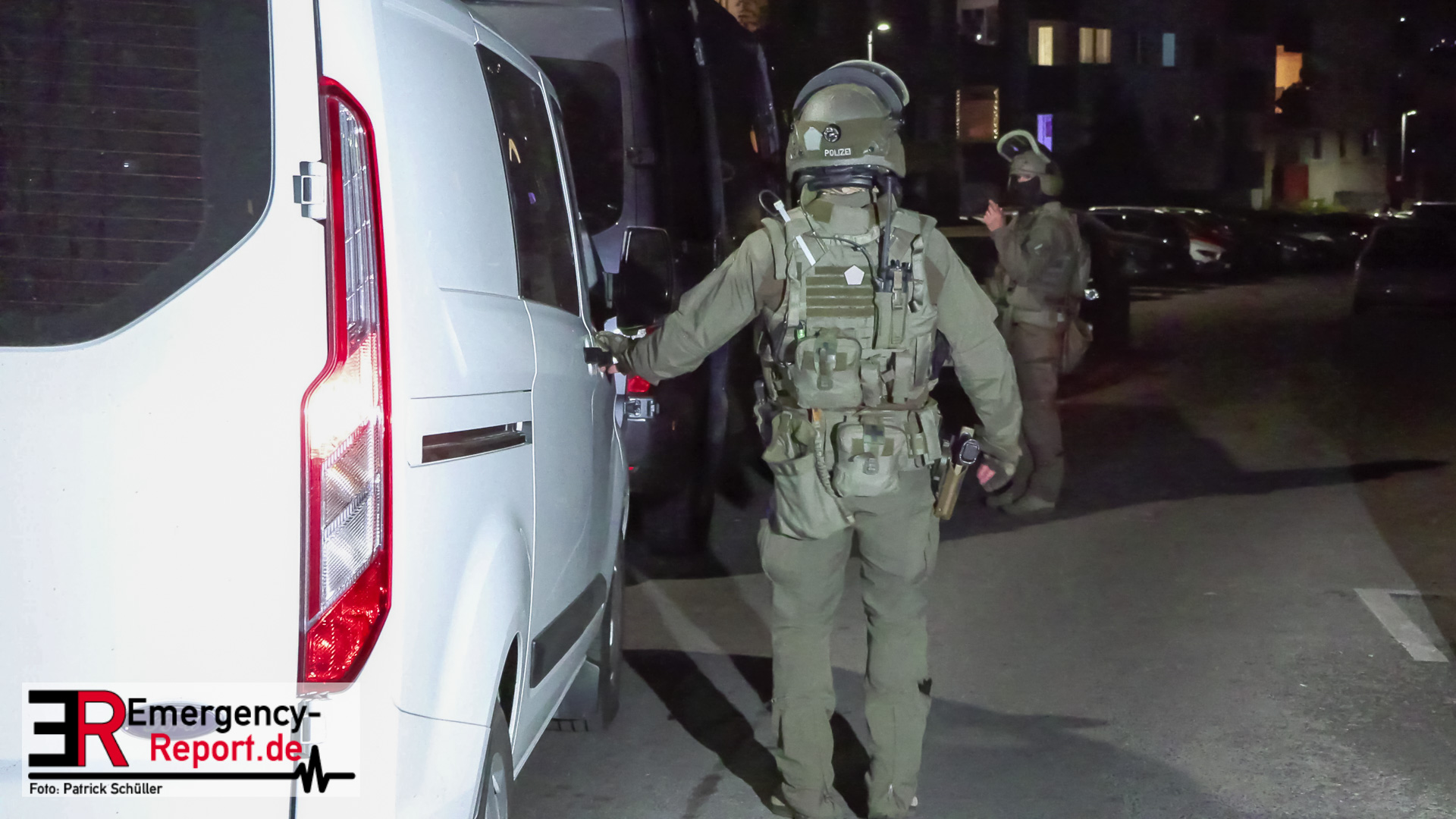 Polizisten des Spezialeinsatzkommandos durchsuchten in Heiligenhaus mehrere Objekte. Dabei konnte eine männliche Person am 19.05.2025, gegen 23:00 Uhr, festgenommen werden.