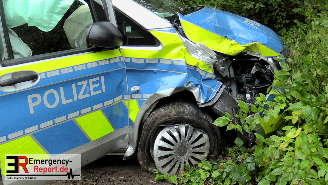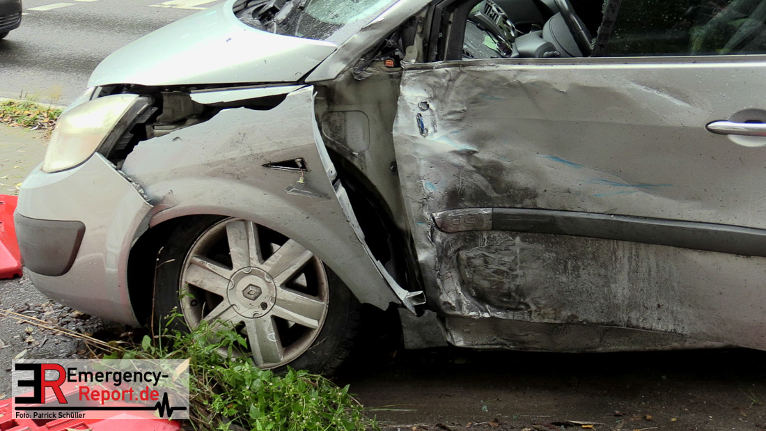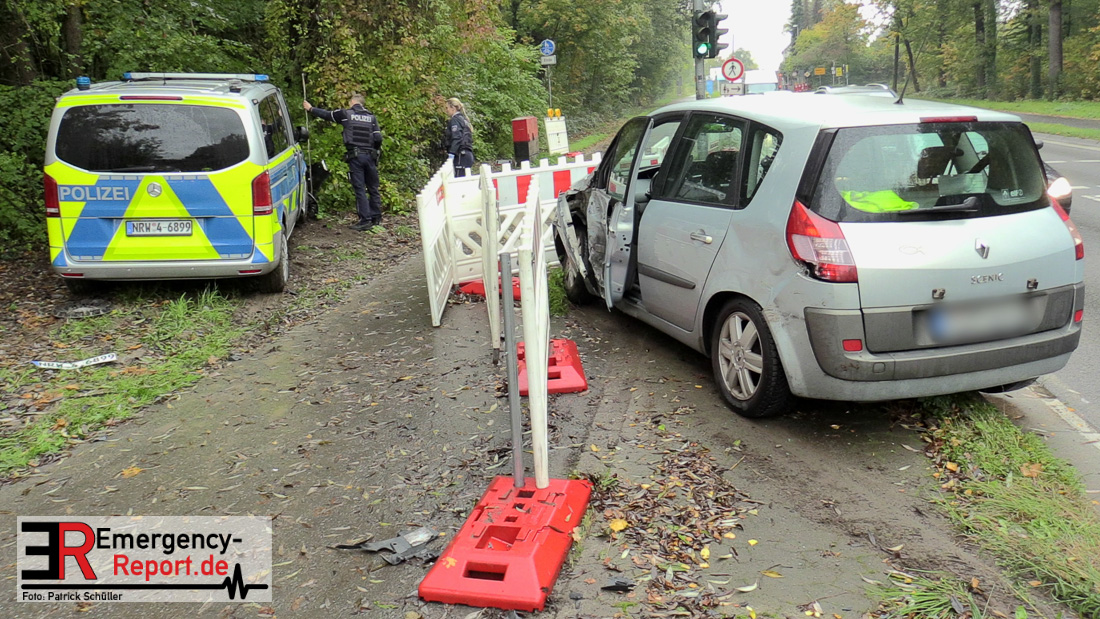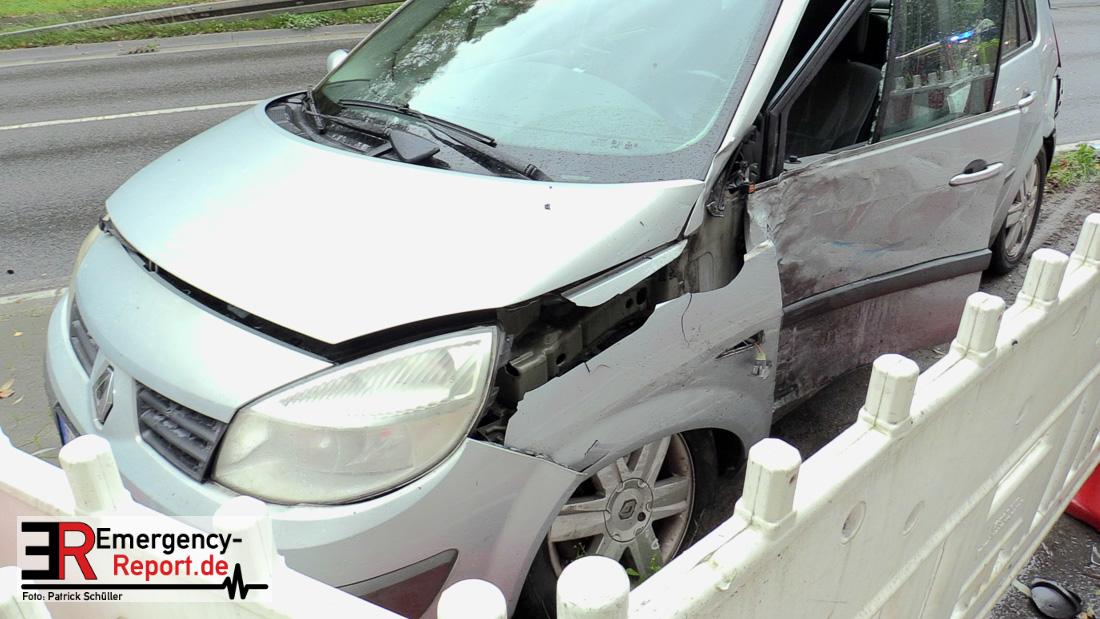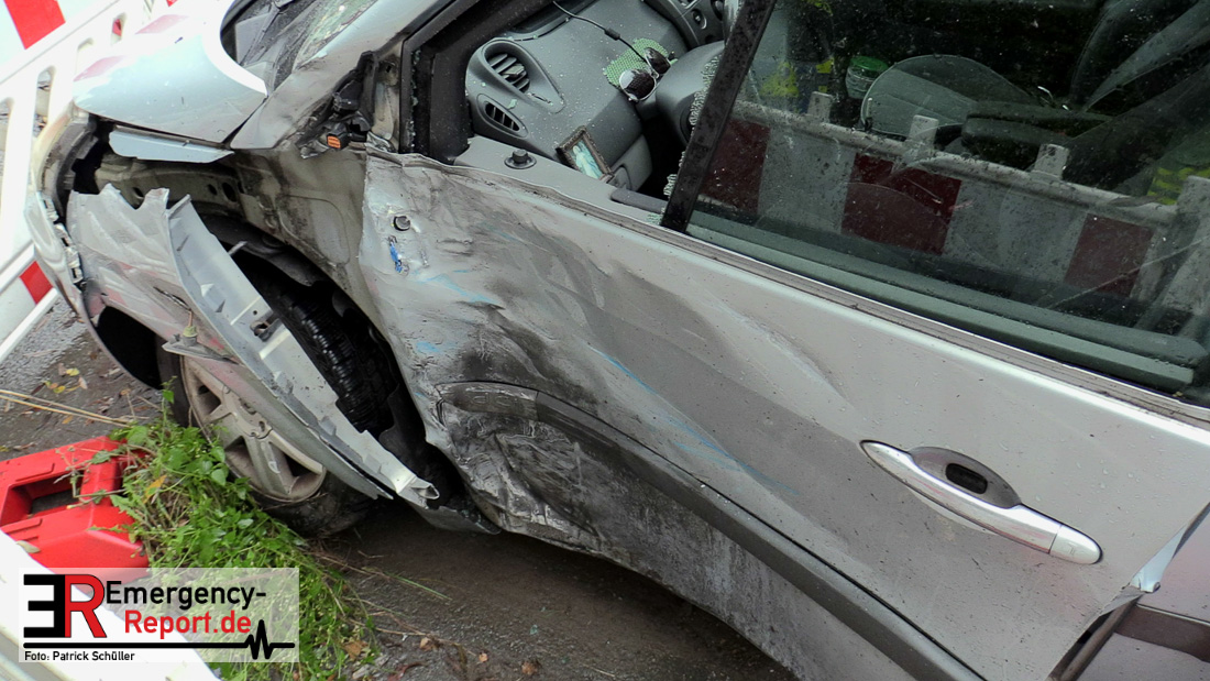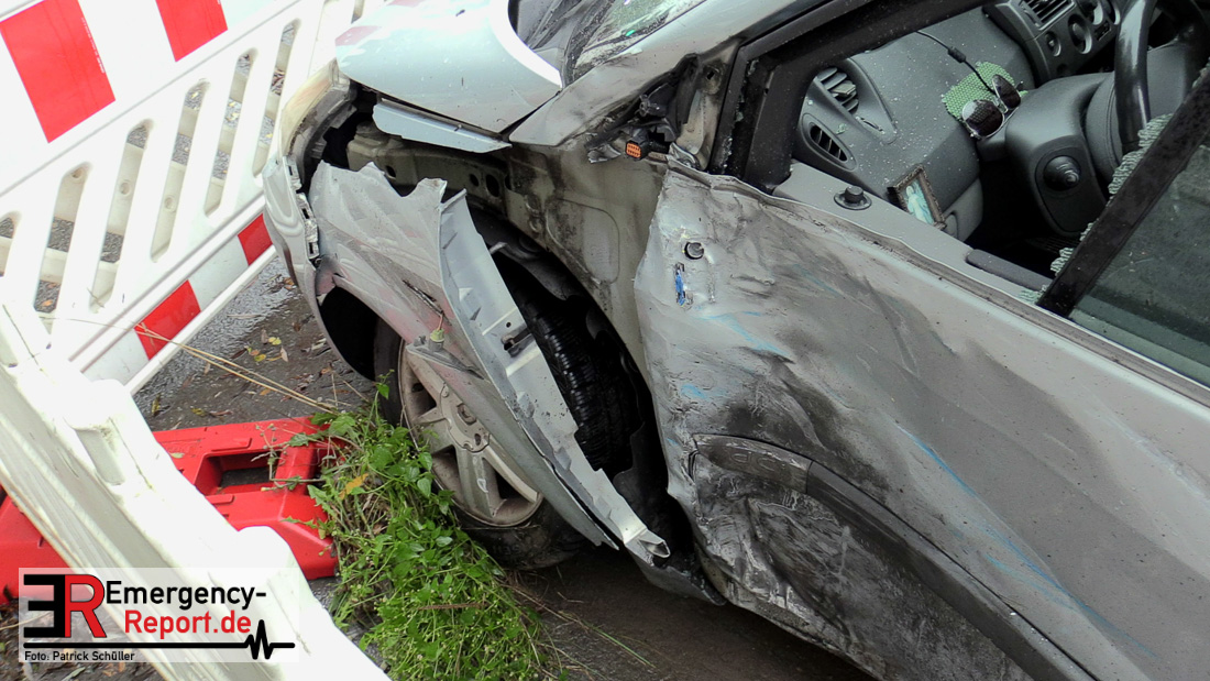Der Fahrer des Streifenwagens führte eine Vollbremsung aus und versuchte noch, durch ein hartes Einlenken nach links einen Zusammenstoß zu vermeiden. Allerdings konnte der Polizeibeamte den Zusammenprall mit dem Megane nicht mehr verhindern. Anschließend rutschte der Streifenwagen nach links von der Straße ab, eher er im Gebüsch stehen blieb. Der Renault Megane wurde durch den Zusammenstoß in mehrere Baustellenzäune und Warnbaken geschoben.