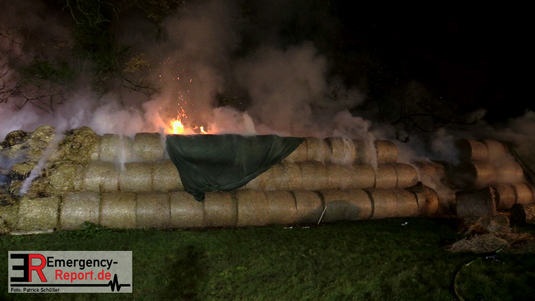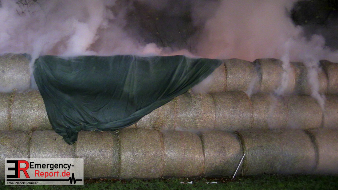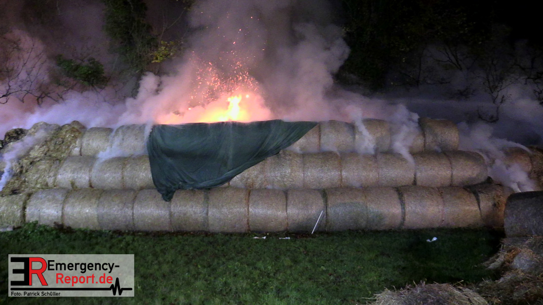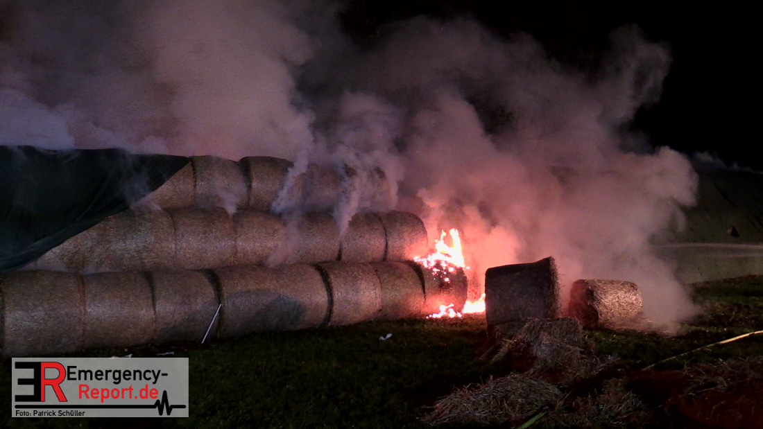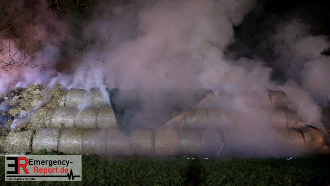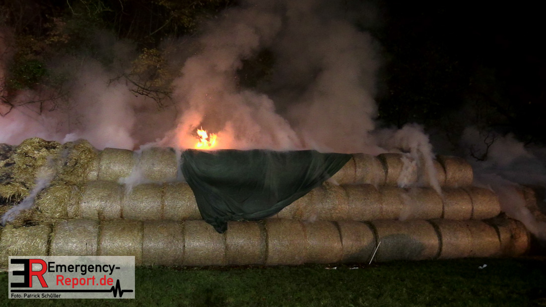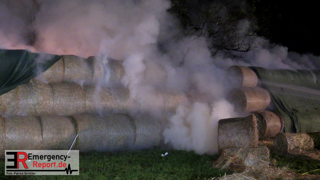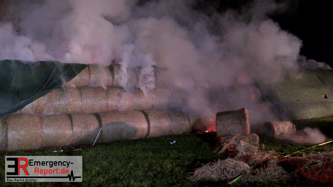 Beim Eintreffen der ersten Kräfte brannte ein Teil, einer aus 400 Ballen bestehenden Strohmiete auf einem Feld, sodass eine Alarmstufenerhöhung durchgeführt wurde. In diesem Zuge wurde ebenfalls Sirenenalarm ausgelöst, um alle verfügbaren Einsatzkräfte zu alarmieren. Gleichzeitig wurde die Bevölkerung über die gängigen Warnapps vor möglichen Geruchsbelästigungen gewarnt und gebeten Fenster und Türen geschlossen zu halten.