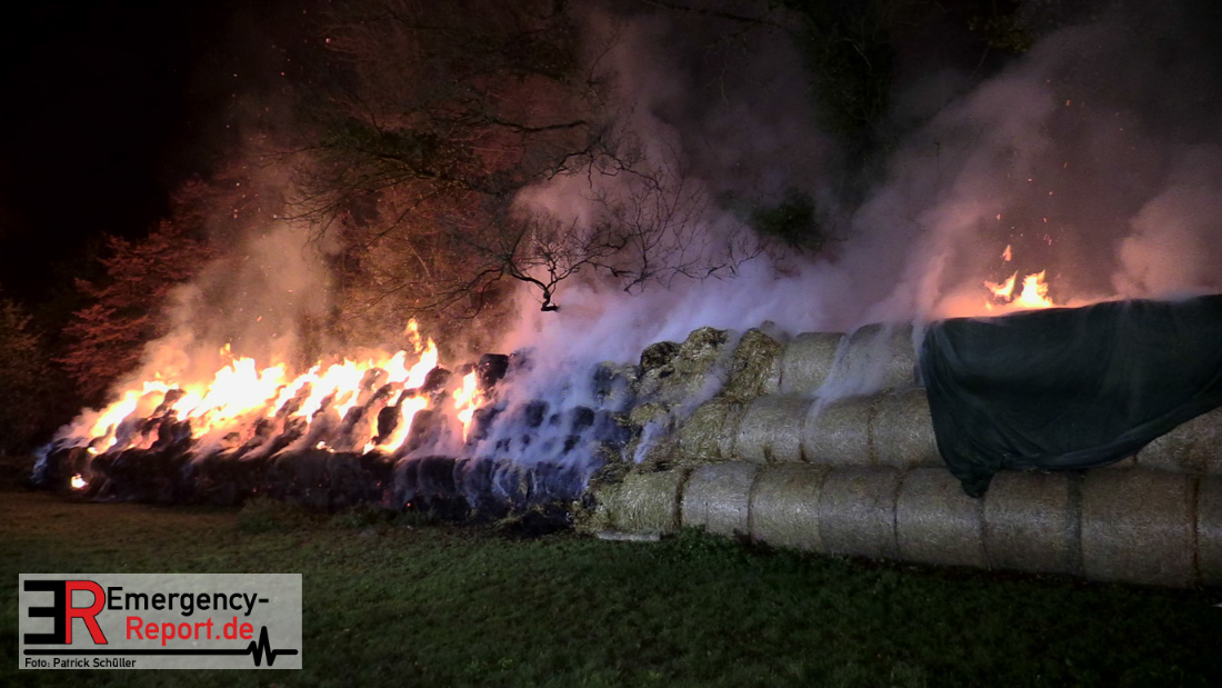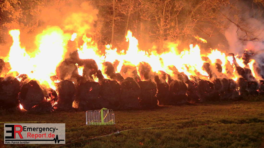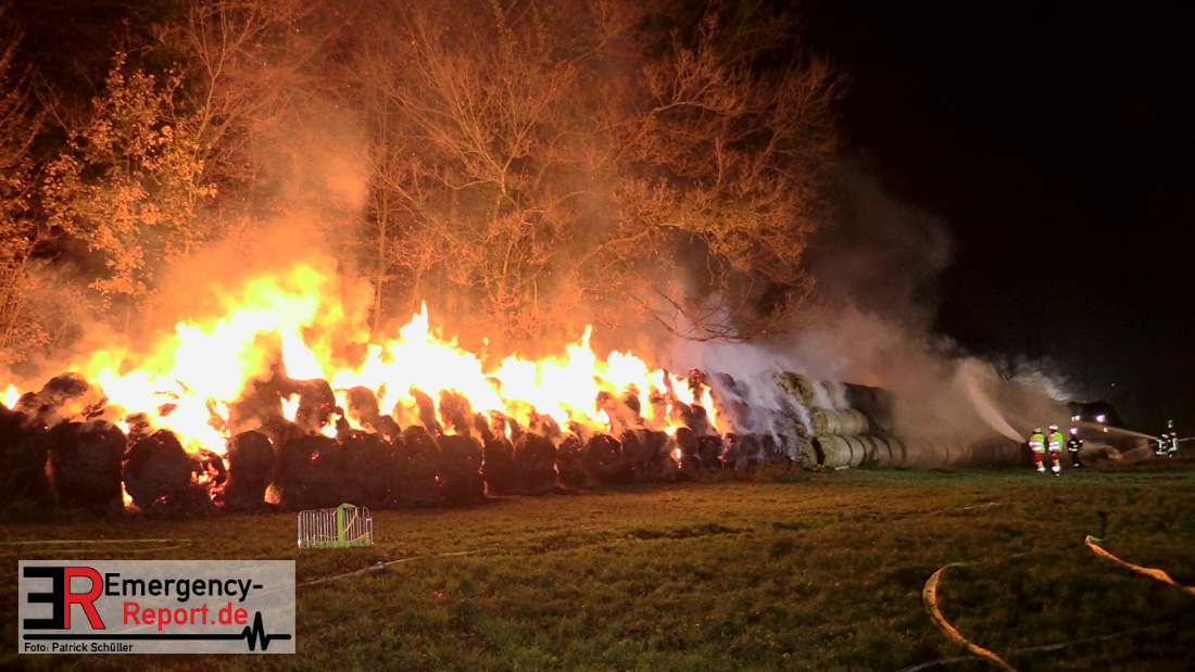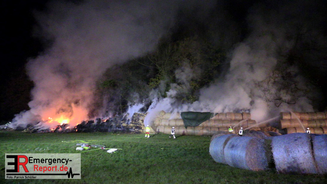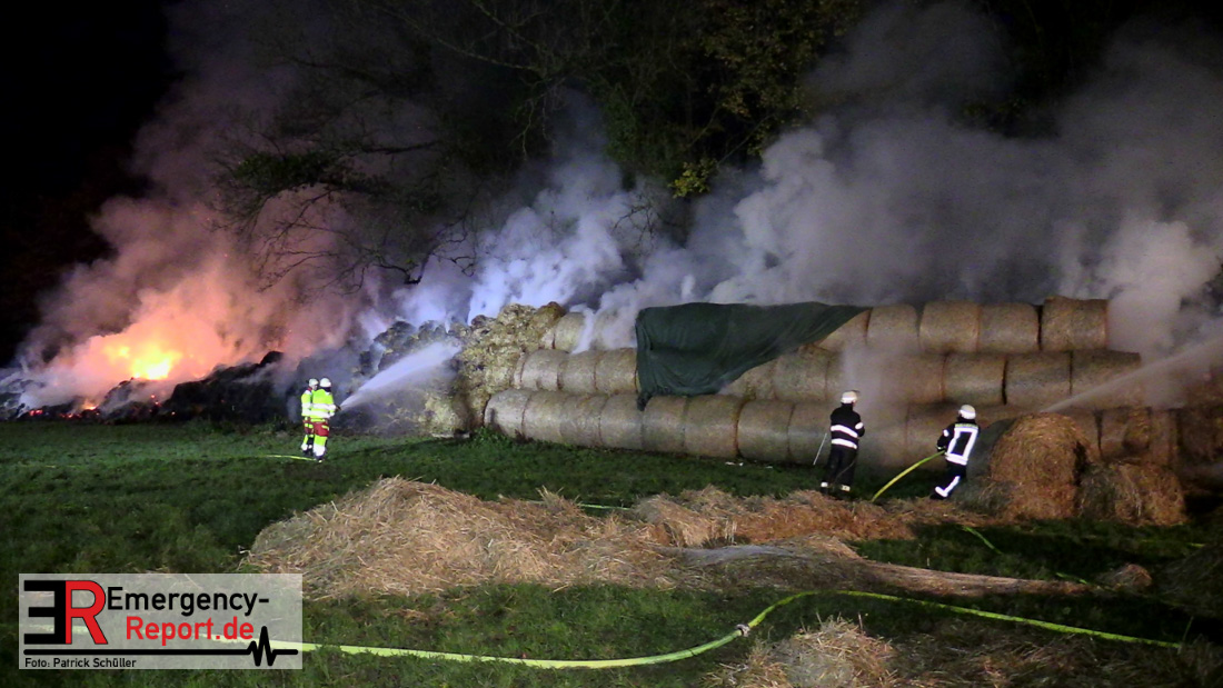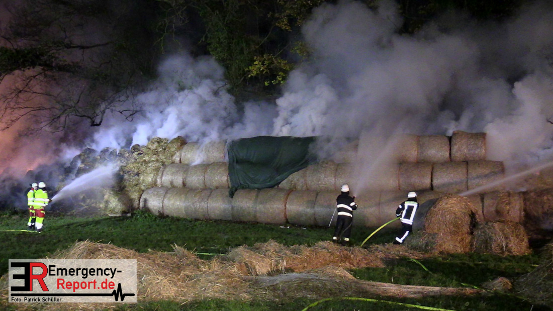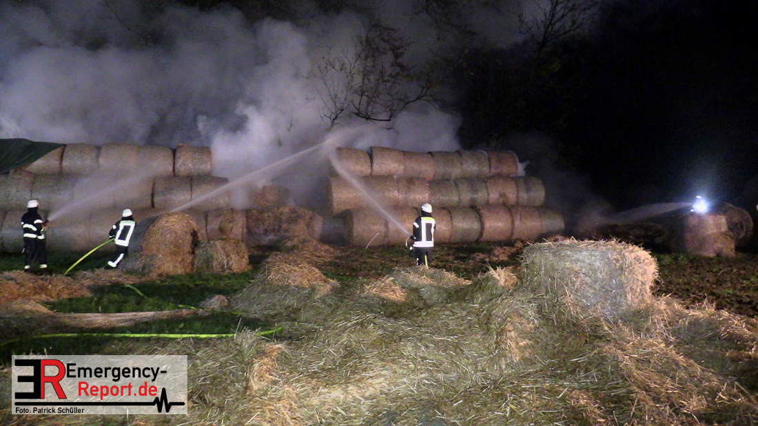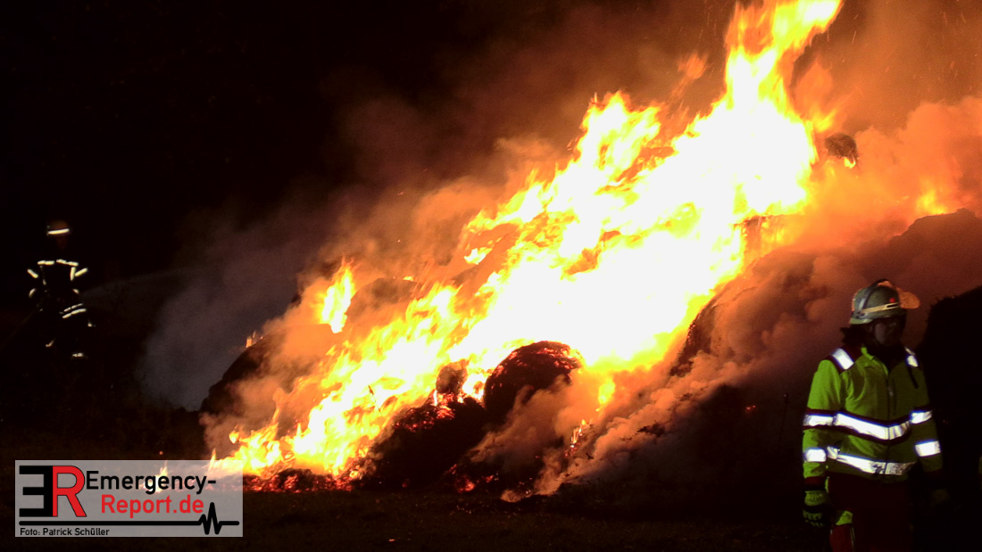 Beim Eintreffen der ersten Kräfte brannte ein Teil, einer aus 400 Ballen bestehenden Strohmiete auf einem Feld, sodass eine Alarmstufenerhöhung durchgeführt wurde. In diesem Zuge wurde ebenfalls Sirenenalarm ausgelöst, um alle verfügbaren Einsatzkräfte zu alarmieren. Gleichzeitig wurde die Bevölkerung über die gängigen Warnapps vor möglichen Geruchsbelästigungen gewarnt und gebeten Fenster und Türen geschlossen zu halten.