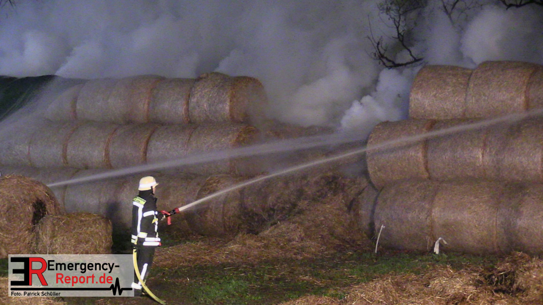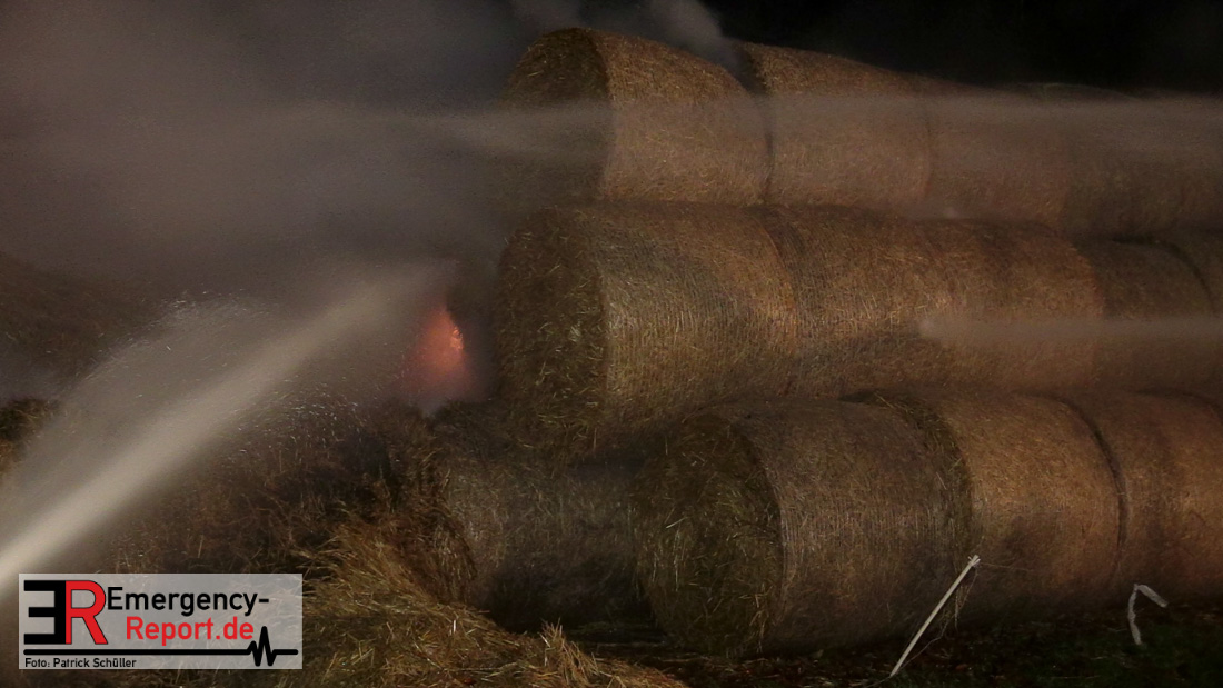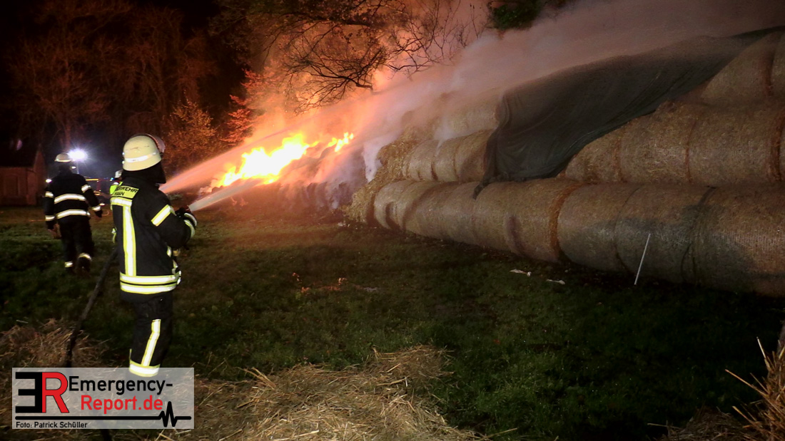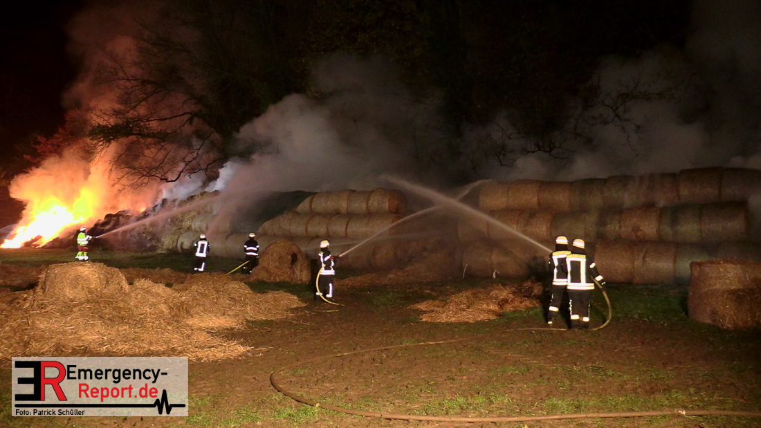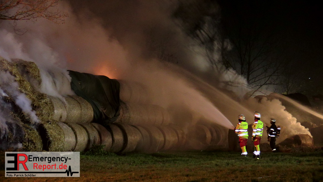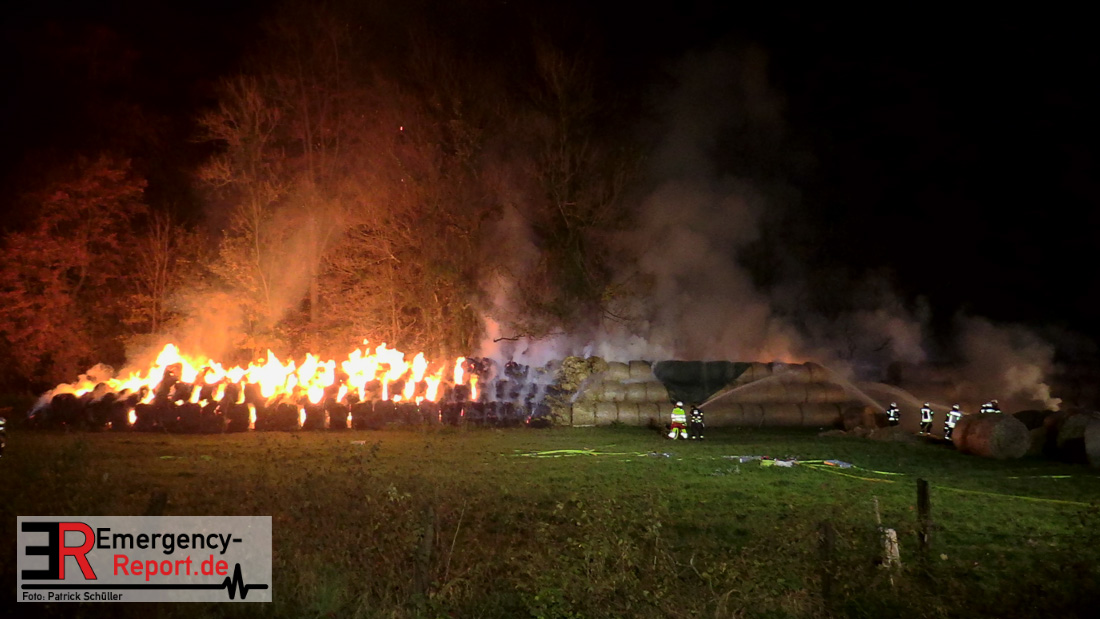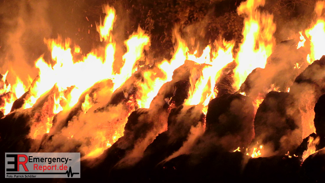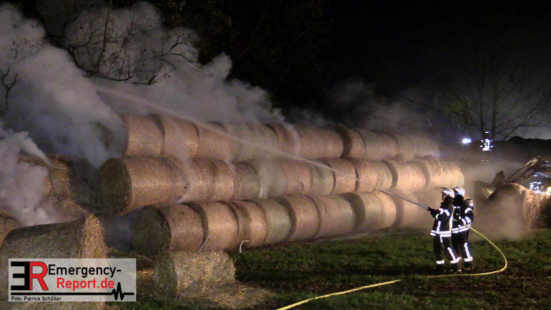 Beim Eintreffen der ersten Kräfte brannte ein Teil, einer aus 400 Ballen bestehenden Strohmiete auf einem Feld, sodass eine Alarmstufenerhöhung durchgeführt wurde. In diesem Zuge wurde ebenfalls Sirenenalarm ausgelöst, um alle verfügbaren Einsatzkräfte zu alarmieren. Gleichzeitig wurde die Bevölkerung über die gängigen Warnapps vor möglichen Geruchsbelästigungen gewarnt und gebeten Fenster und Türen geschlossen zu halten.