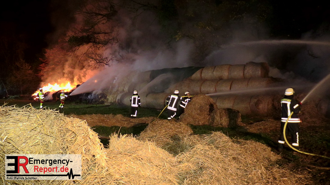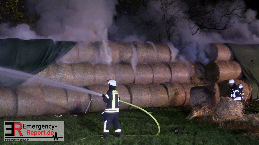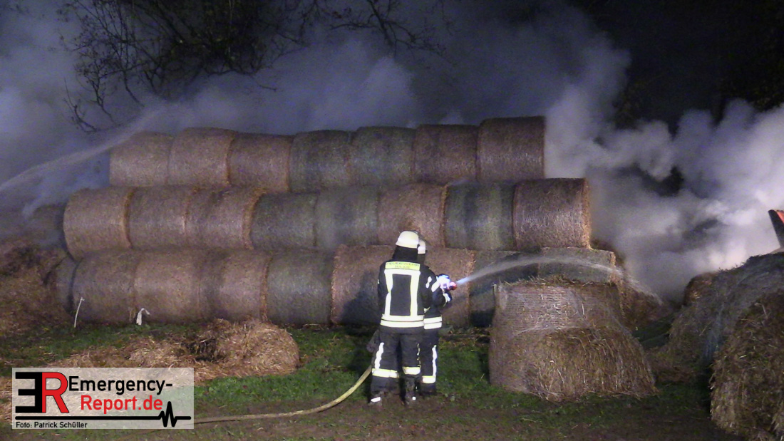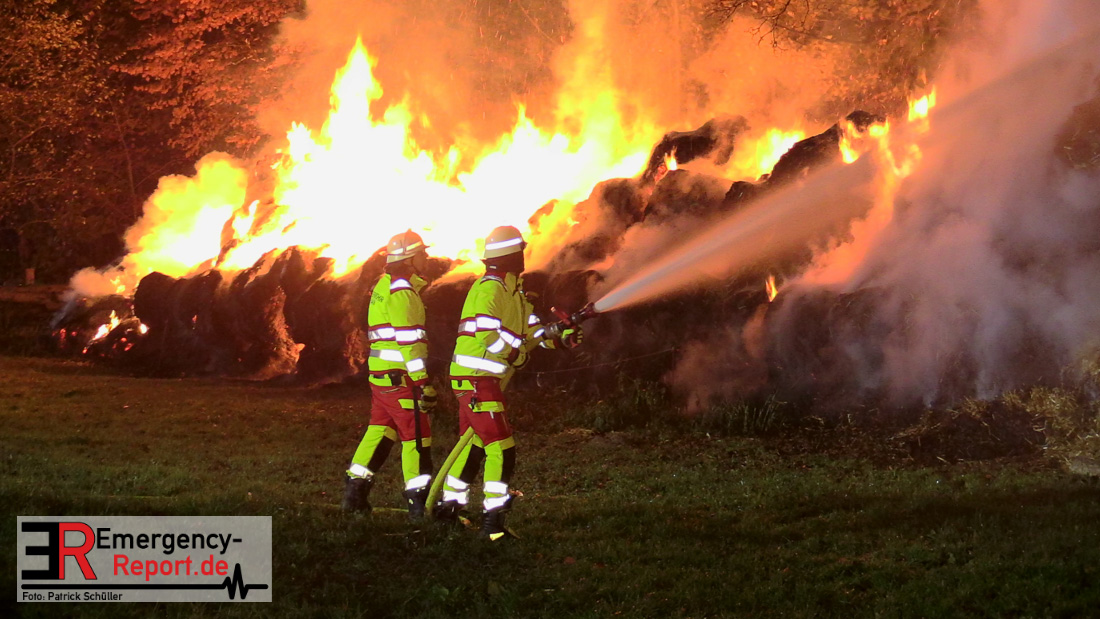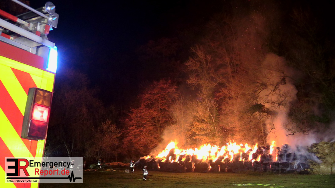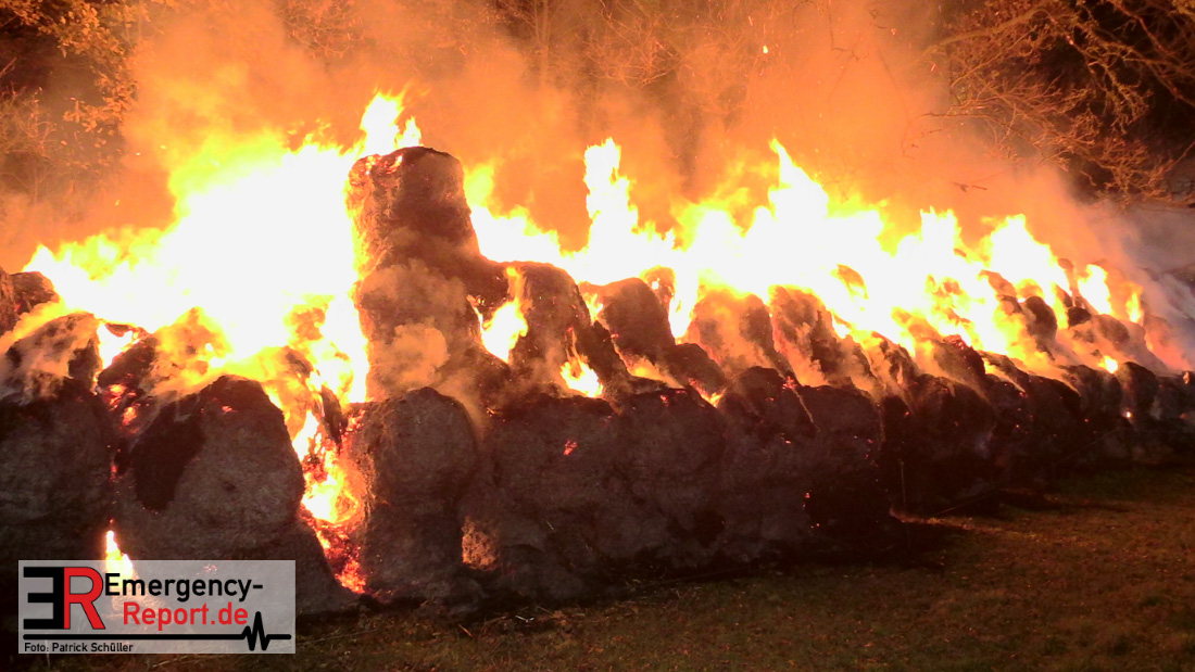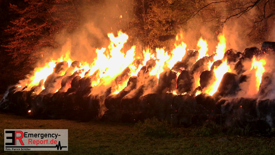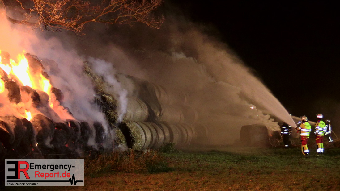 Beim Eintreffen der ersten Kräfte brannte ein Teil, einer aus 400 Ballen bestehenden Strohmiete auf einem Feld, sodass eine Alarmstufenerhöhung durchgeführt wurde. In diesem Zuge wurde ebenfalls Sirenenalarm ausgelöst, um alle verfügbaren Einsatzkräfte zu alarmieren. Gleichzeitig wurde die Bevölkerung über die gängigen Warnapps vor möglichen Geruchsbelästigungen gewarnt und gebeten Fenster und Türen geschlossen zu halten.