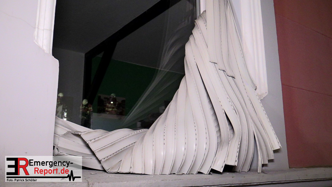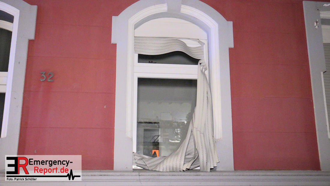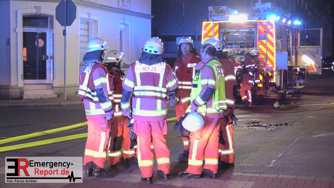 Mehrere Trupps unter Atemschutz gingen umgehend mit C-Rohren gegen das Feuer vor: Während ein Trupp von der Straße den Brand bekämpfte, arbeitete ein zweiter Trupp vom Flachdach des Nachbargebäudes aus. Mit dem weiteren Rohr sowie über die Drehleiter wurde eine Riegelstellung zum Schutz der unmittelbar angrenzenden Nachbarhäuser aufgebaut. Zwei weitere Trupps kontrollierten unterdessen die beiden Nachbargebäude. Da auch Rauch in die Zwischendecke des Nachbargebäudes zur Linken gelangt war, wurde dessen Flachdach zur Kontrolle geöffnet.