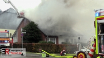 Zwei Atemschutztrupps gingen in das Wohnhaus vor und löschten den Brand im ersten Obergeschoss. Gleichzeitig wurden über die Teleskopbühne von außen Löschmaßnahmen eingeleitet. Zunächst schien das Feuer unter Kontrolle zu sein. Dann allerdings entwickelte sich binnen kurzer Zeit eine starke Rauchentwicklung im Spitzboden des Hauses. Da die Gefahr einer Rauchgasdurchzündung bestand, mussten die Trupps umgehend das Gebäude verlassen. Tatsächlich kam es dann zu der Durchzündung, bei der die Brandgase so stark thermisch aufbereitet waren, dass sie schließlich mit Flammenbildung verbrannten. Dadurch durchschlug das Feuer kurz darauf auch die Dachhaut.
