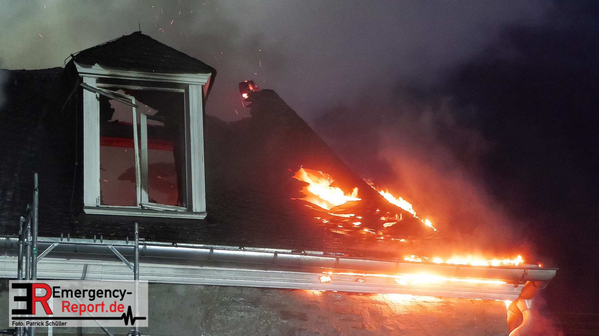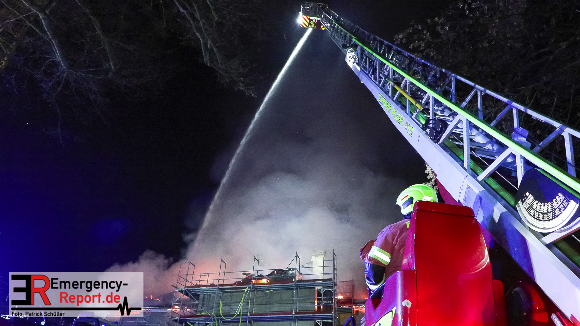 Direkt wurden Löschmaßnahmen über eine Drehleiter sowie ein Innenangriff über den vorderen Bereich des Gebäudes eingeleitet. Aufgrund einer schnellen massiven Ausbreitung des Feuers mussten der Innenangriff kurze Zeit später abgebrochen werden.