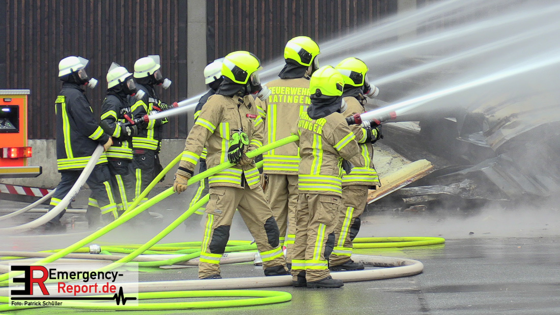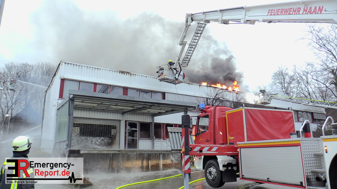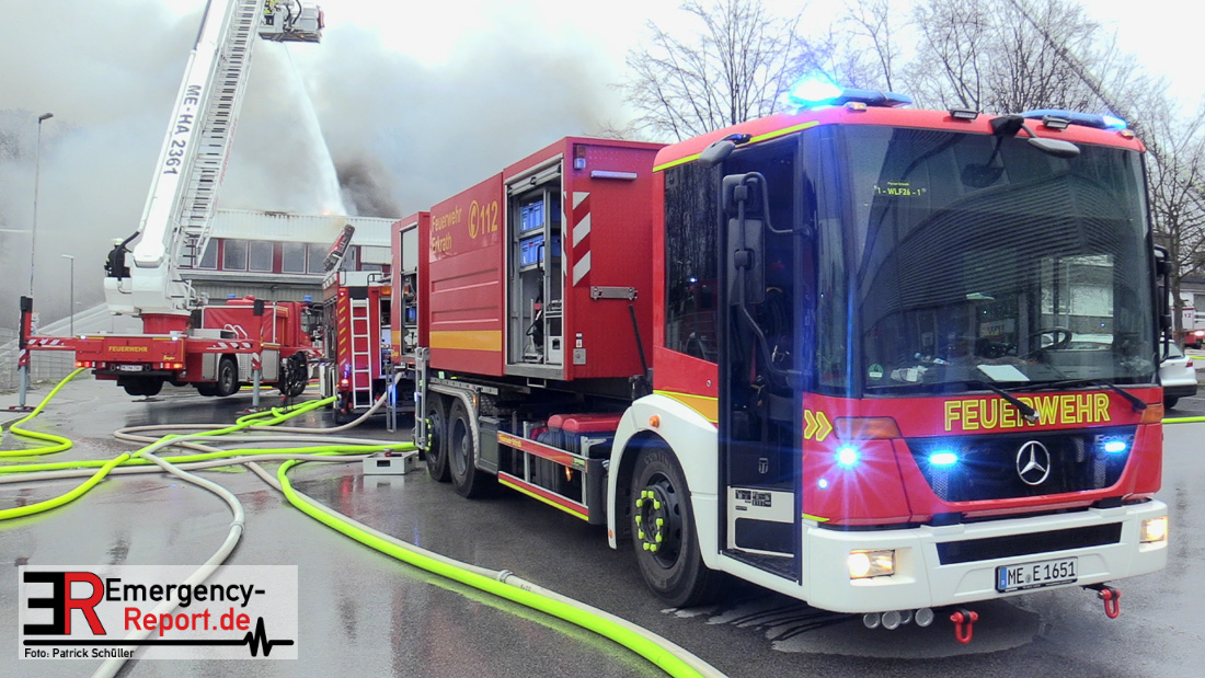 Der Großbrand machte eine umfangreiche überörtliche Hilfe durch die Feuerwehren des Kreises Mettmann erforderlich. Gegen 15:00 Uhr konnte der Brand unter Kontrolle gebracht werden. Die ca. 900 Quadratmeter große Lagerhalle wurde vollständig zerstört. Aufgrund der massiven Rauchentwicklung wurde umgehend die Auslösung der WarnApp NINA zur Warnung der Bevölkerung vor einer Geruchsbelästigung durch einen Brand ausgelöst und zusätzlich wurden Einsatzkräfte nach dem Kreiskonzept Warnen und Messen von allen kreisangehörigen Feuerwehren alarmiert um die Bevölkerung mit Lautsprecherfahrzeugen zu warnen. Umliegende Anwohnerinnen und Anwohner sollen Türen und Fenster unbedingt geschlossen halten. Der benachbarte Discounter und der dazugehörige Parkplatz mussten geräumt werden.