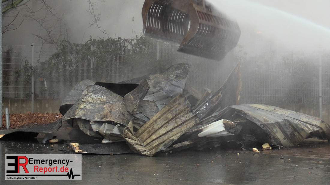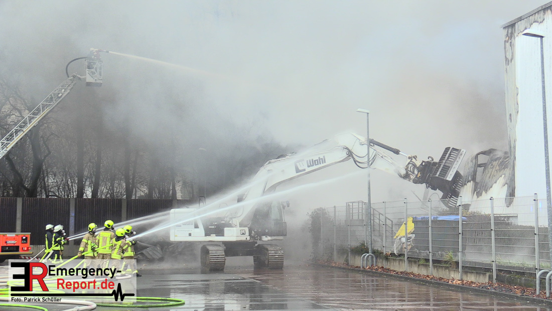 Der Feuerwehreinsatz nach dem Lagerhallenbrand auf der Röntgenstraße konnte mit Abschluss der Nachlöscharbeiten am 22.12.2020 nach ca. 26 Stunden gegen 14 Uhr beendet werden. Zum Abschluss mussten unter der eingestürzten Deckenkonstruktion der Halle noch viele Glutnester, die nicht direkt erreicht werden konnten mit Schaum abgedeckt werden, um den Brandherd vom Luftsauerstoff zu trennen. Um besser an die Glutnester zu gelangen mussten unter Zuhilfenahme von zwei Baggern eines Abrissunternehmens Trümmerteile der Lagerhalle beseitigt werden.