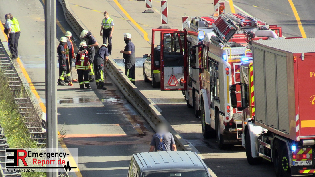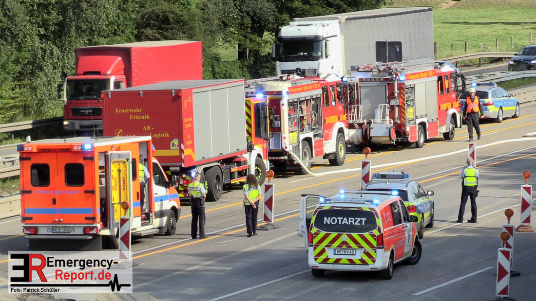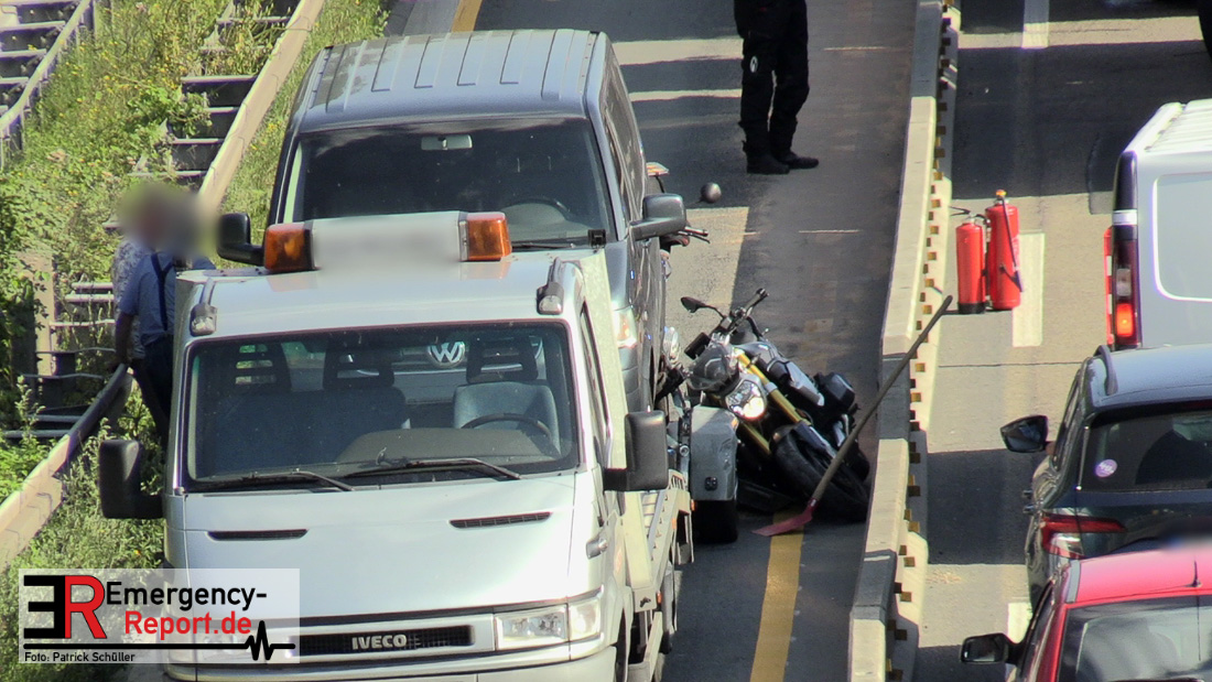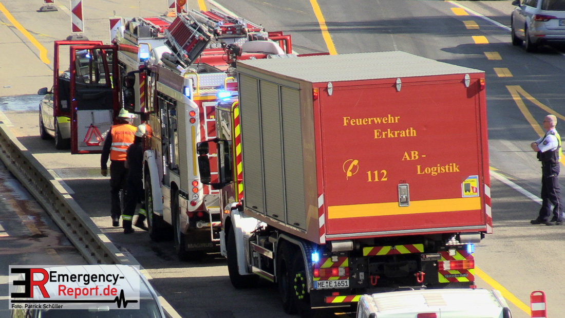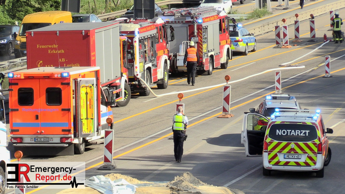 Ein niederländischer Motorradfahrer geriet mit seinem Krad zwischen einem Fahrzeug mit Anhänger und der baustellenbedingten Mittelstreifenbegrenzung und wurde mehrere Meter mitgeschliffen. Der Kradfahrer wurde schwer verletzt aber nicht eingeklemmt. Nach der Erstversorgung vor Ort wurde er mit einem Rettungswagen in ein Krankenhaus transportiert. Durch die Feuerwehr Erkrath wurden größere Mengen Betriebsstoffe abgebunden und aufgenommen. Die Berufsfeuerwehr Solingen musste nicht mehr tätig werden.