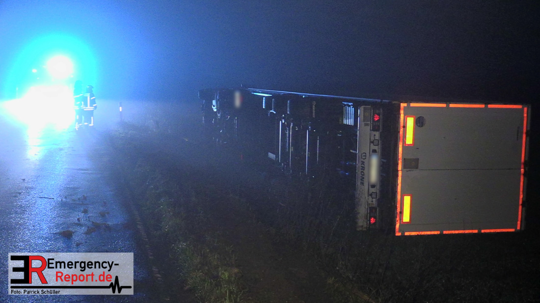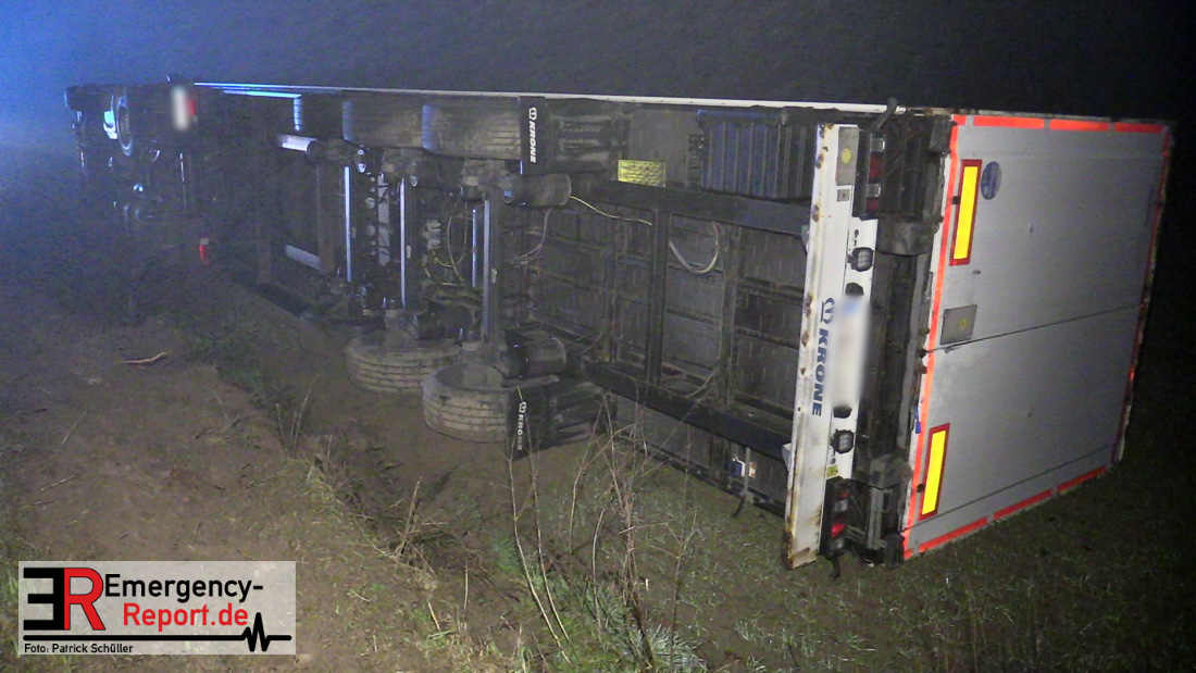 Gegen 2:30 Uhr war ein 44-jähriger Mann aus Osteuropa mit seinem Lkw über die Mettmanner Straße gefahren, als er im Bereich der Bushaltestelle „Schule Nußbaum“ ohne Fremdeinwirkung die Kontrolle über seine Sattelzugmaschine verlor und damit samt Anhänger von der Straße abkam. Hierbei kippte das Gespann auf die rechte Seite und landete etwa zwei Meter unterhalb der Straßenkante seitlich auf einem Feld.
